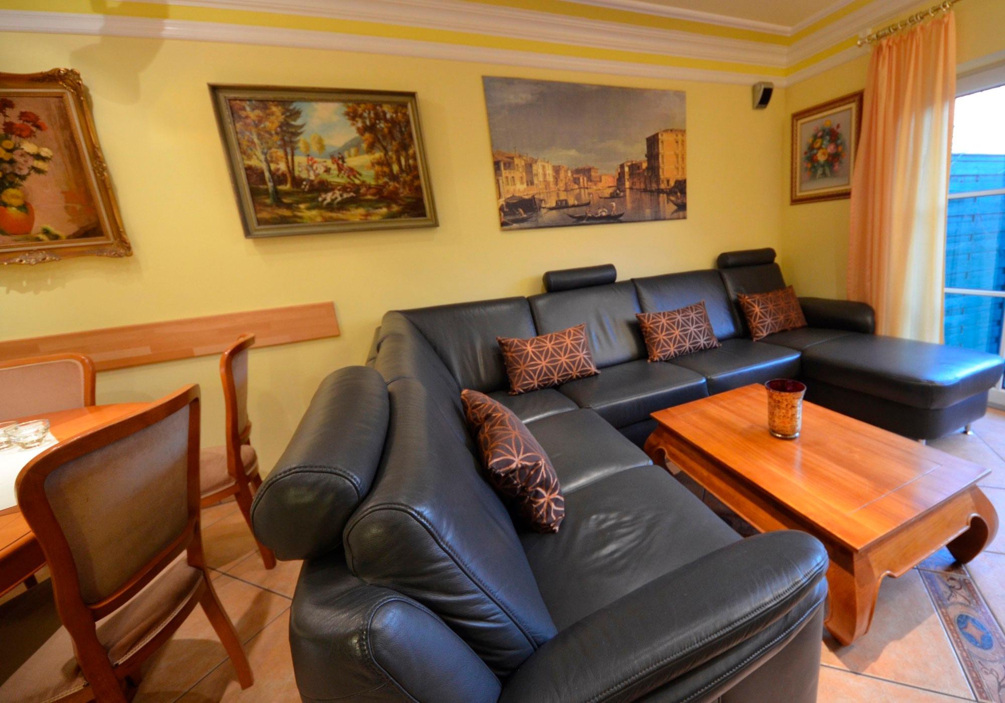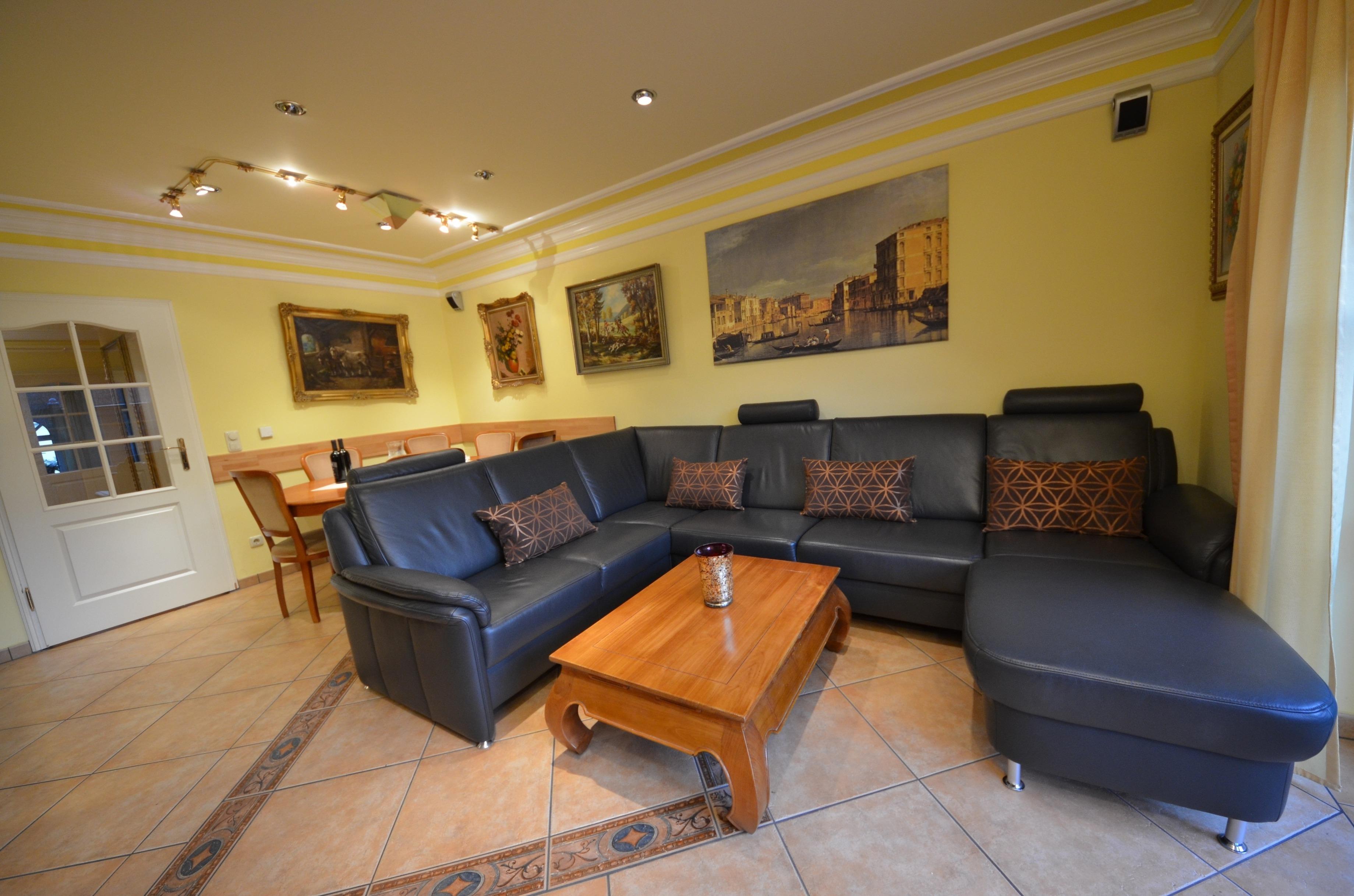 Wohn- Esszimmer mit Ausgang zur Terrasse mit Gartenmöbeln, schöne Couch-Garnitur und Opiumtisch, Telefon, 120er - Flachbild - TV, Stereo / CD, Speisetafel mit 8 Stühlen, Geschirrschrank. Landhaus-Einbauküche in arktisgelb mit Mikrowelle, Geschirrspülmaschine, 1 Abstellraum mit Waschmaschine und großem elektronischen Wäschetrockner, 1 Bad mit Dusche aus Naturstein/Granit mit Fön und Schminkspiegel.