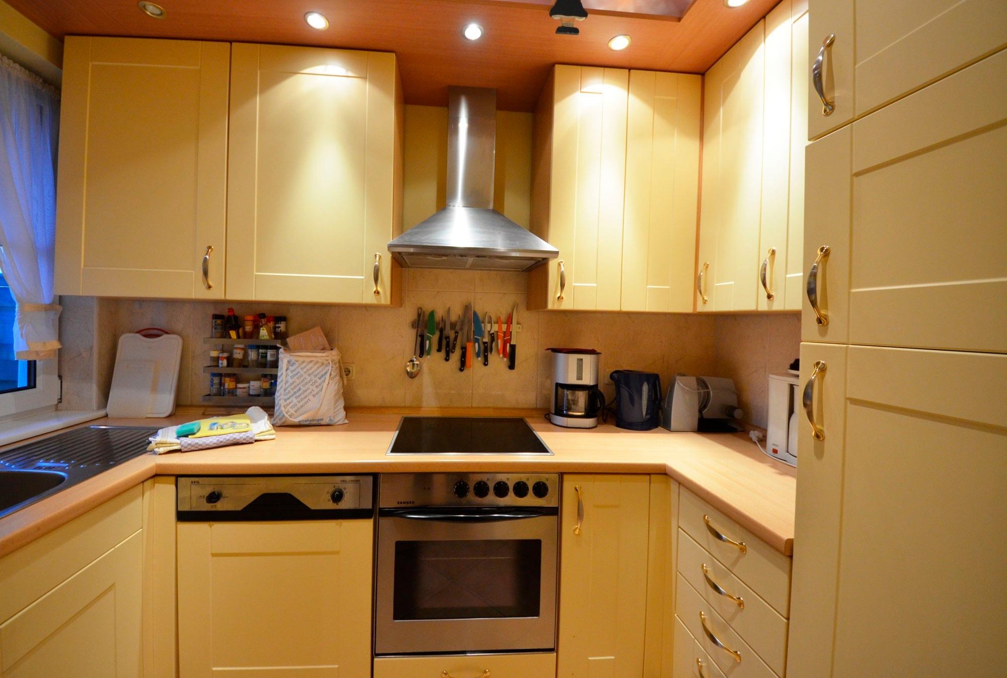 Fußbodenheizung, moderne Einbauküche in arktisgelb, Geschirrspüler, Mikrowelle, Herd mit Ceran -Kochfeld und Backofen, Kühlschrank mit Gefrierteil,Turmhaube, 2 Kaffeemaschinen, Wasserkocher, Eierkocher, Toaster, Waffeleisen, Mixer, ausreichend Edelstahl - Töpfe Schnellkochtopf Gewürze usw.