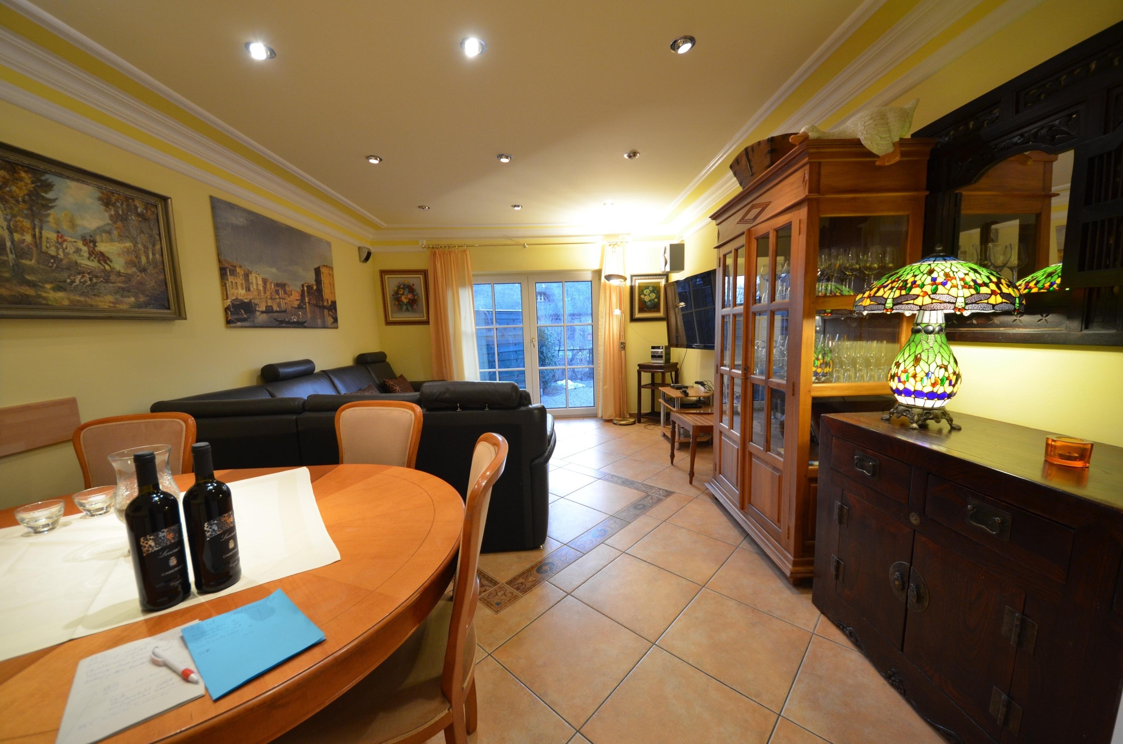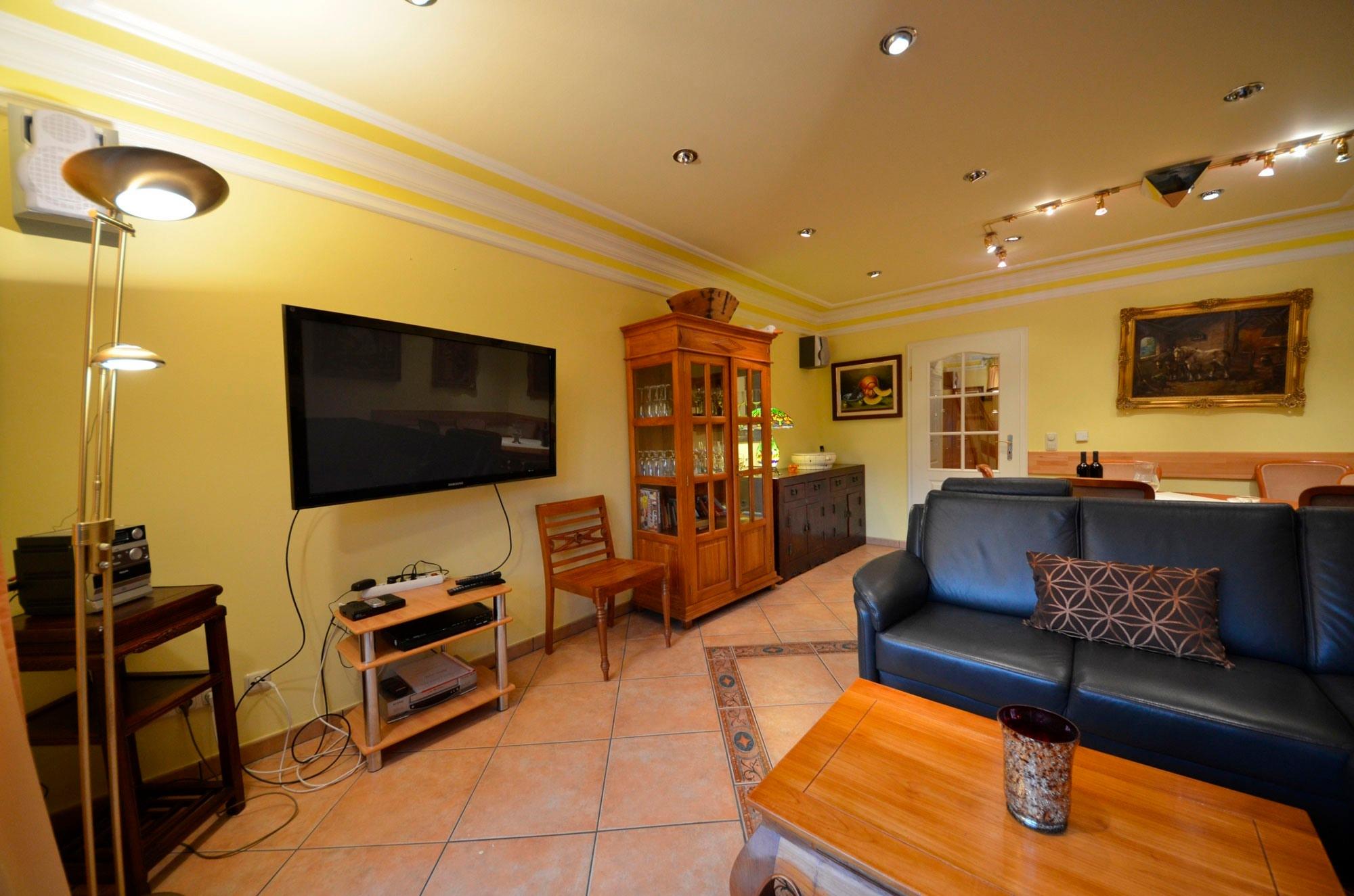 Fußbodenheizung, schöne Couch-Garnitur mit Opiumtisch, Esstisch m. 8 Stühlen, Geschirrschrank, Sat - TV mit ca. 40 Programmen, Video -Recorder, Stereoanlage, CD - Player, Telefontisch mit Telefon und balinesischem Spiegel pp. Kinderhochstuhl, Wände dekoriert mit Bildern, dekorative Beleuchtung, Terrasse mit Gartenmöbeln.