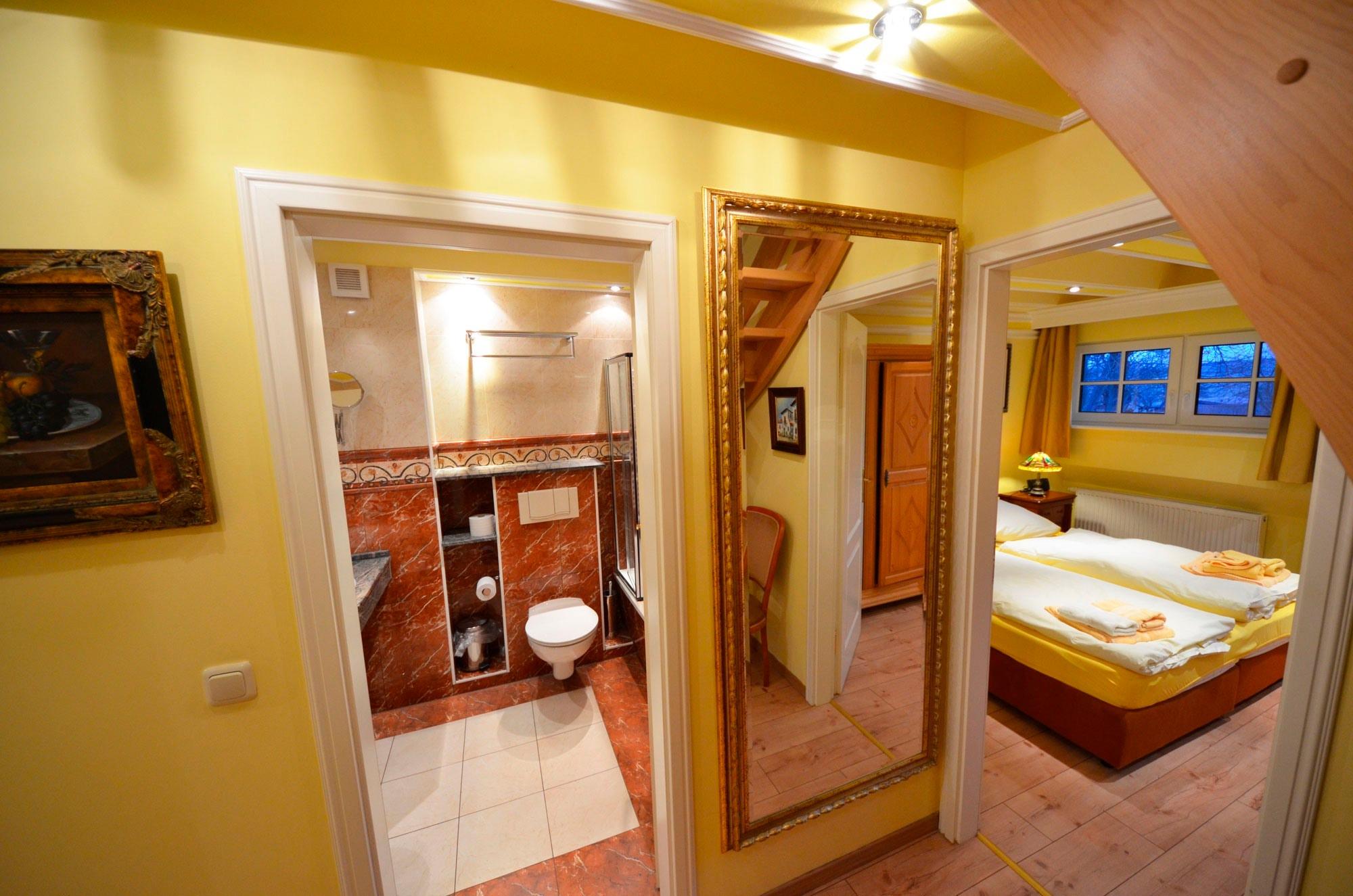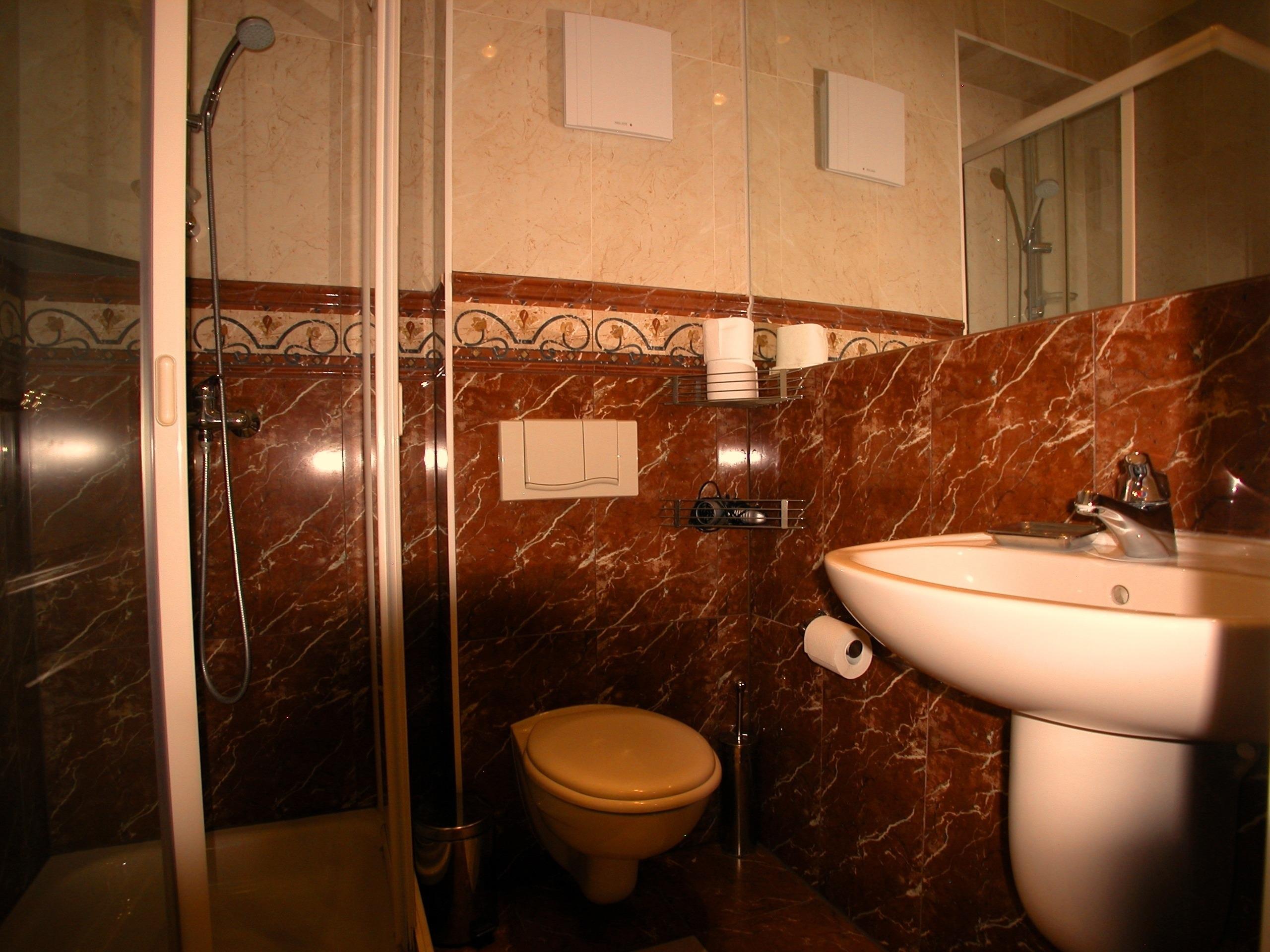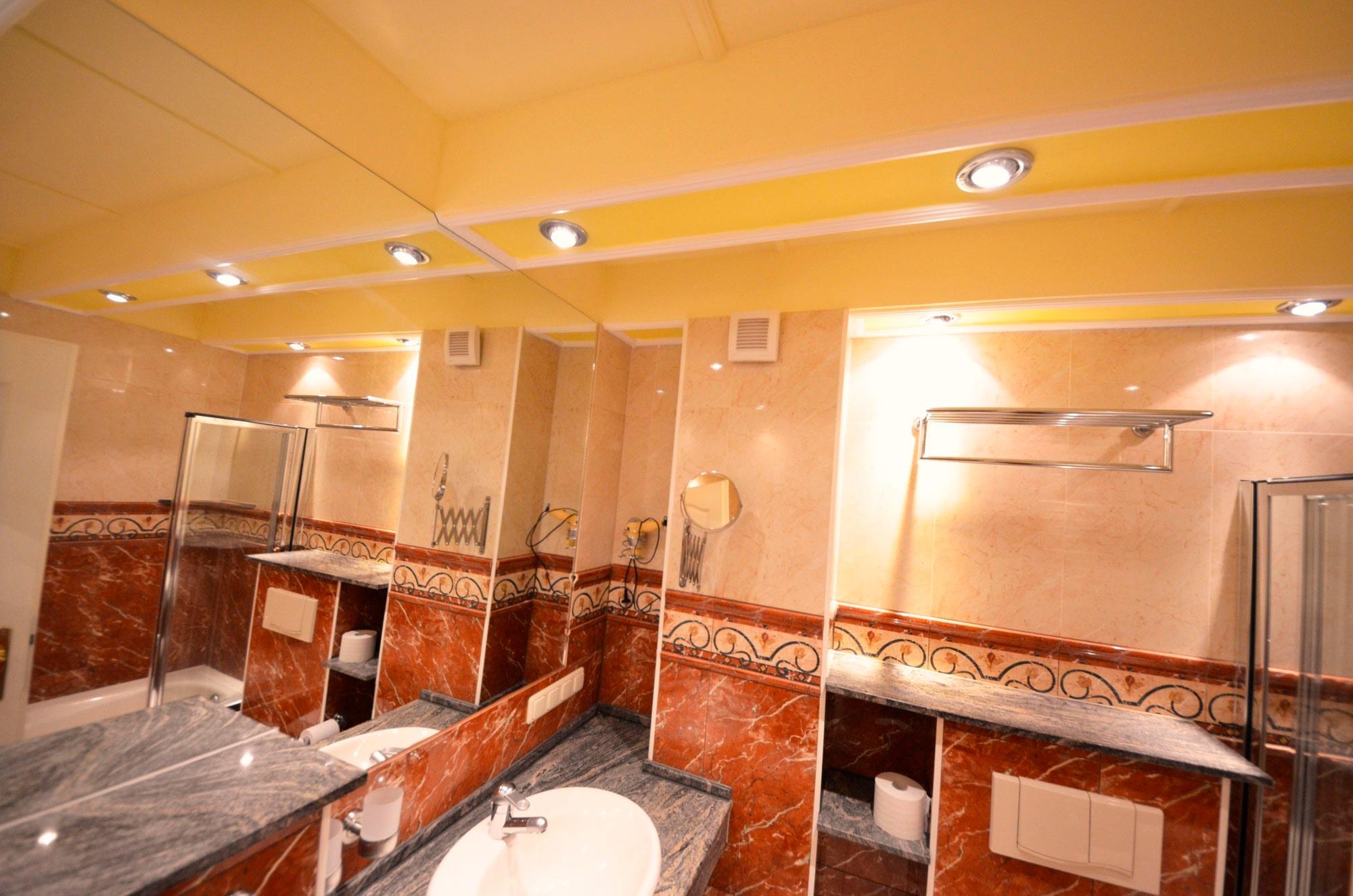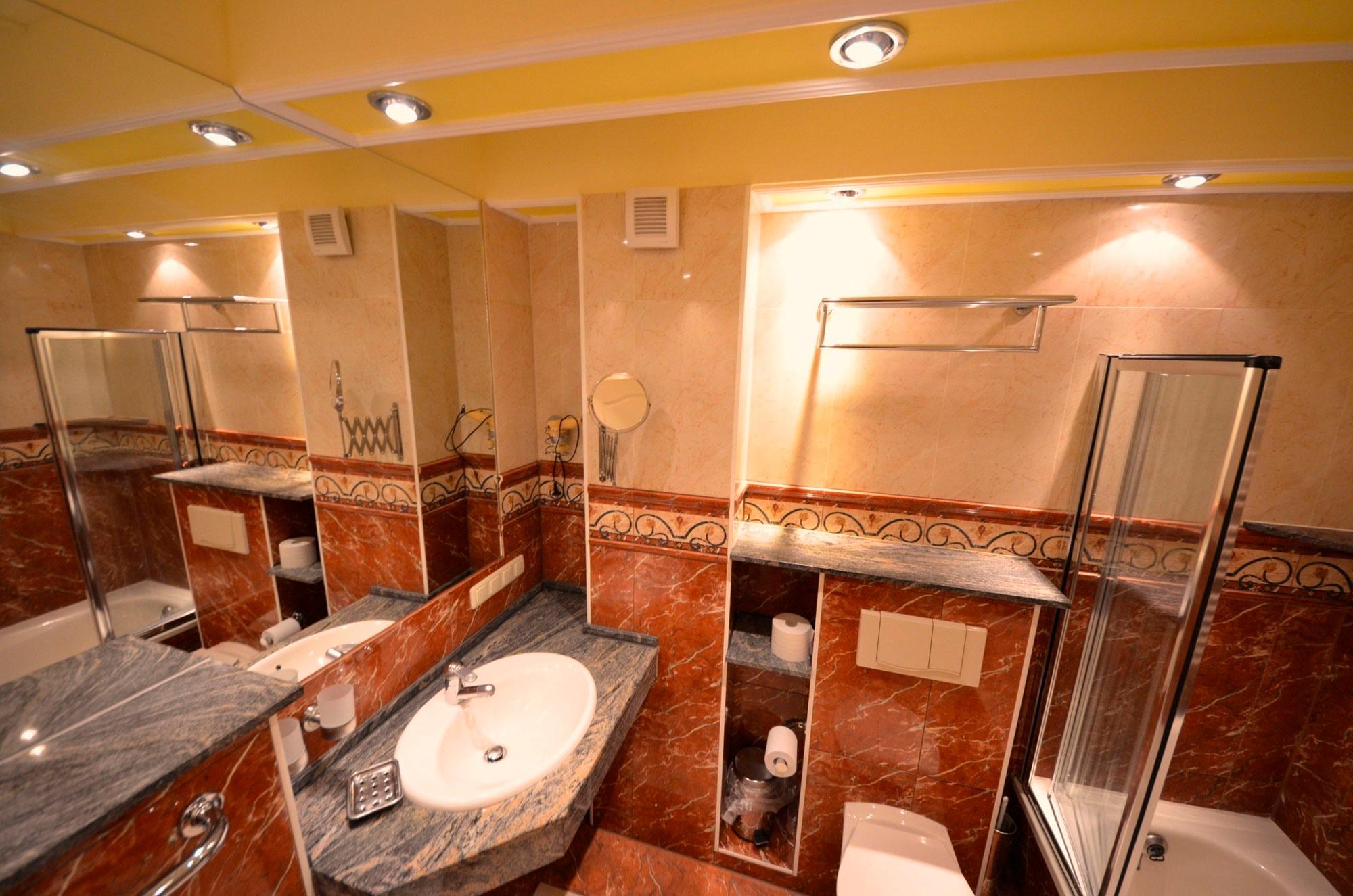 Fußbodenheizung, Dusche in der Wanne mit Dusch - Glastrennwand, Naturstein - Abdeckungen, große Spiegel, schöne Sanitärausstattung, Toilette und Bidet, Einbau-Waschbecken mit Granit - Abdeckungen, beheizbarer Handtuchhalter, Fön, Schminkspiegel