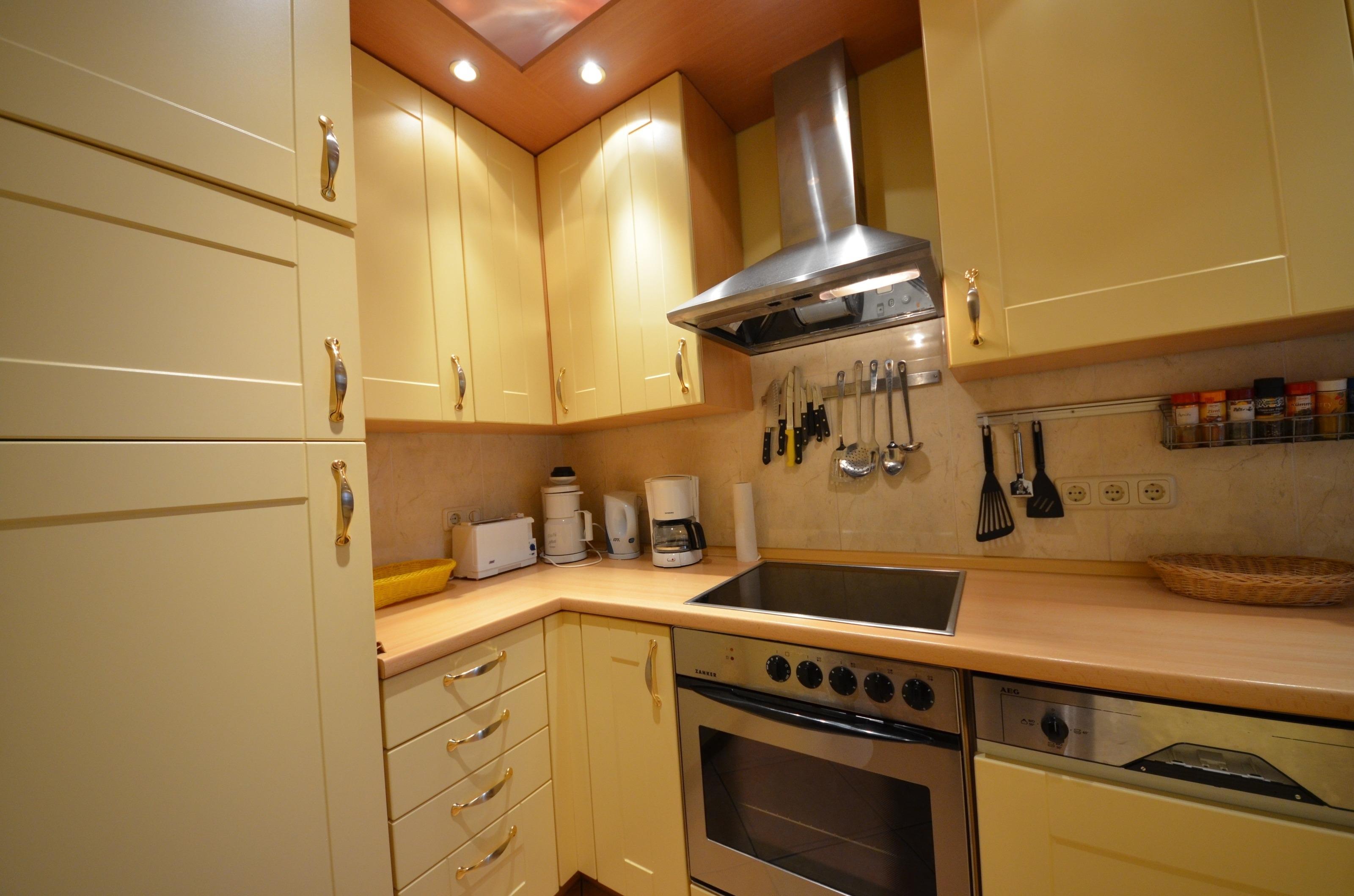 Fußbodenheizung, schöne moderne Einbauküche in arktisgelb, Geschirrspüler höher gelegt, Mikrowelle, Herd mit Ceran-Kochfeld und Backofen, Kühlschrank mit Gefrierteil, Turmhaube, 2 Kaffeemaschinen, Wasserkocher, Eierkocher, Toaster, Waffeleisen, Mixer, ausreichend Edelstahl-Töpfe Schnellkochtopf Gewürze usw.