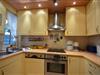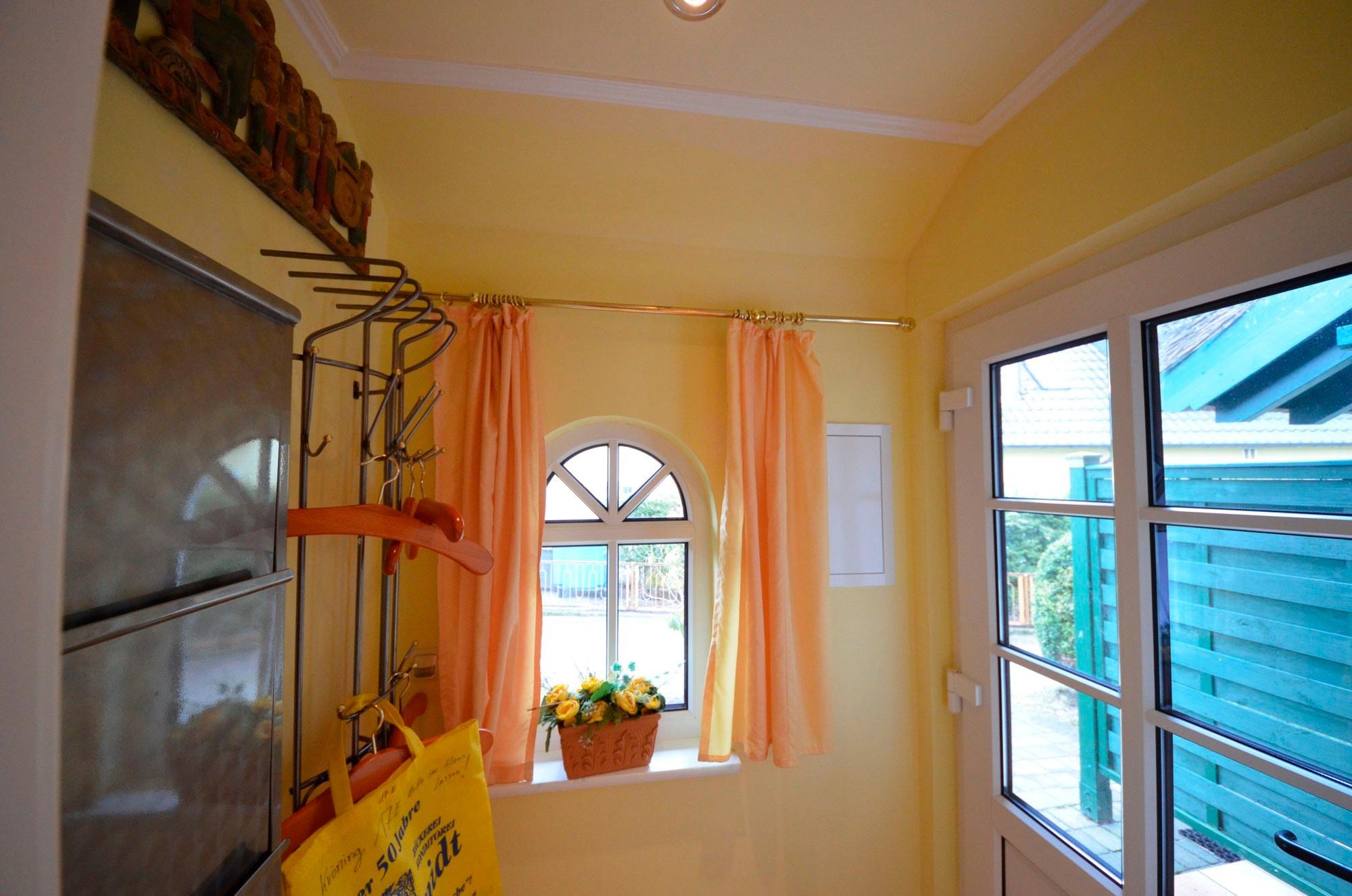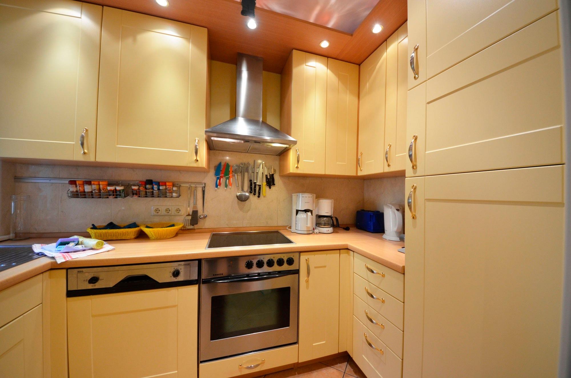 Fußbodenheizung, moderne Einbauküche in arktisgelb, Geschirrspüler, Mikrowelle, Herd mit Ceran -Kochfeld und Backofen, Kühlschrank mit Gefrierteil, Turmhaube, 2 Kaffeemaschinen, Wasserkocher, Eierkocher, Toaster, Waffeleisen, Mixer, ausreichend Edelstahltöpfe Schnellkochtopf Gewürze usw.