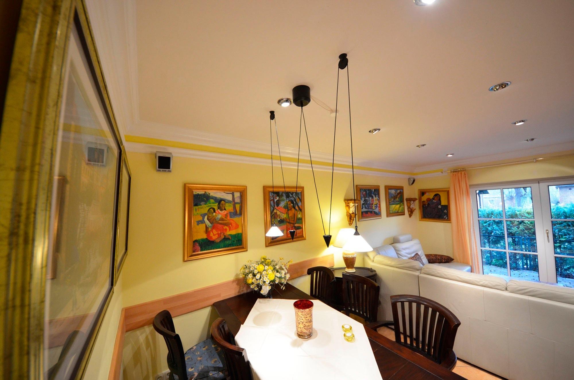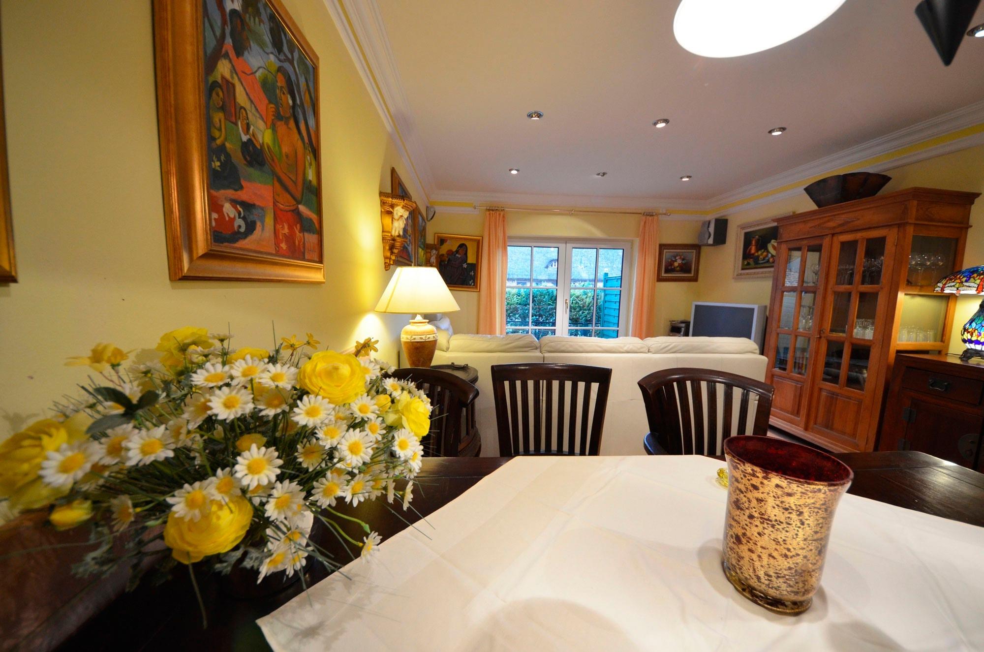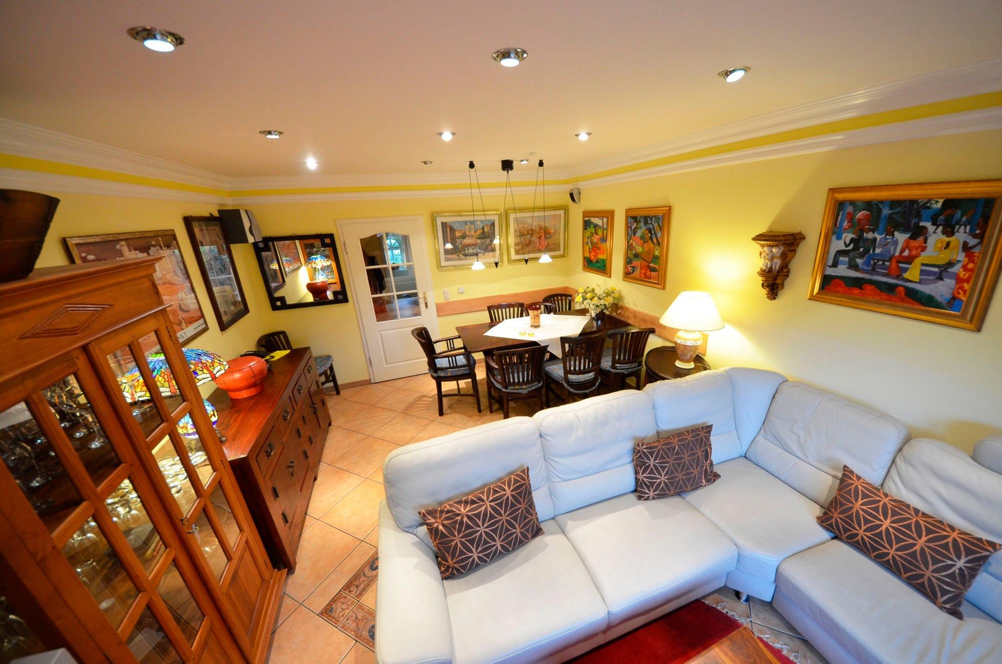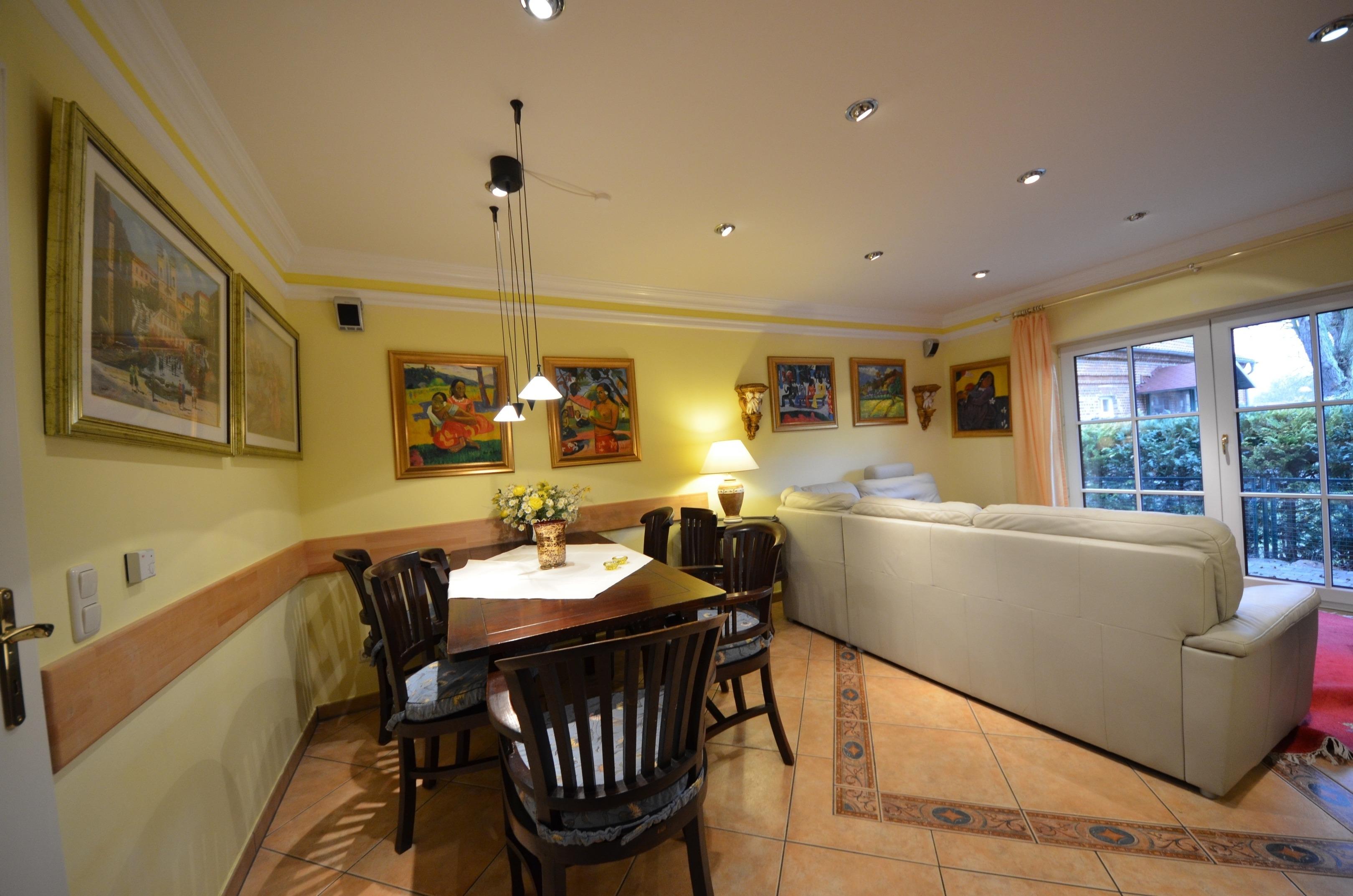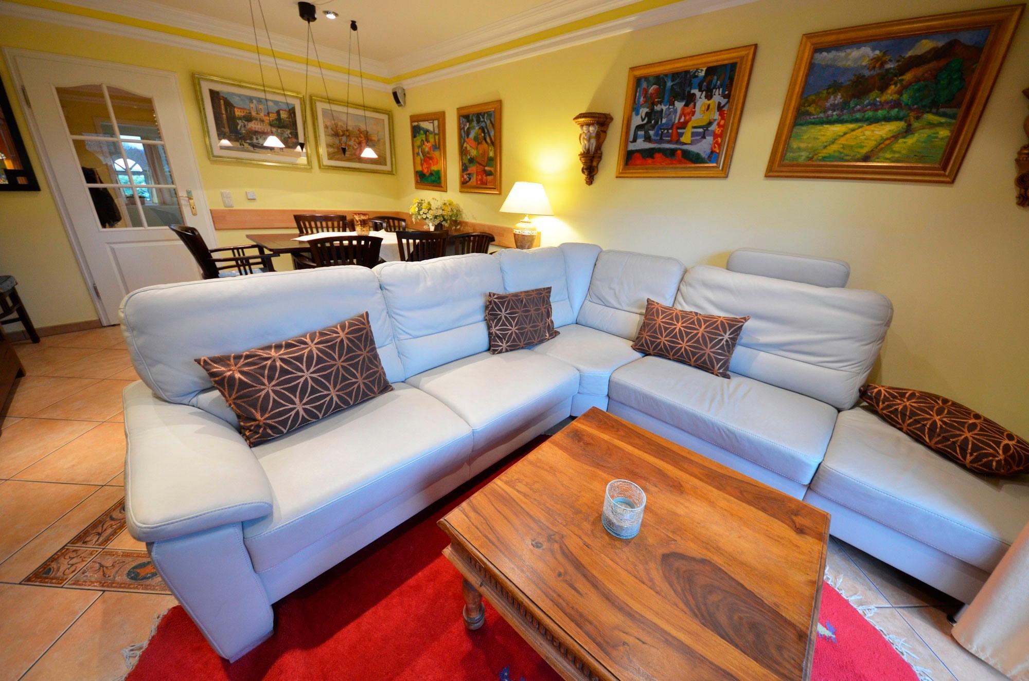 Fußbodenheizung, schöne Couch-Garnitur mit Opiumtisch, Esstisch m. 8 Stühlen, Geschirrschrank, Sat - TV mit ca. 40 Programmen, Video -Recorder, Stereoanlage, CD - Player, Telefontisch mit Telefon und balinesischem Spiegel pp. Kinderhochstuhl, Wände dekoriert mit Bildern, dekorative