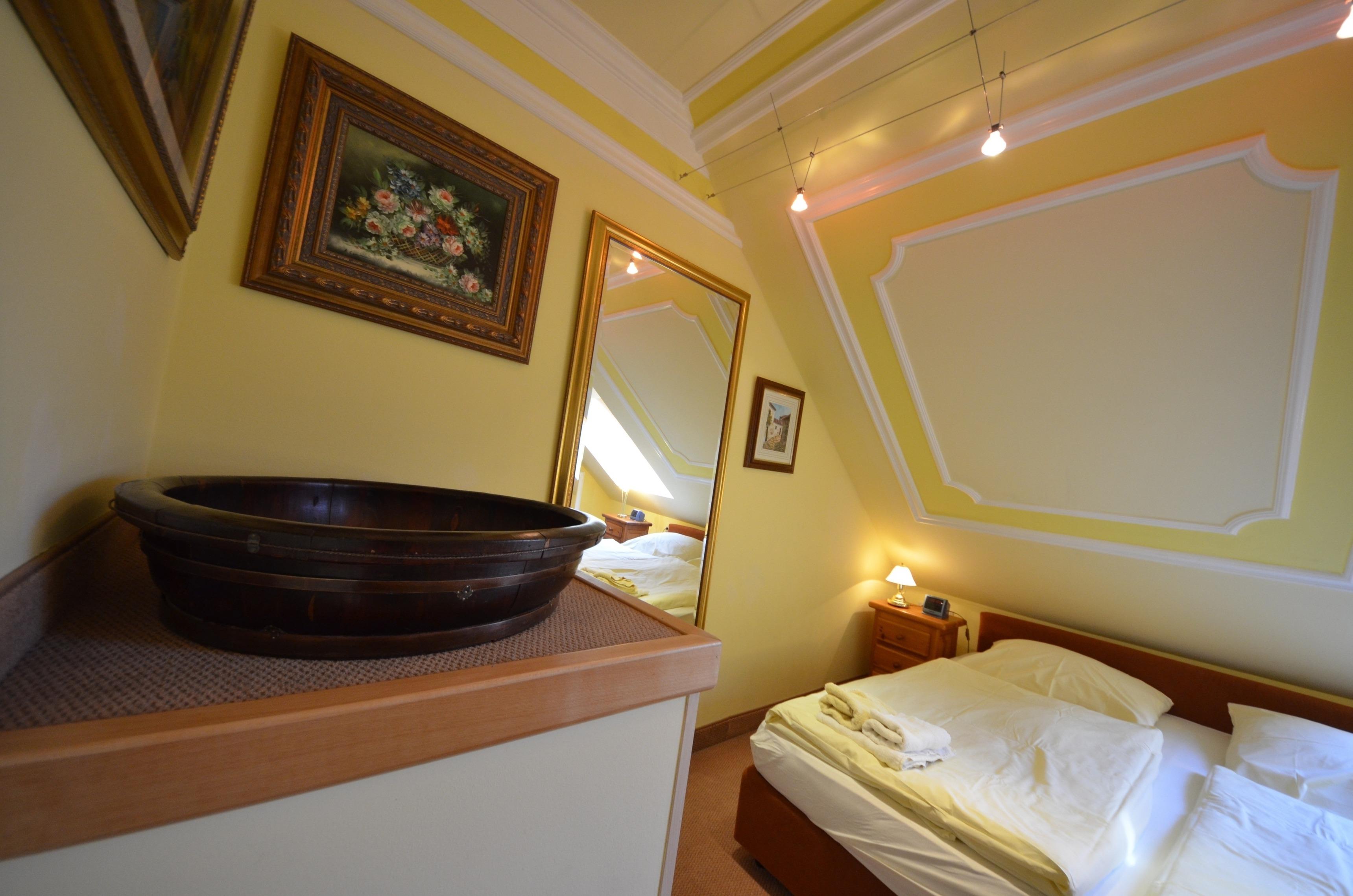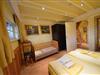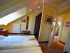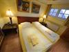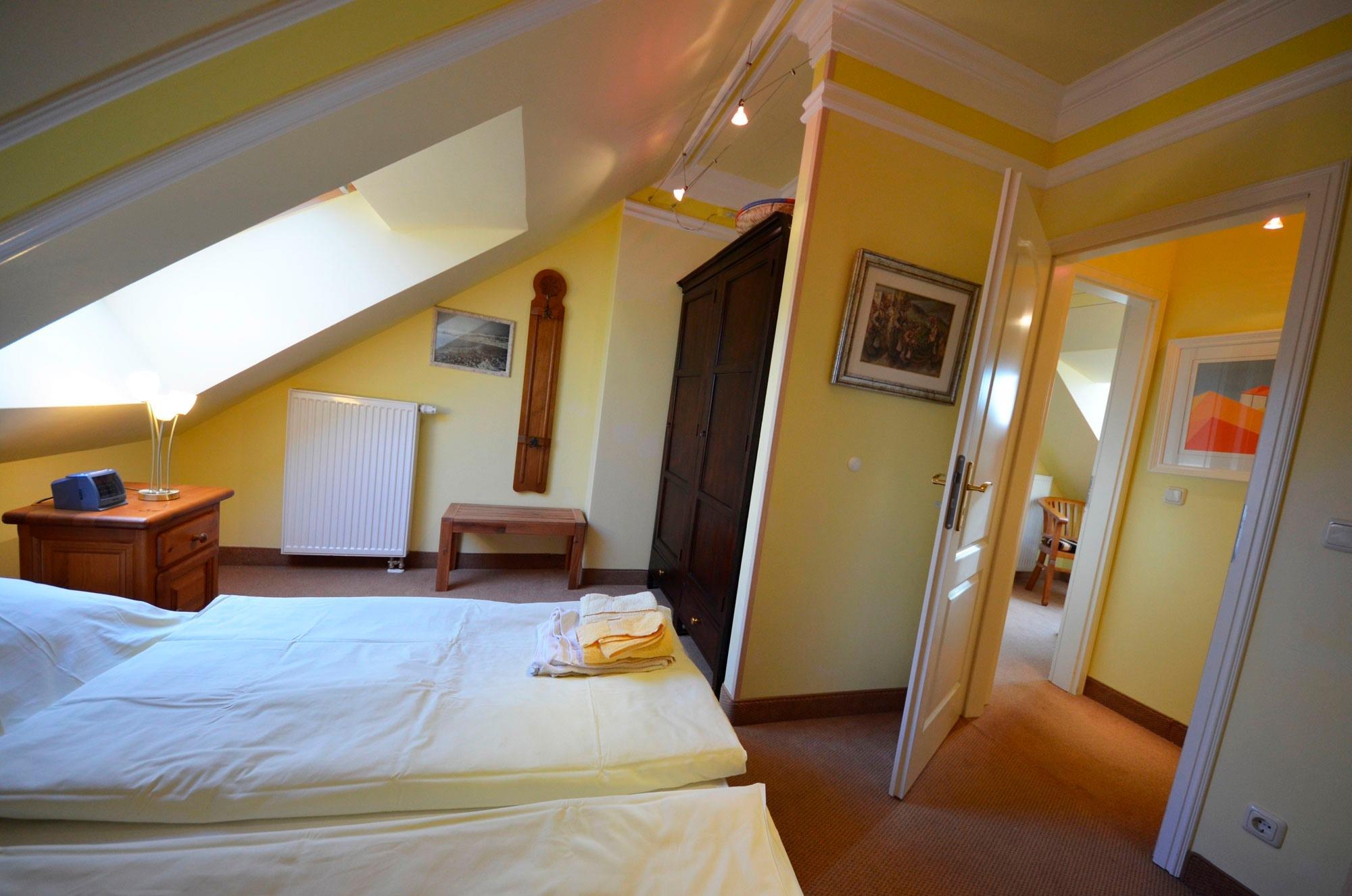 Doppelbett 180 x 200 und zwei Einzelbetten 90 x 200, Radiowecker, mit Bildern dekoriert, aufgezogene Bettwäsche.