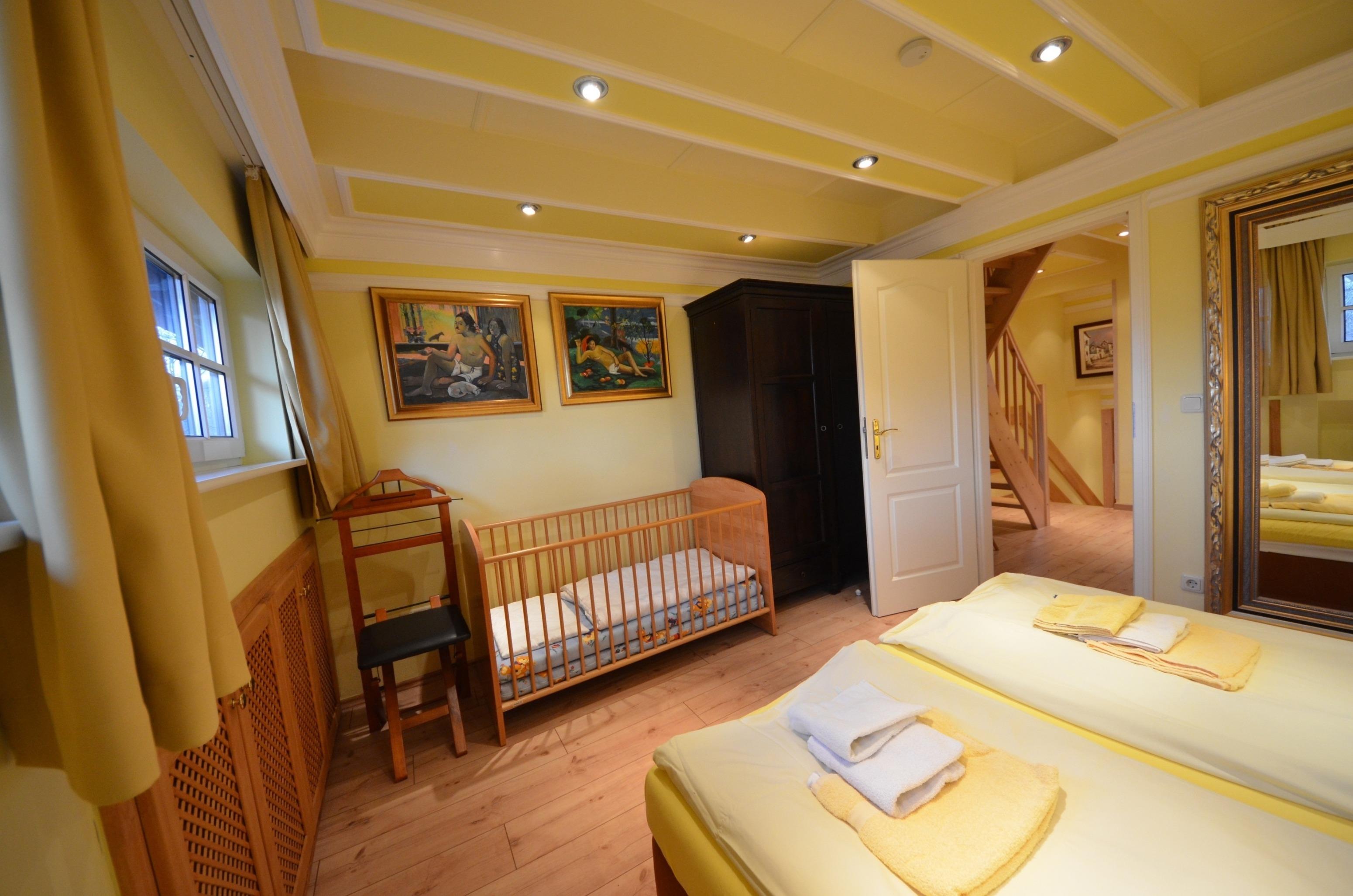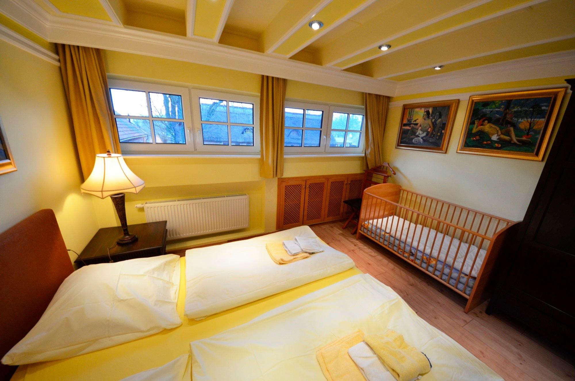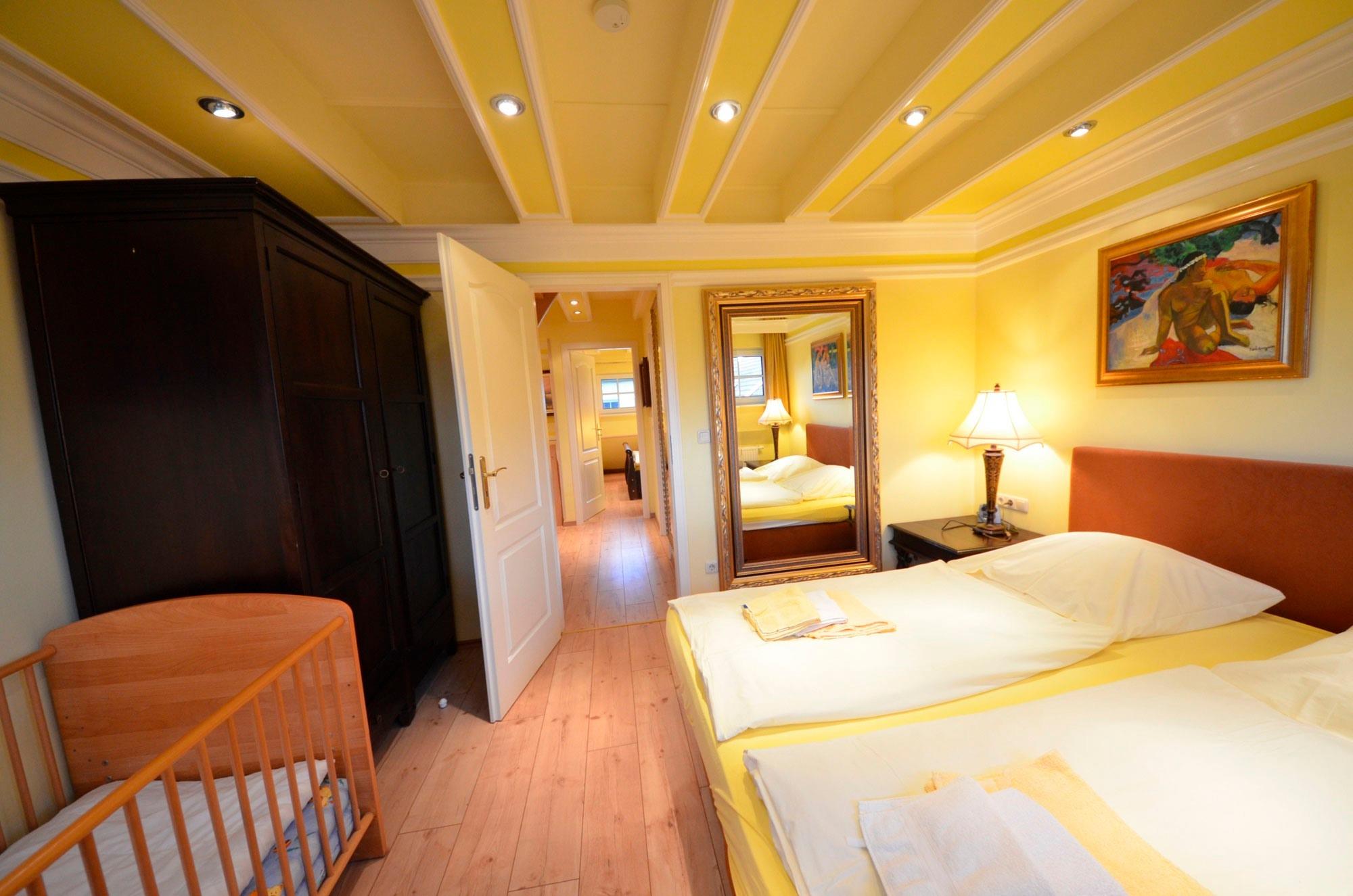 Doppelbetten jeweils 160 x 200 und 180 x 200, aufgezogene Bettwäsche. Radiowecker, mit Bildern dekoriert. Große Ganzkörperspiegel. In einem Schlafzimmer ein Babybett 70 x 140 (kostenlos) aufgezogene Bettwäsche.