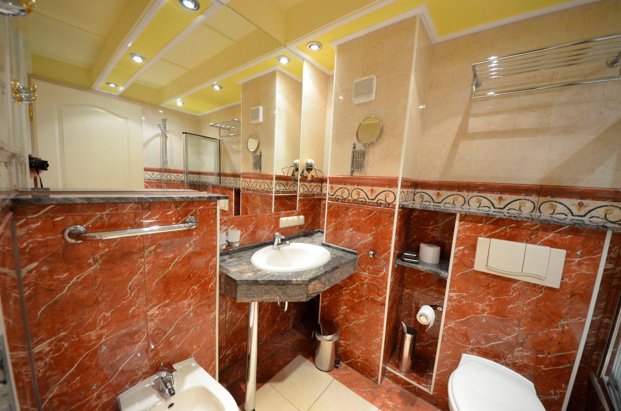 Fußbodenheizung, Dusche in der Wanne mit Dusch - Glastrennwand, Naturstein - Abdeckungen, große Spiegel, schöne Sanitärausstattung, Toilette und Bidet, Einbauwaschbecken mit Granit-Abdeckungen, beheizbarer Handtuchhalter, Fön, Schminkspiegel,