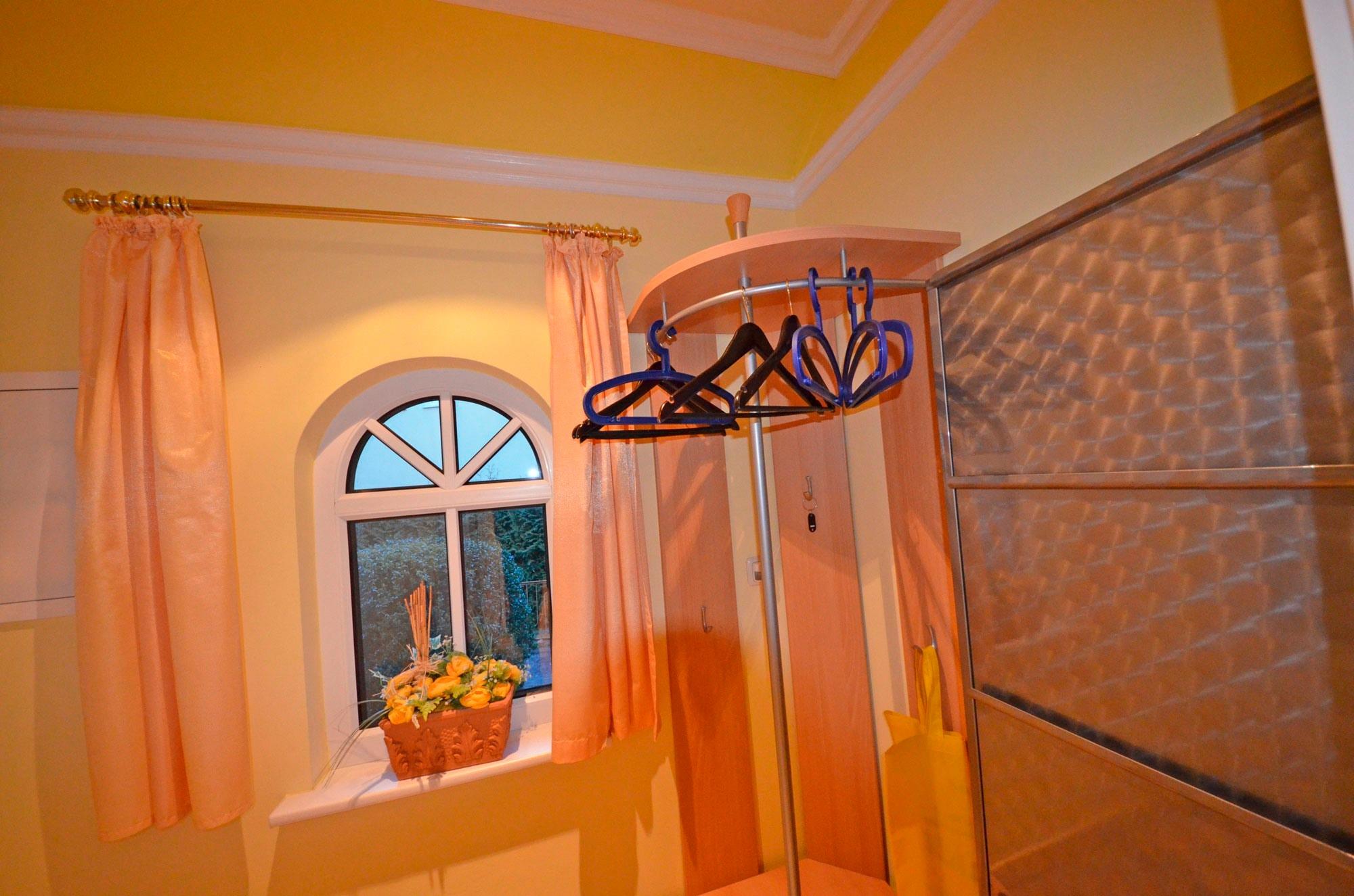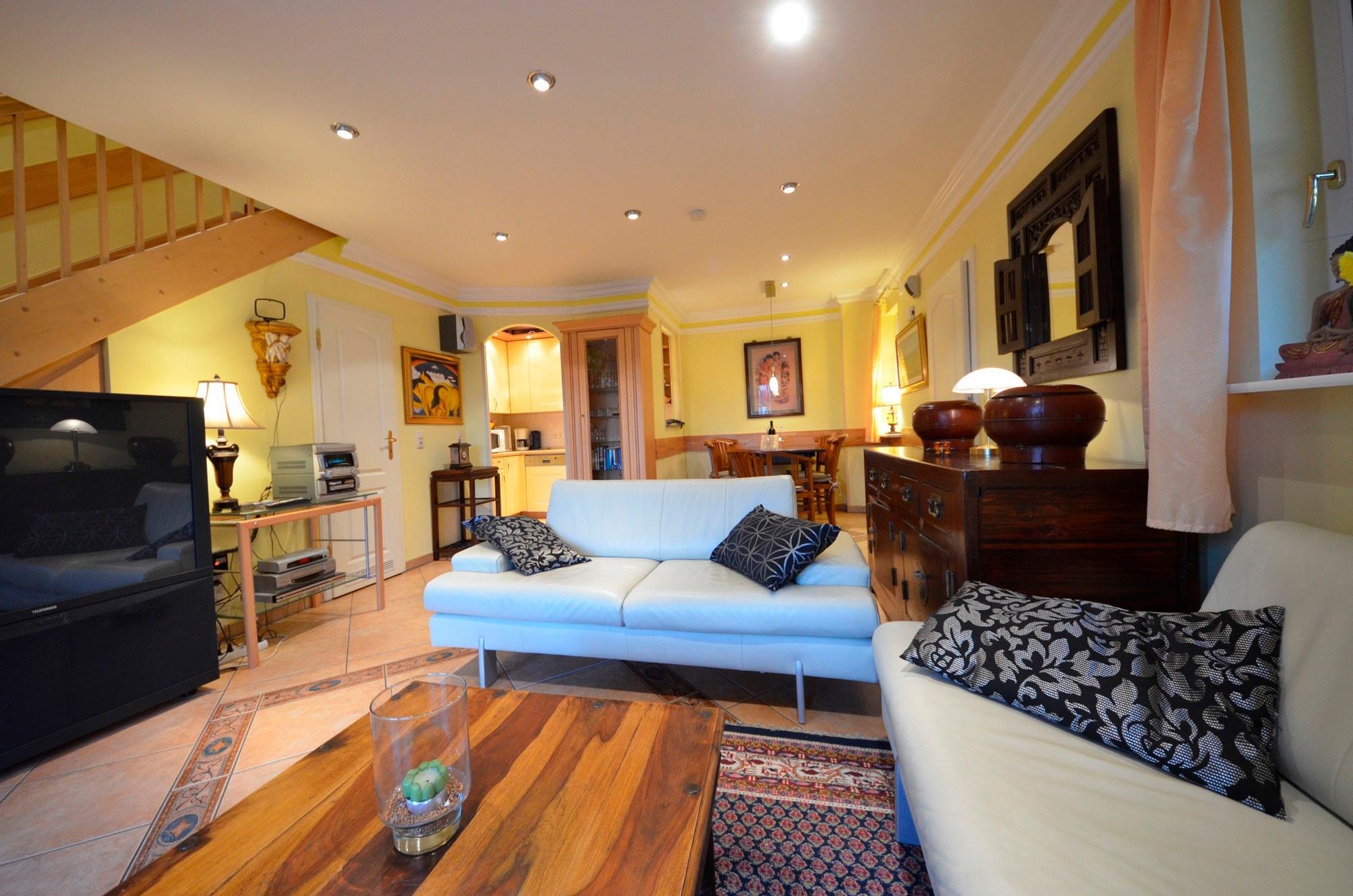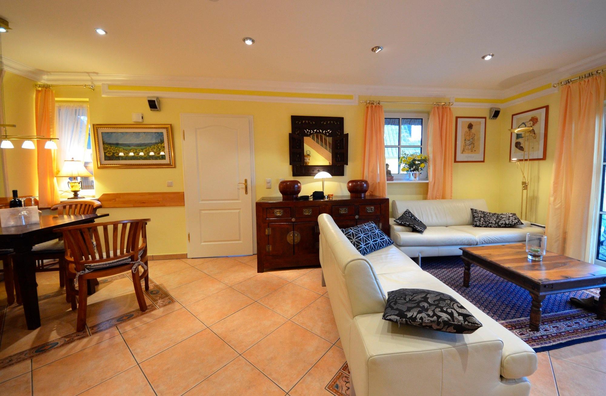 Eingangsflur mit Garderobe und Schuhschrank, Fußbodenheizung, großzügiges Wohn- Esszimmer, schöne Couchgarnitur mit Opiumtisch, Esstisch mit 5 Stühlen, Geschirrschrank, Satt - TV mit 82-106 cm! Großbild mit ca.40 Programmen, Stereoanlage, CD - Player, Telefontisch mit Telefon und balinesischem Spiegel pp.