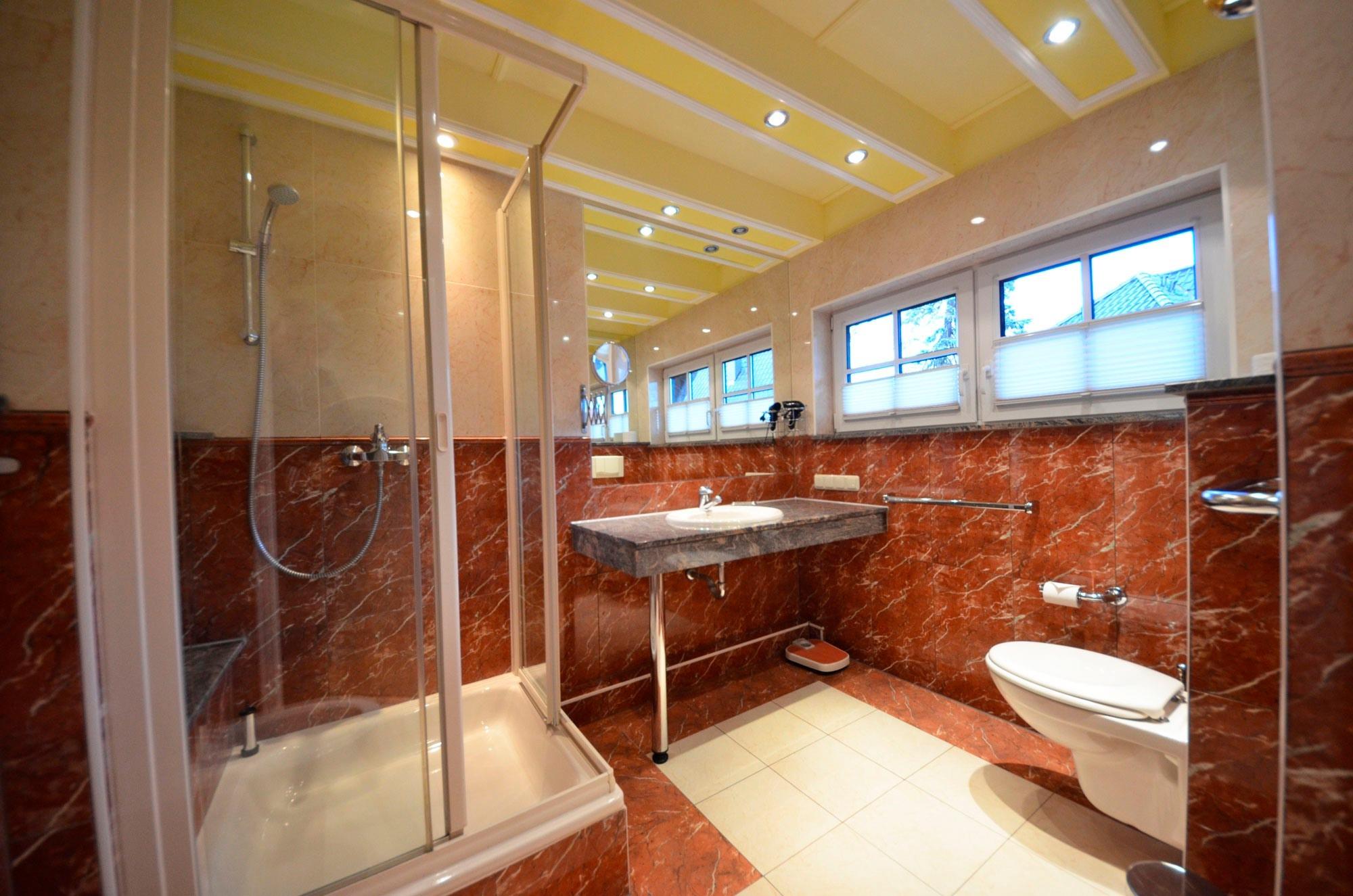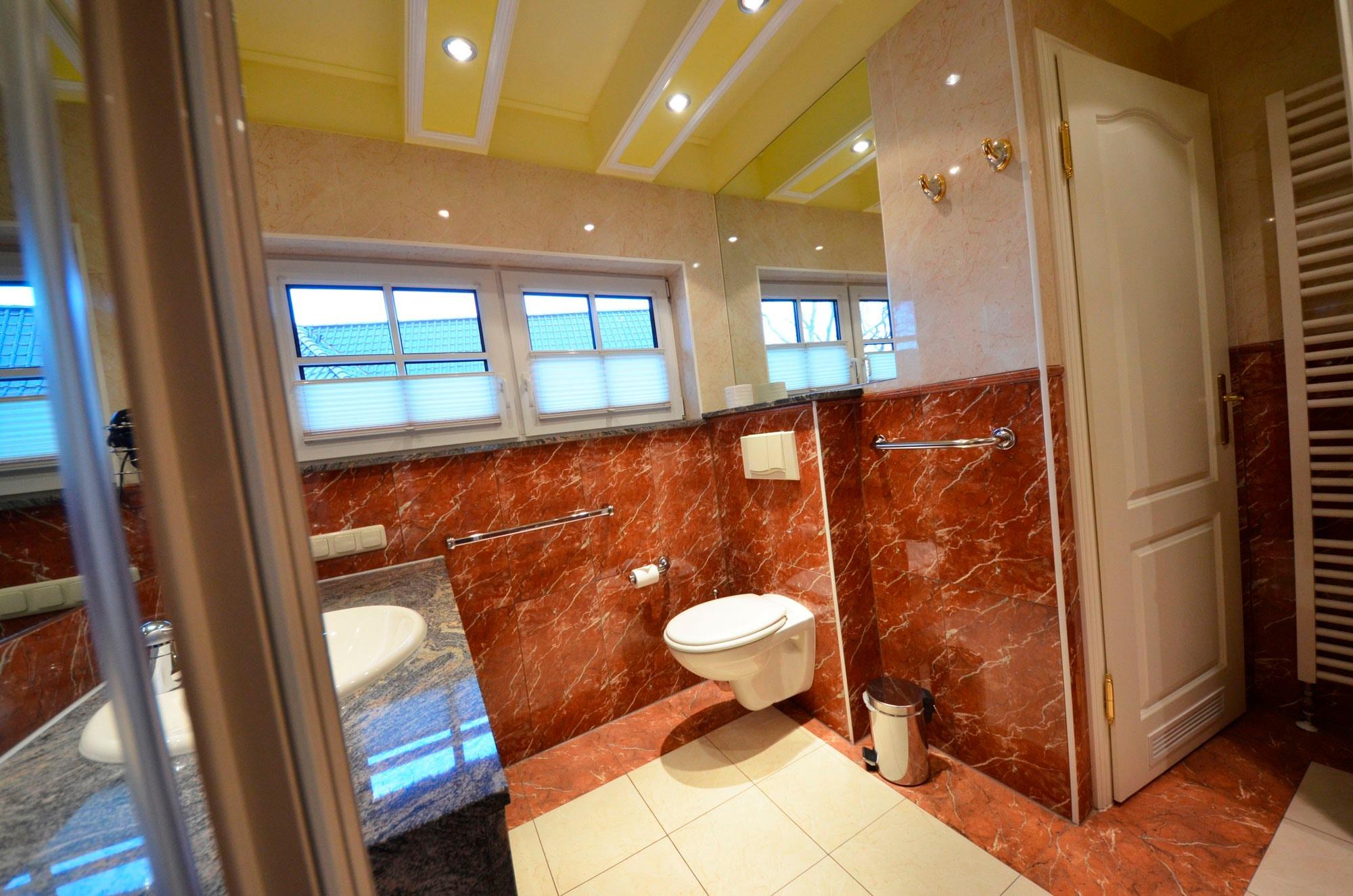 Fußbodenheizung, Naturstein - Abdeckungen, große Spiegel, schöne Sanitärausstattung, Einbau-Waschbecken mit Granit - Abdeckungen, beheizbarer Handtuchhalter, Glas -Dusche mit Sitzmöglichkeit, Bidet, Fön, Schminkspiegel,