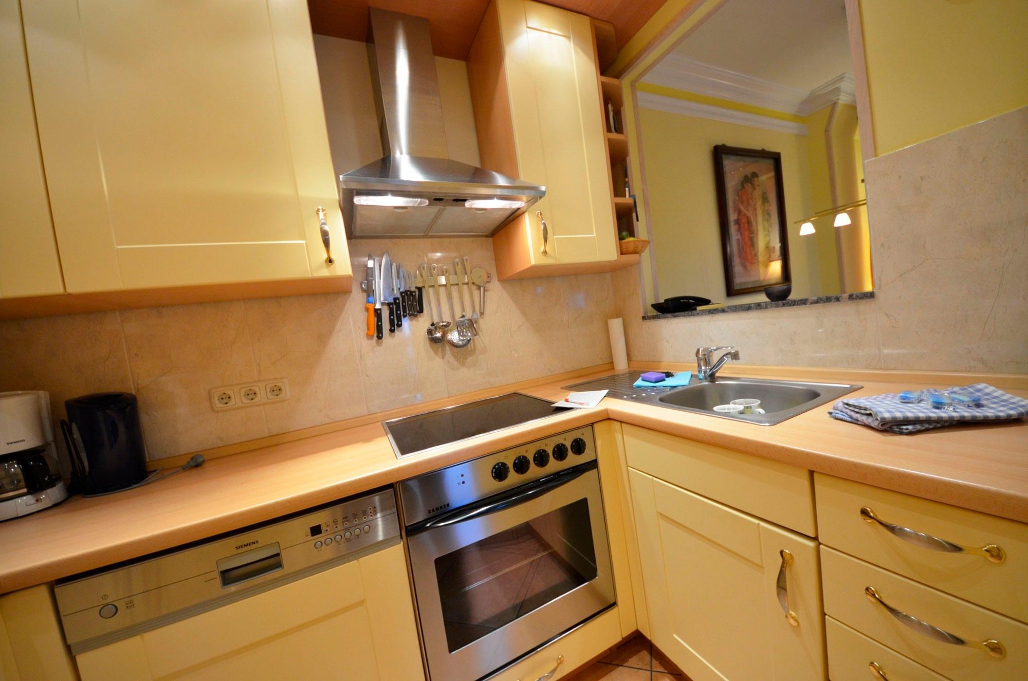 Schöne vanillefarbene Landhaus-Einbauküche, Geschirrspüler, Mikrowelle, Herd mit Ceran - Kochfeld und Backofen, Turmhaube, Kühlschrank mit Gefrierfach, 2 Kaffeemaschinen, Wasserkocher, Eierkocher, Toaster, Waffeleisen, Mixer, Schnellkochtopf, geschmackvolles Geschirr. Teilweise Gewürze und Geschirrtücher.