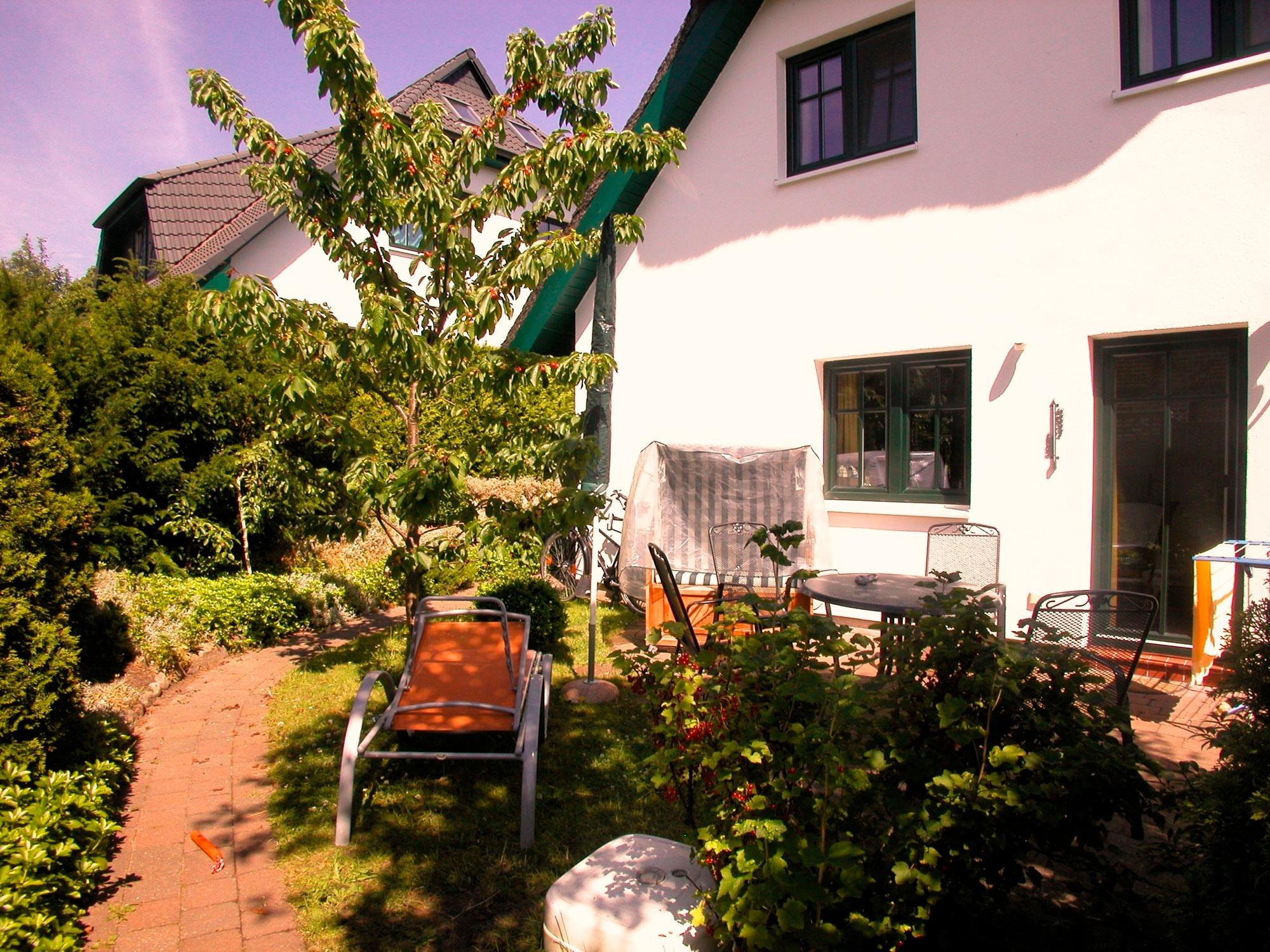 Das Haus verfügt über einen kleinen schön eingewachsenen Gartenteil mit Kirschbaum, Terrasse und Gartenmöbel sowie Doppelstrandkorb.