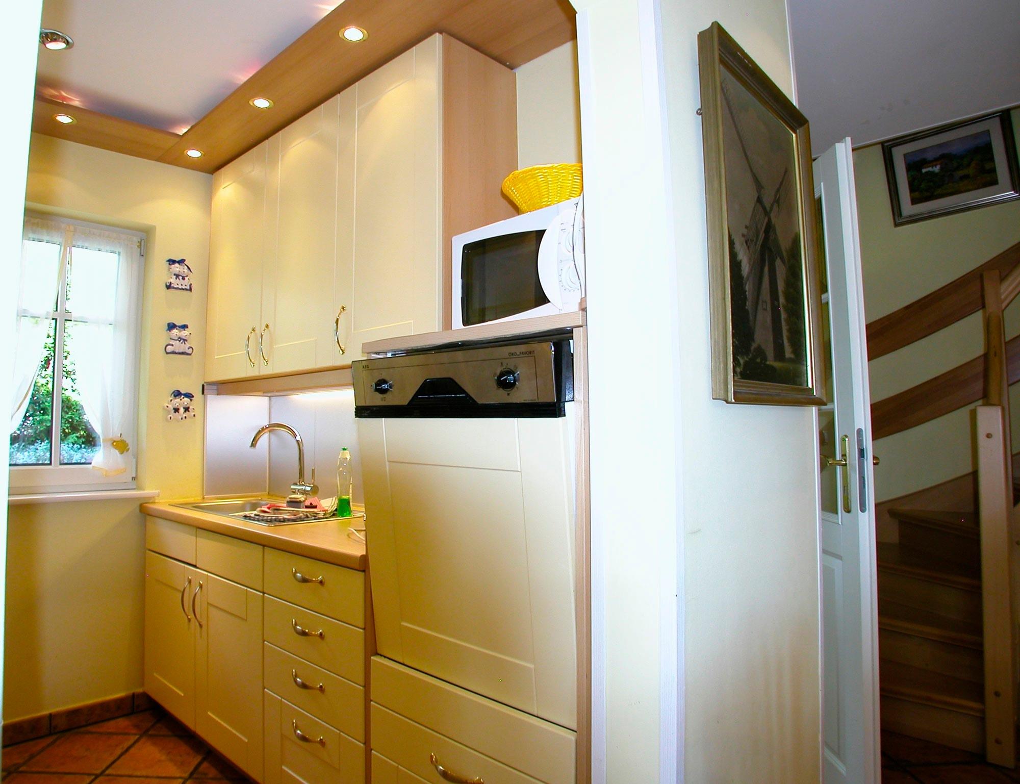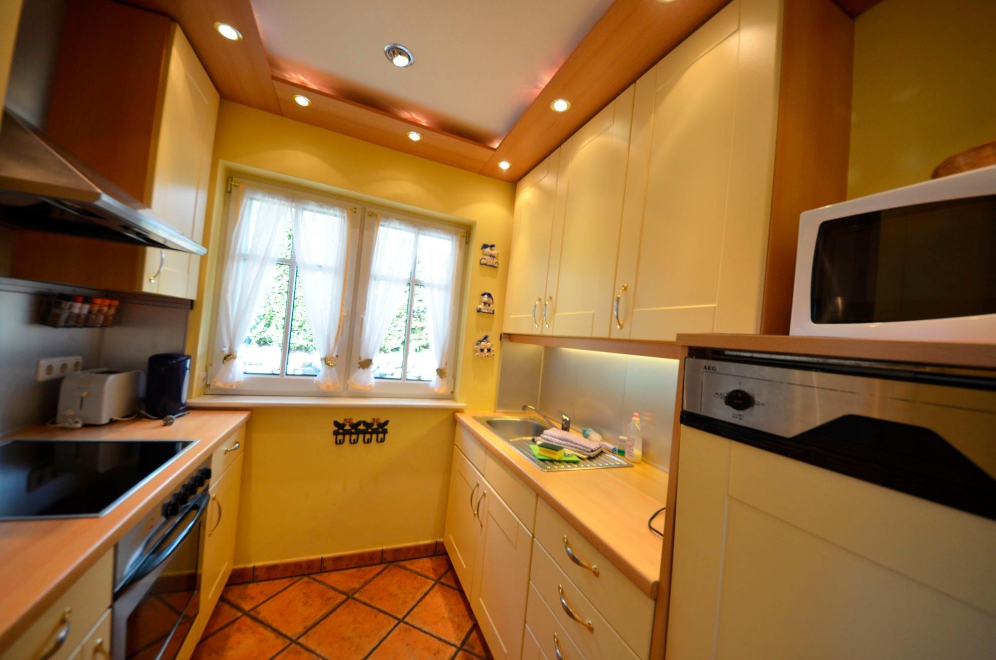 Fußbodenheizung, schöne moderne Einbauküche in arktisgelb, höher gelegter Geschirrspüler, Mikrowelle, Herd mit Cerankochfeld, Turmhaube und Backofen, Kühlschrank mit Gefrierteil, 2 Kaffeemaschinen, Wasserkocher, Eierkocher, Toaster, Waffeleisen, Mixer, ausreichend Edelstahltöpfe, Schnellkochtopf, Gewürze usw.