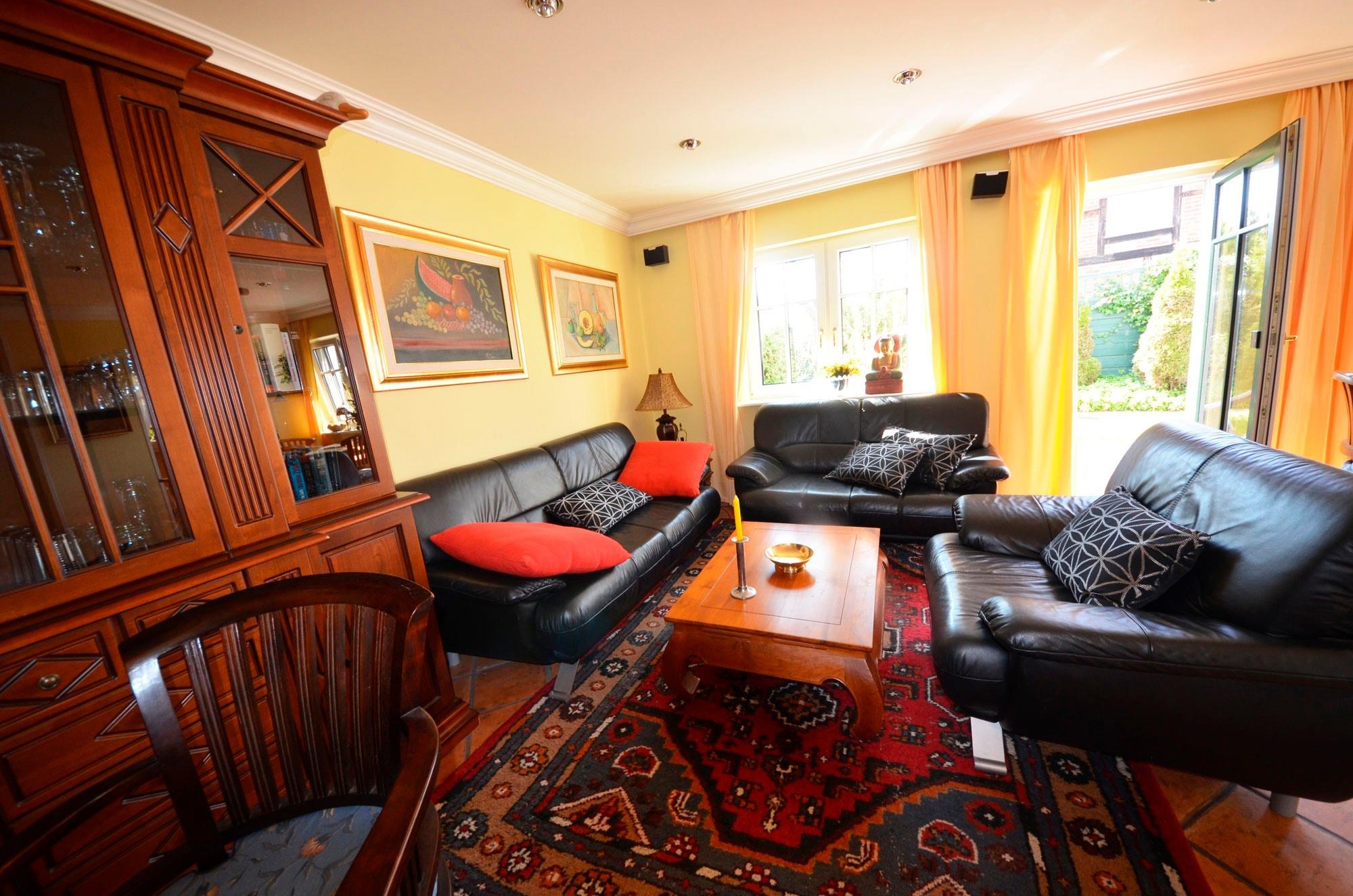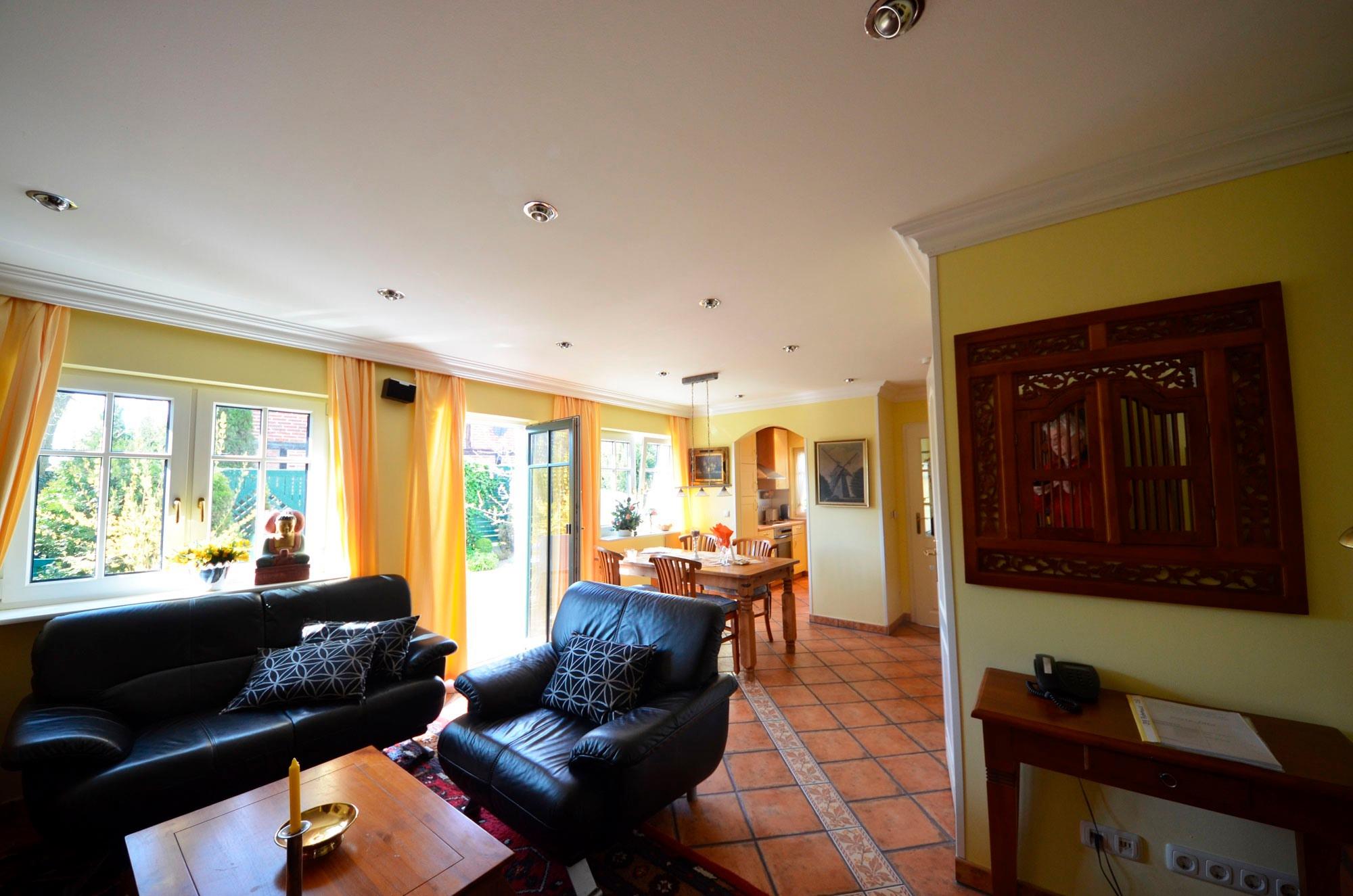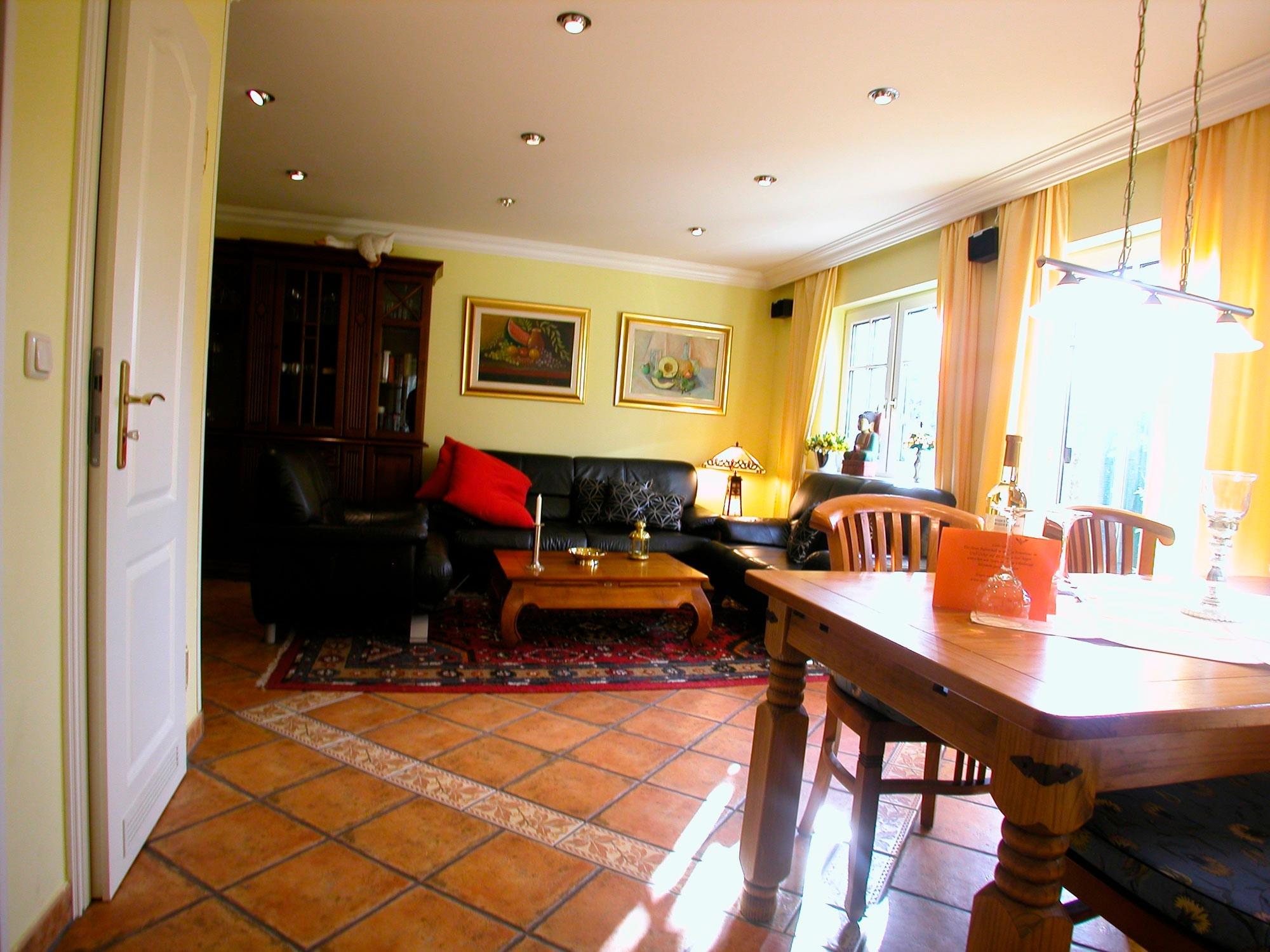 Gemütliches Wohn- Esszimmer mit Ausgang zur mit Pflanzen eingewachsenen Terrasse und Garten, Fußbodenheizung, Esstisch für 4 Personen, schöne Leder-Couch-Garnitur und Opiumtisch, 125cm-Flachbild - TV, Stereo/CD, Geschirrschrank, Telefontisch mit Telefon und balinesischem Spiegel, Kinderhochstuhl, Wände dekoriert mit Bildern.