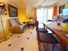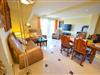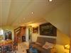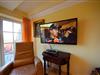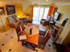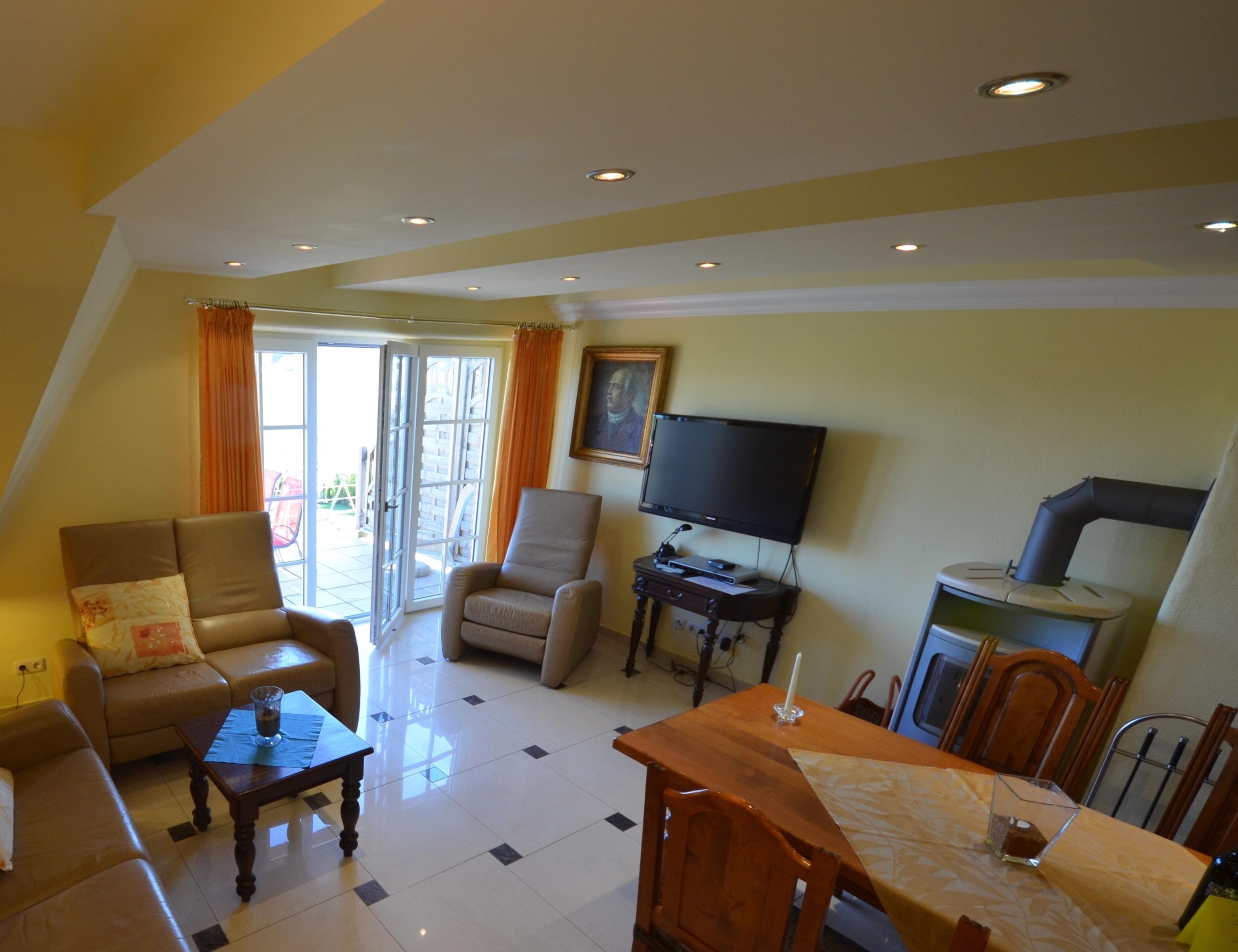 Großzügiges Wohn-Esszimmer mit Ausgang zum großen Balkon mit direktem traumhaften Blick auf die Ostsee, den kleinen Hafen von Groß Zicker und die gegenüber der Bucht liegenden Orte Thiessow und Klein Zicker. Schöne Ledergarnitur mit Opiumtisch. Speisetafel mit 6 Stühlen, großer Hark-Kaminofen, antike Vitrinen, kleine Bücherauswahl, Plasma-TV mit 125 cm Großbild, Fußbodenheizung, DVD-Recorder, Stereoanlage, CD-Player, Kinderhochstuhl, Wände dekoriert mit Spiegeln und Gemälden, sehr ansprechende Beleuchtung