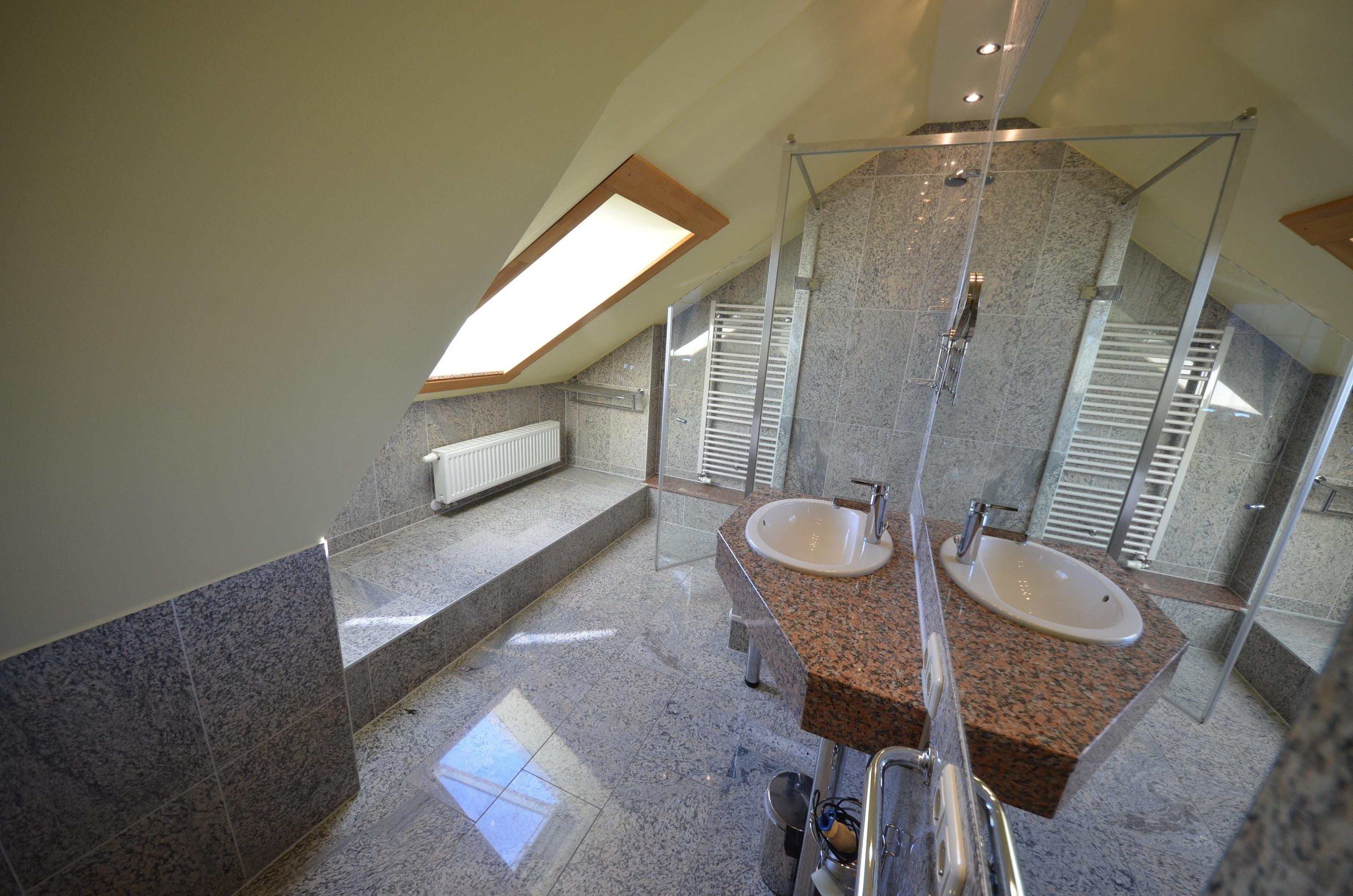1x Badewanne mit Glas-Duschabtrennung, Toilette und Bidet, 1 x Duschbad, Granitverkleidung, Fußbodenheizung, Granit-Abdeckungen, große Spiegel, schöne
