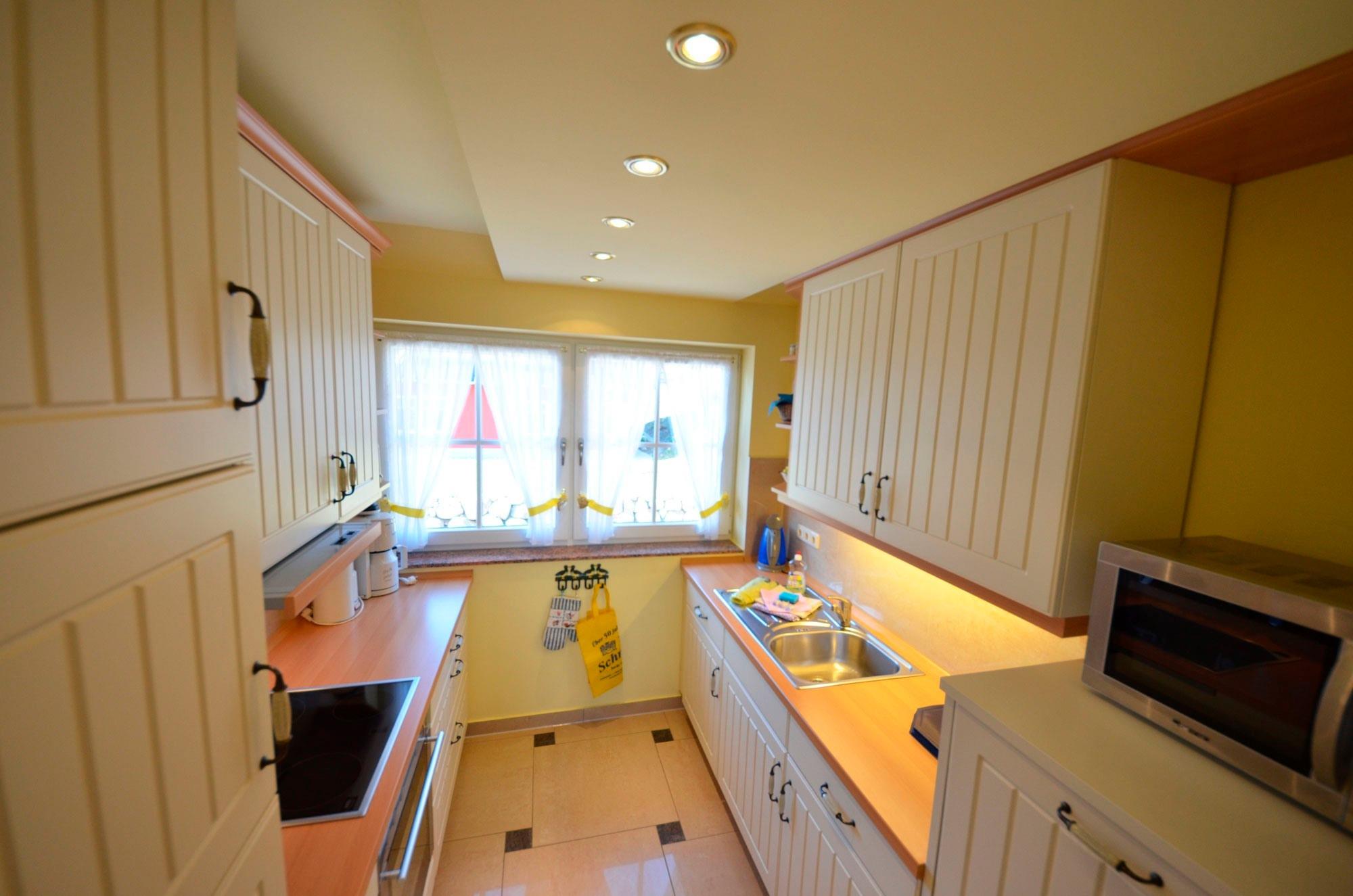 sehr dekorative Landhaus-Einbauküche in vanillegelb, Geschirrspüler höher gelegt, Mikrowelle, Herd mit Ceran-Kochfeld und Backofen, Flachschirm-Dunstabzugshaube, großer Kühlschrank mit 38Ltr. Gefrierteil. 2 Kaffeemaschinen, Wasserkocher, Eierkocher, Toaster, Waffeleisen, Mixer, ausreichend Edelstahl-Töpfe Schnellkochtopf, Gewürze, sehr schönes Geschirr, Auswahl an Gläsern