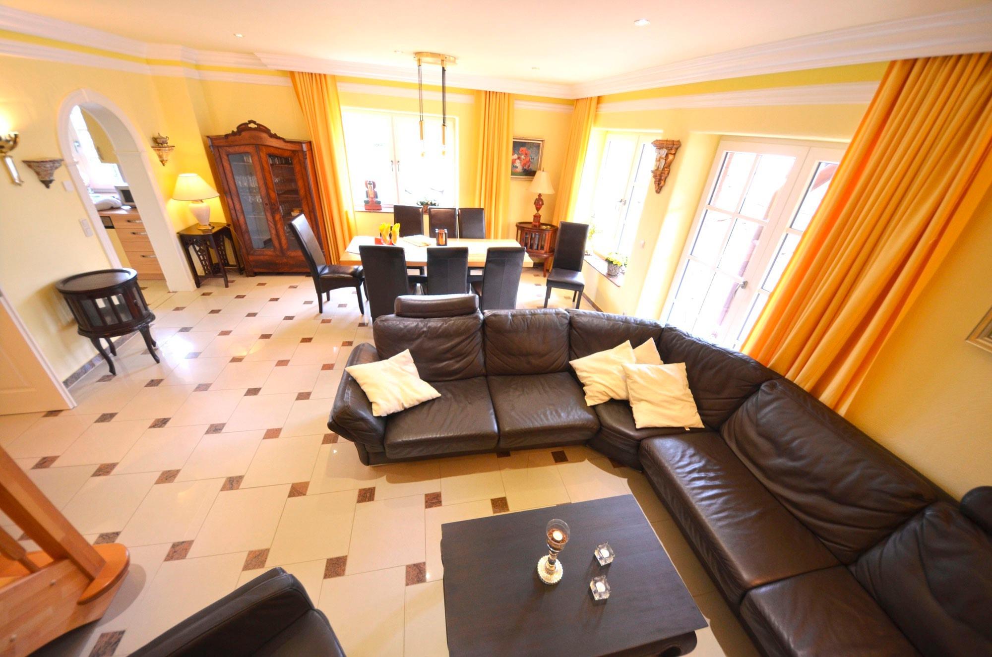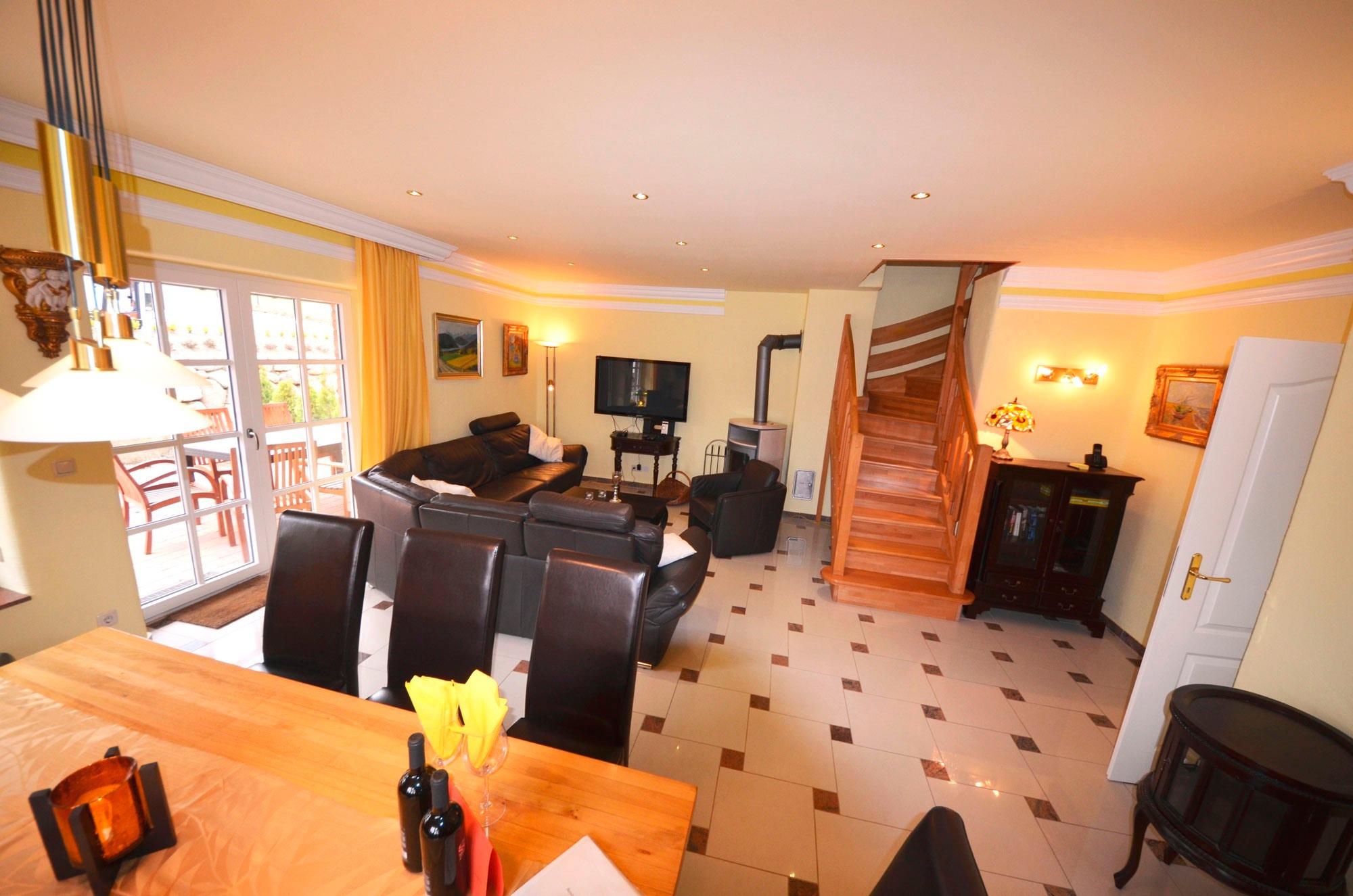 Solar - Fußbodenheizung, großzügiges Wohn- Esszimmer mit Ausgang zur großen Terrasse, schöne Leder-Couchgarnitur mit Opiumtisch, rustikale Speisetafel mit 8 Stühlen, großer Hark-Kaminofen, Holz ist kostenlos und am Haus gestapelt. Antiker Geschirrschrank, SAT-Plasma-Flach-TV mit 50 Zoll = 127cm Großbild, Video - Recorder, Stereoanlage, CD - Player, Kinderhochstuhl, Wände dekoriert mit Bildern, sehr dekorative Beleuchtung.