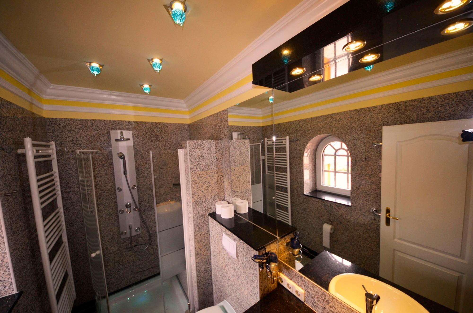 1 Bad im EG, 2 Bäder im OG und 1 Bad im Dachgeschoß. Fußbodenheizung im EG u. OG, Granitabdeckungen und Granitwandverkleidungen. Alle Waschtischabdeckungen aus schwarzem Granit "Star Galaxy". Große Spiegel, 2 Bäder mit walk-in-Duschen 100 x 140 - 160cm und 2 x mit Bidet.