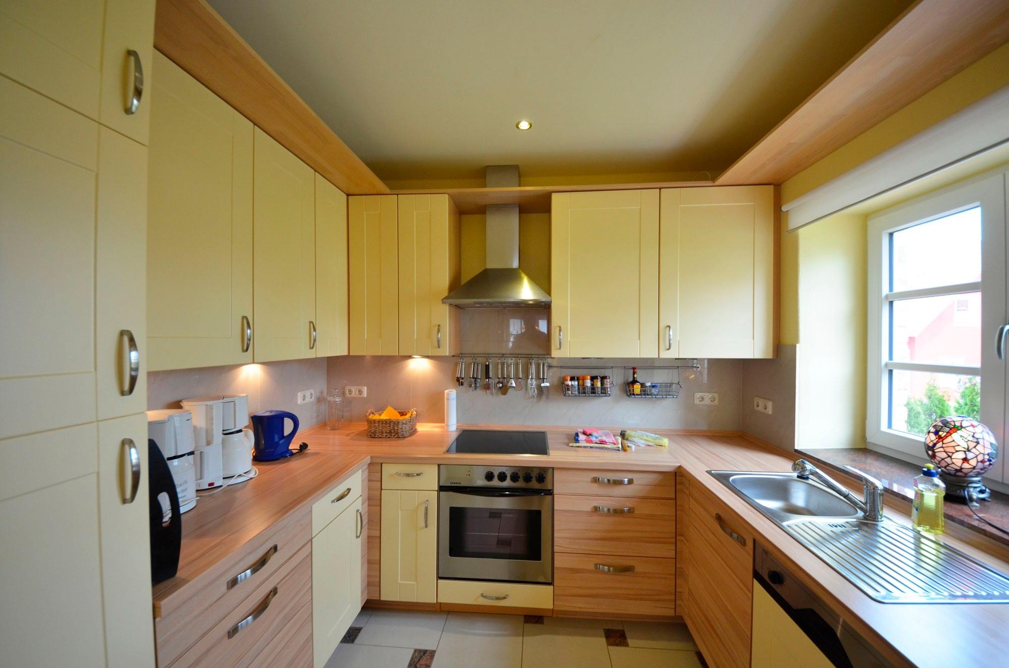 Sehr schöne große Einbauküche in vanillegelb und Buche, Geschirrspüler, Mikrowelle, großer Kühlschrank mit ca. 40Ltr. Gefrierteil - Herd mit Cerankochfeld, Backofen, Turmhaube. 2 Kaffeemaschinen, Wasserkocher, Eierkocher, Toaster, Waffeleisen, Mixer, ausreichend Edelstahl - Töpfe, Schnellkochtopf, Gewürze usw. Dekorative Beleuchtung.