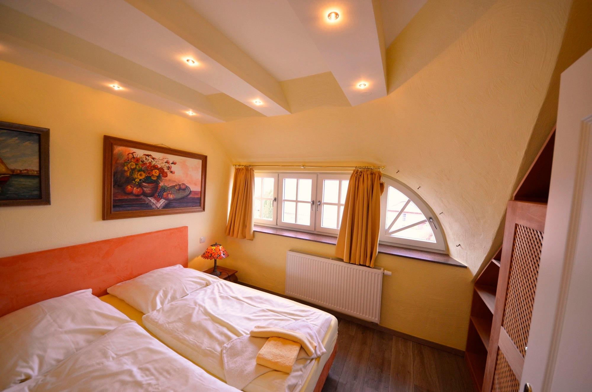 3 Doppelschlafzimmer - teilweise mit elektr. Rollläden. Doppelbetten, Radiowecker, mit Bildern dekoriert, antike Kleiderschränke, teilweise Einbauschränke, 1 weiterer TV sowie 1x kostenloses Babybett mit Babybettwäsche in einem Schlafzimmer