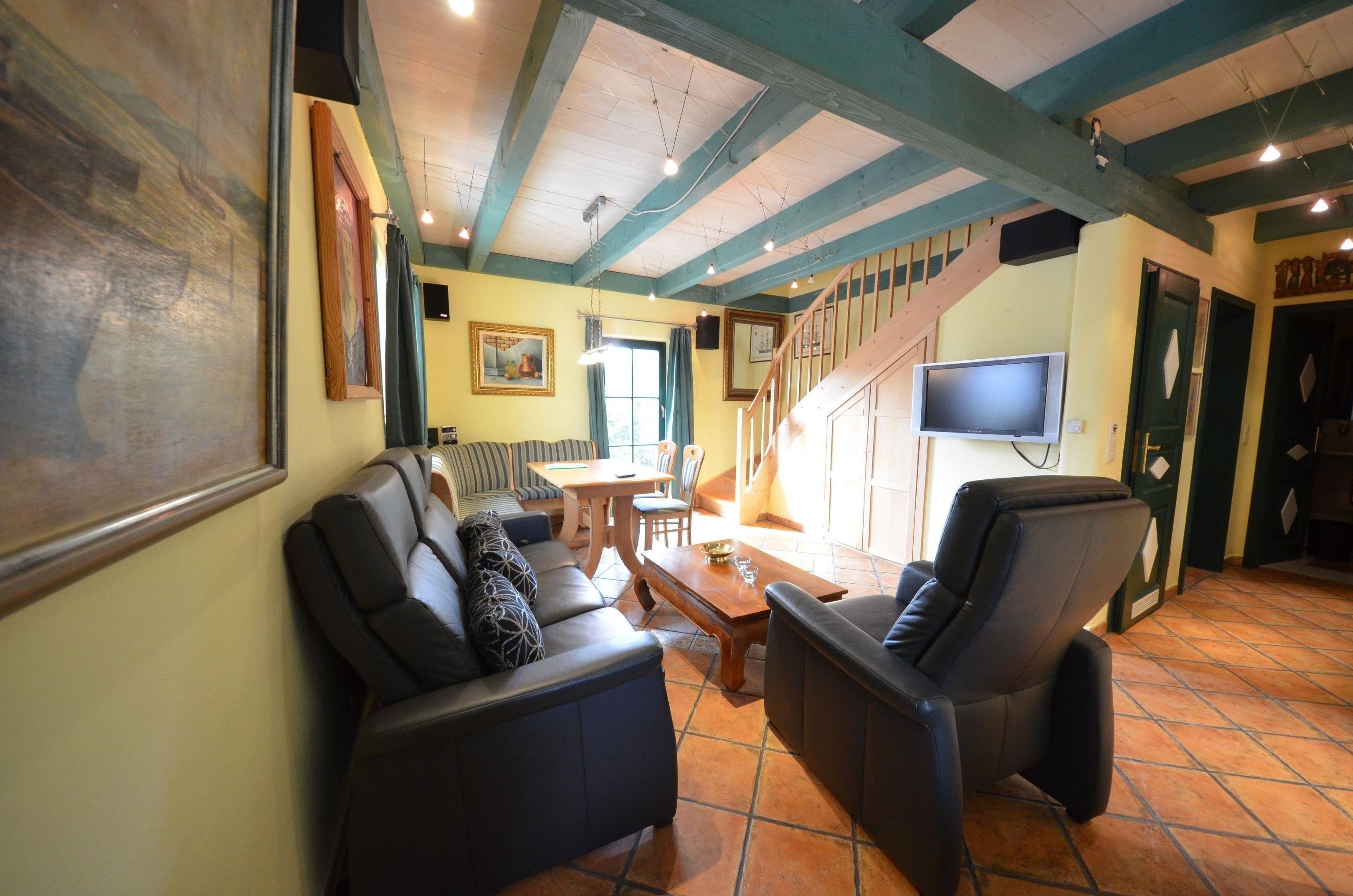 Gemütliches Wohnzimmer mit Deckenbalken und Ausgang zur mit Pflanzen eingewachsenen Terrasse mit Teak-Gartenmöbeln, Essecke für 6 Personen, schöne Couch-Garnitur mit Opiumtisch, 90er - Flachbild - TV, Stereo / CD, Geschirrschrank, Fußbodenheizung, Telefontisch mit Telefon, Kinderhochstuhl, Wände dekoriert mit Bildern, sehr dekorative Beleuchtung