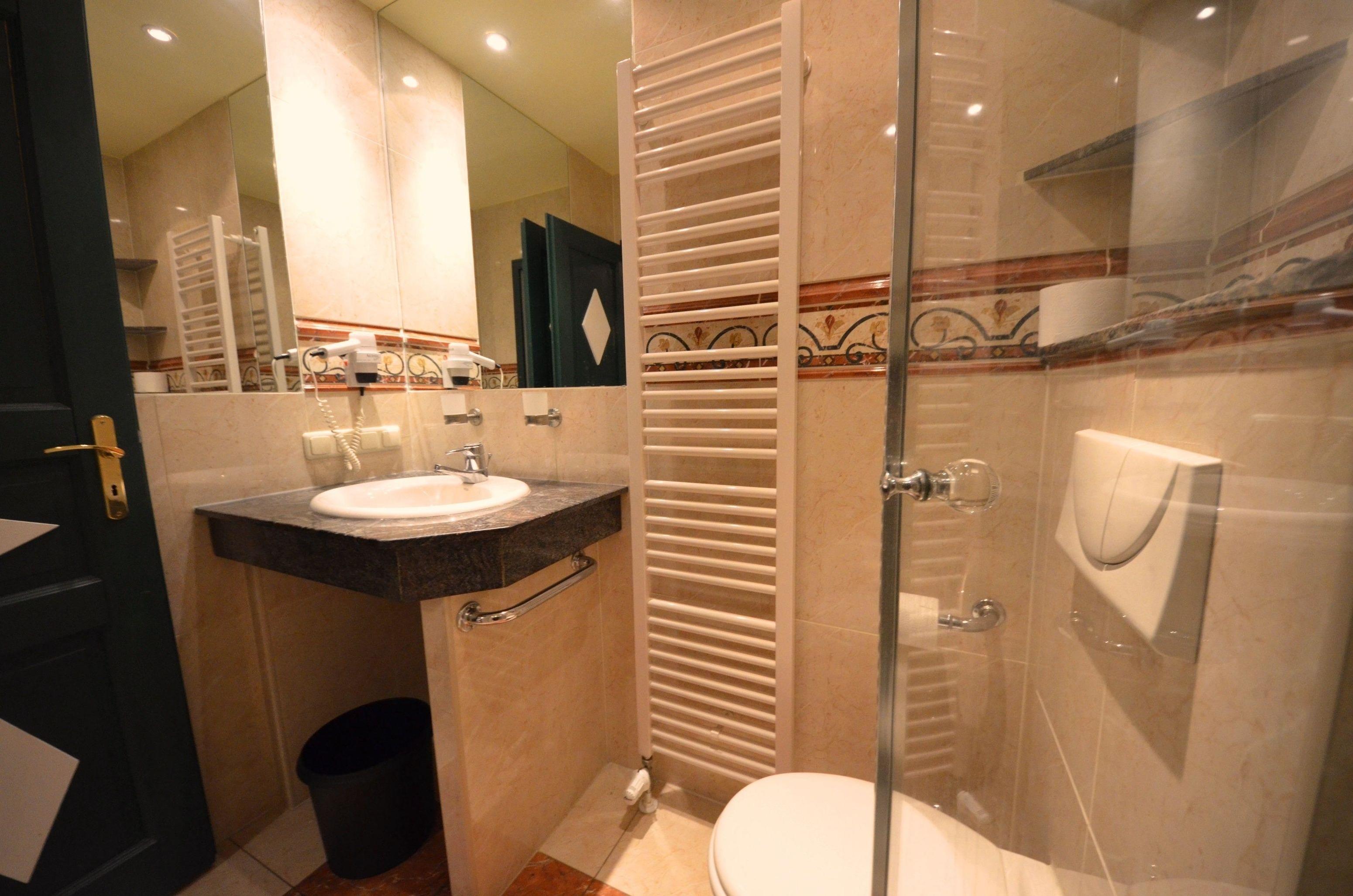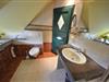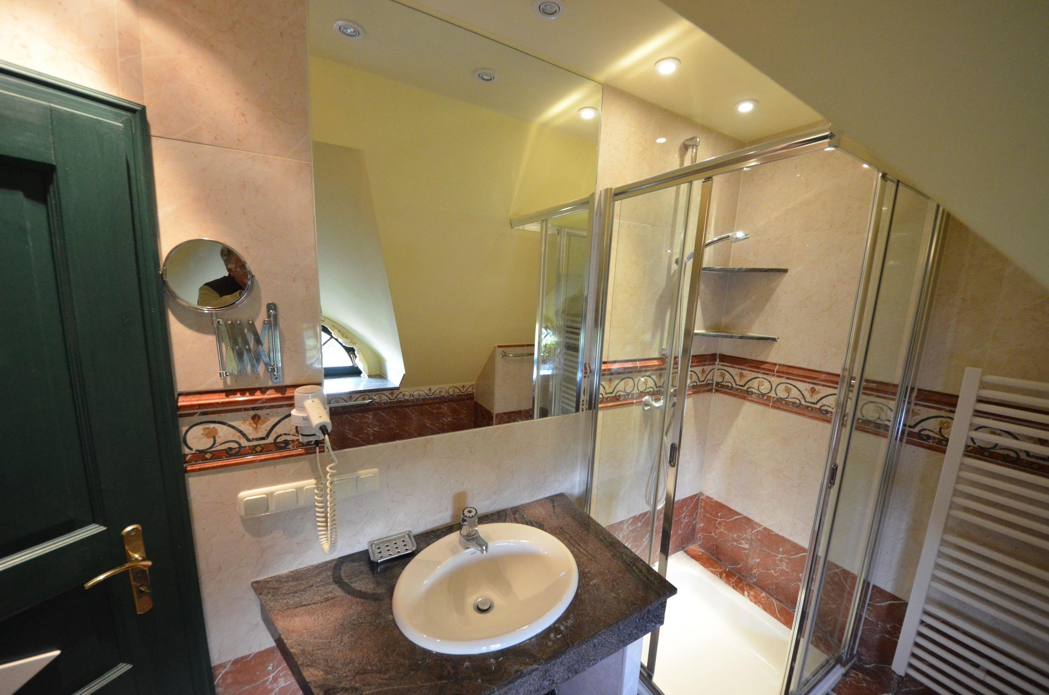 Glas- Dusche, Rundbogenfenster, Fön, Schminckspiegel, Fußbodenheizung, Natursteinabdeckungen, großflächige Spiegel, schöne Sanitärausstattung, beheizbarer Handtuchhalter.
