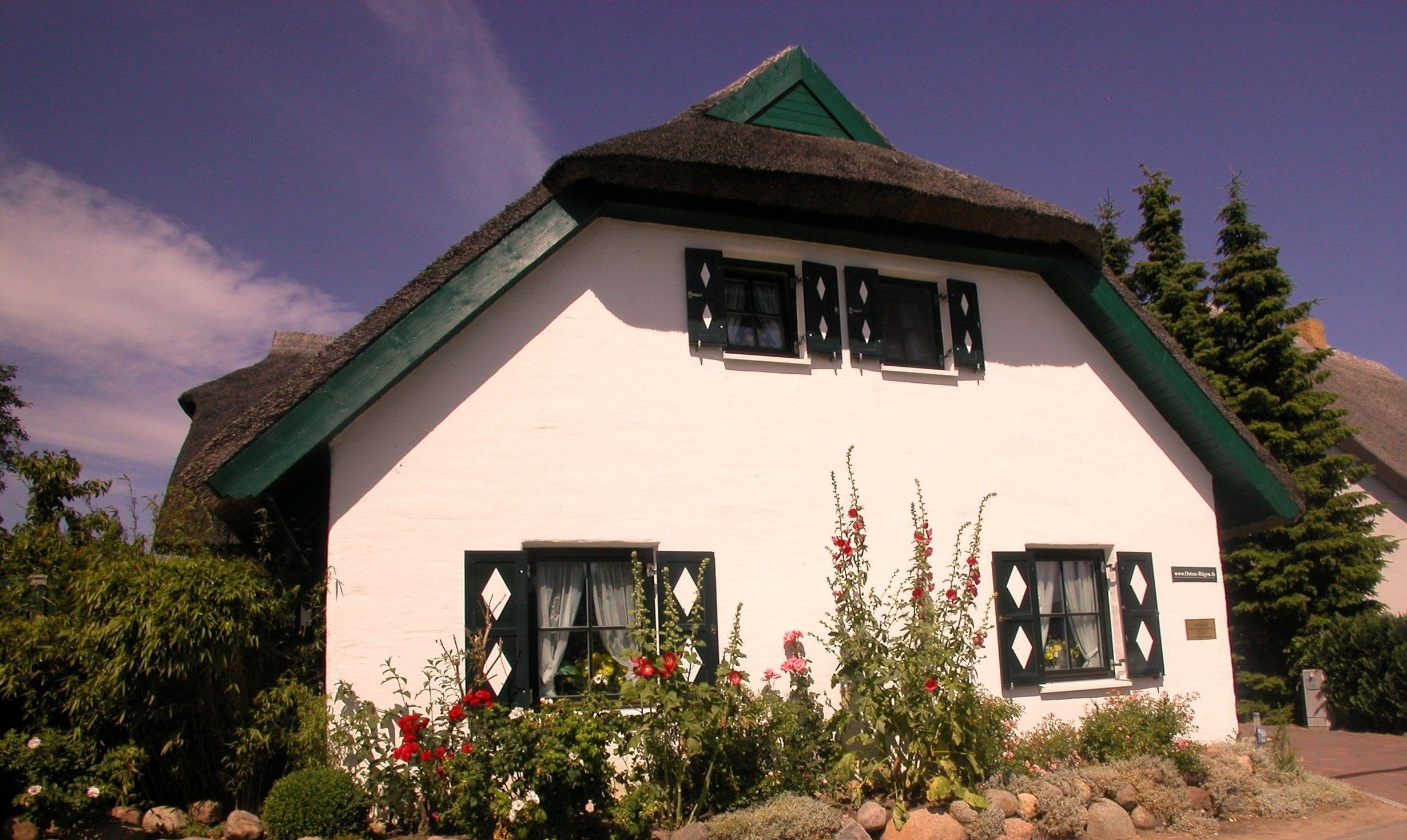 Die Holz – Sprossenfenster mit den dekorativen Klappläden und die Reet - Dacheindeckung vermitteln eine gemütliche Atmosphäre und passen zum allgemeinen Charakter des Dorfes.