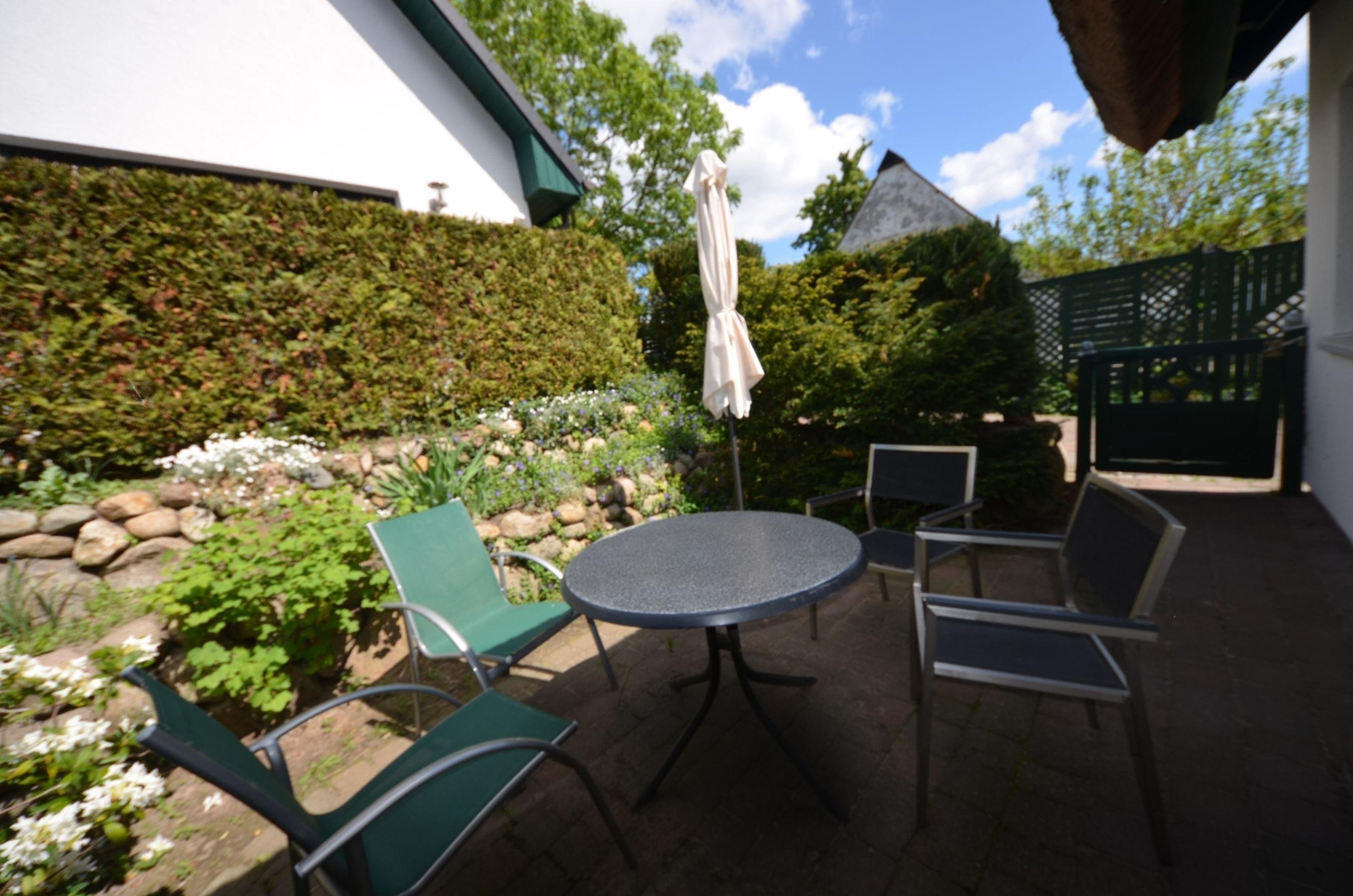 Vor der Haustür gibt es eine schöne eingewachsene Terrasse mit Gartenmöbeln.