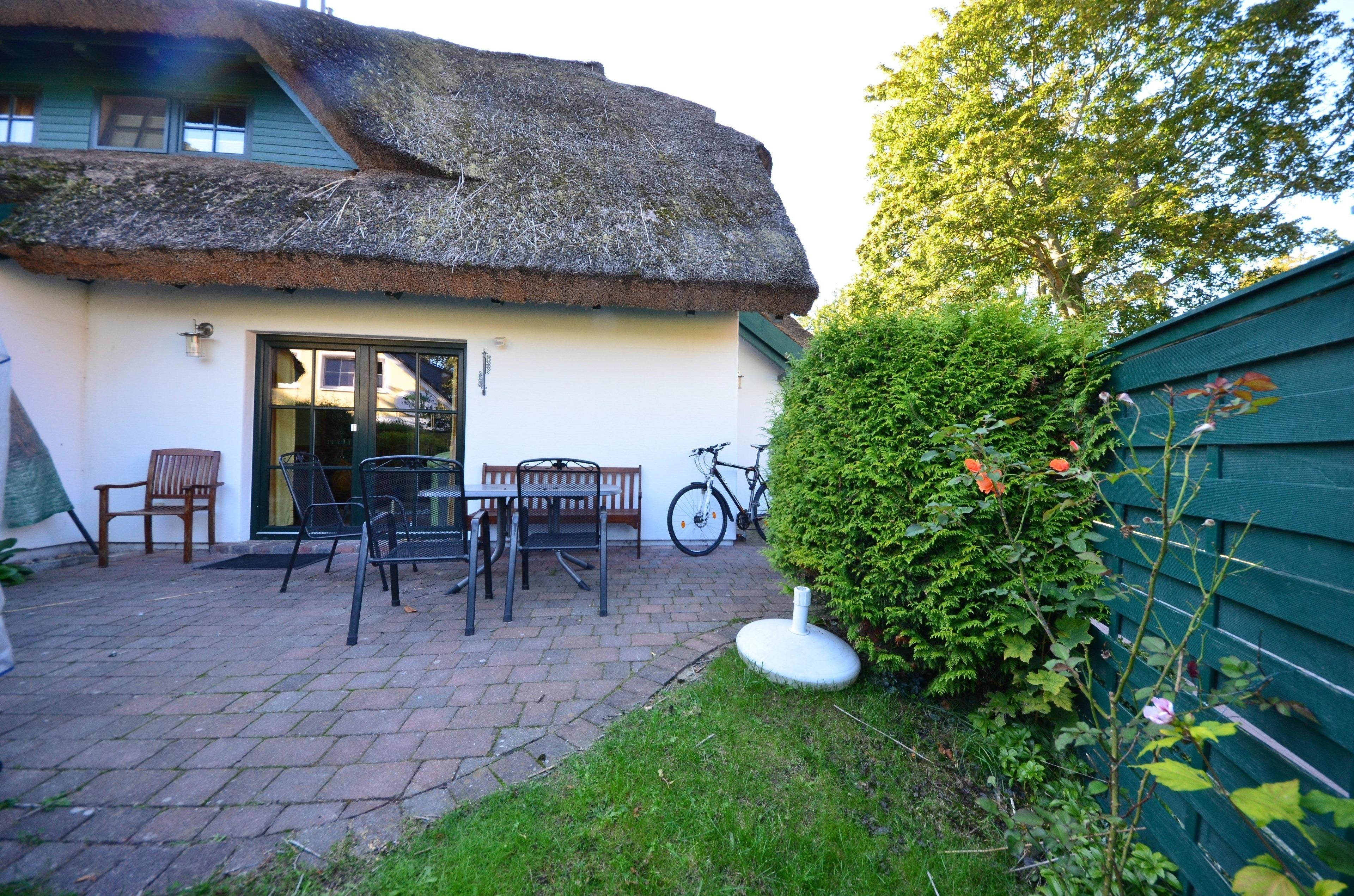 Das Haus hat einen eigenen separaten Eingang, einen kleinen Garten mit Terrasse, Gartenmöbeln und Strandkorb.