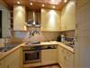 schöne vanillefarbene Landhaus-Einbauküche mit Geschirrspüler, Mikrowelle,
