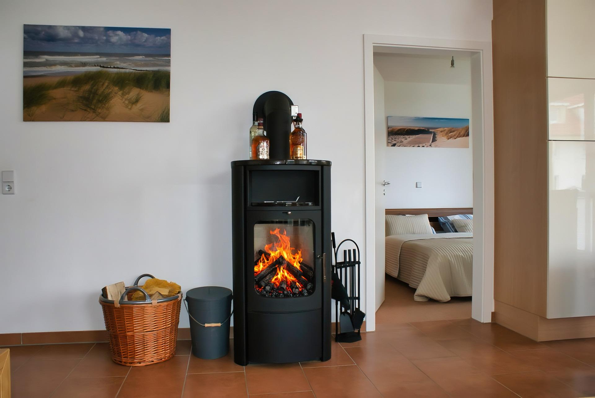 Das geräumige Wohnzimmer ist der ideale Ort, um zu entspannen: eine gemütliche Sitzecke mit Zweisitzer-Sofa und Sesseln, Kaminofen für kuschelige Abende, Flatscreen-TV, BlueRay-Player, Bücher, DVDs und Gesellschaftsspiele. Über das kostenfreie, stabile WLAN bleiben Sie immer verbunden. Die Essecke bietet Platz für vier Personen und ist direkt mit der modernen Küche verbunden. Hier beginnt der Tag mit einem ausgiebigen Frühstück – wahlweise drinnen oder auf dem sonnigen Balkon.