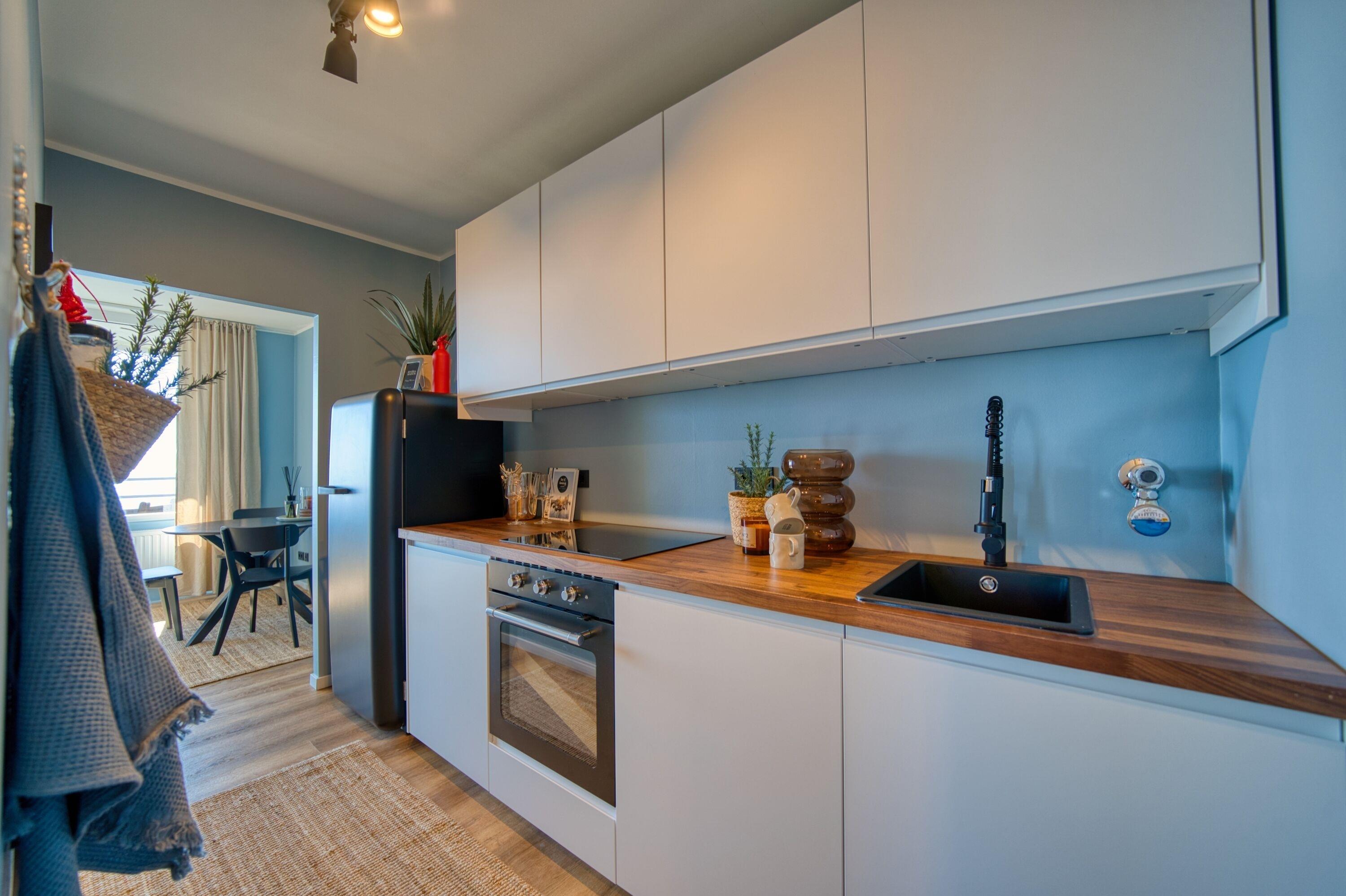 Die Küche bietet alles, was Sie brauchen: Cerankochfeld, Kühlschrank mit Gefrierfach, Kaffeemaschine, Wasserkocher und natürlich Geschirr und Besteck in ausreichender Menge.