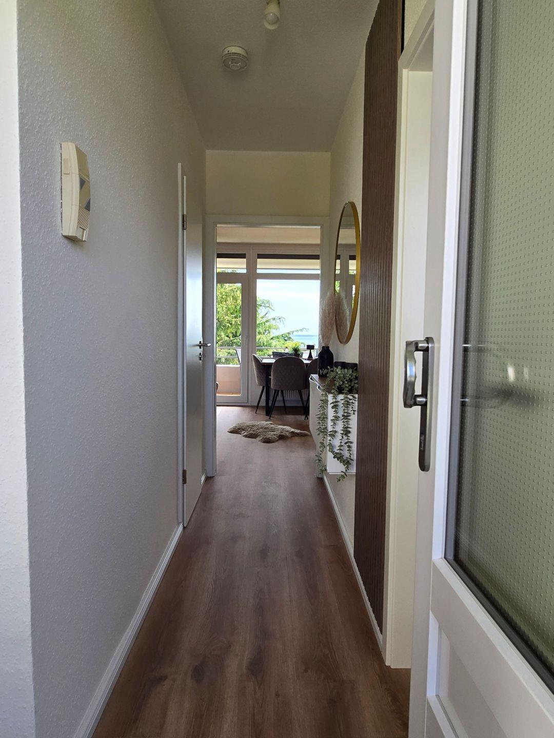 Das separate Schlafzimmer, ebenfalls mit Vinylboden, bietet erholsamen Schlafkomfort. Die Unterkunft verfügt über ein modernes Badezimmer mit Dusche, WC, Waschbecken und Spiegel. Für zusätzlichen Komfort gibt es Sichtschutz an allen Fenstern, einen Garderobenbereich und einen praktischen Schuhschrank.