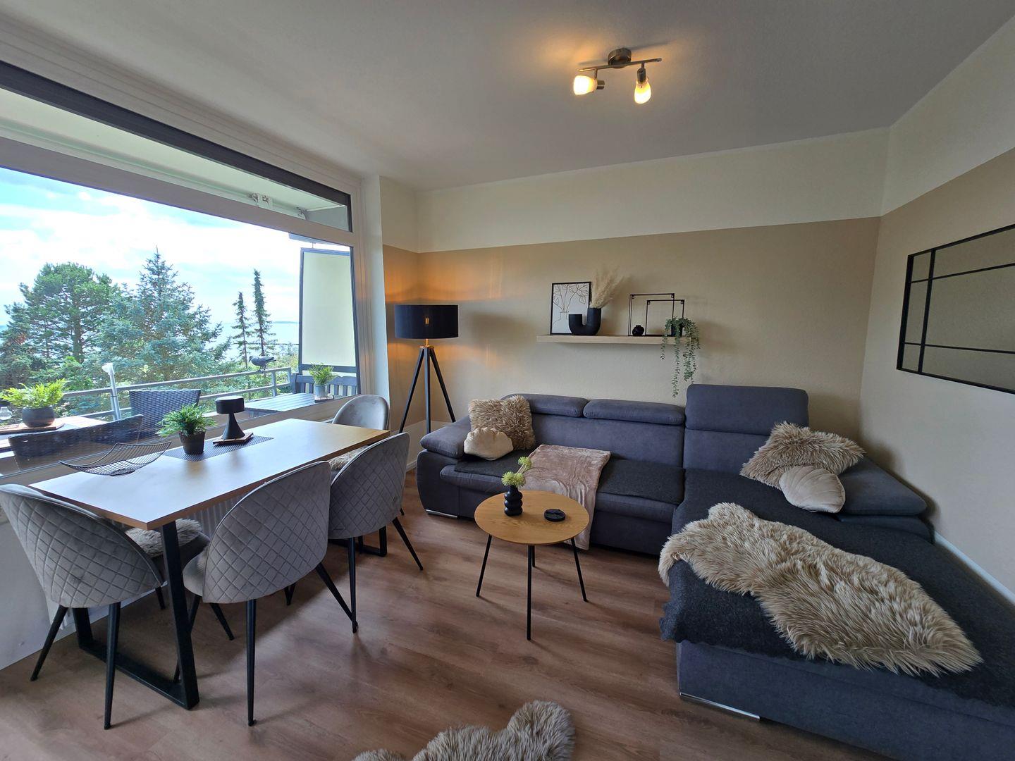 Das großzügige Wohnzimmer ist mit einem Vinyl-Bodenbelag versehen und bildet gemeinsam mit der offen gestalteten Küche den Mittelpunkt der Ferienwohnung. Im Wohnbereich erwarten Sie eine gemütliche Sofaecke, ein Sessel und einem Essbereich mit Esstisch. Für Ihre Unterhaltung stehen zwei Fernseher sowie ein Radio zur Verfügung.