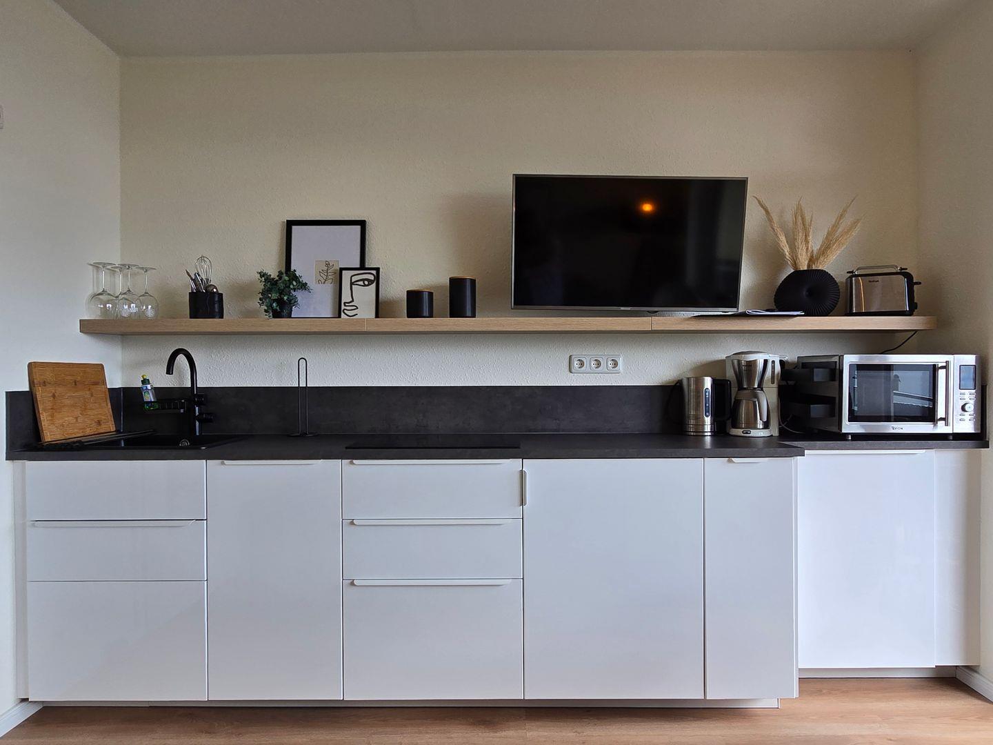 Die offene, moderne Küche ist bestens ausgestattet: Hier stehen Ihnen ein Induktionsherd, Mikrowelle, Kühlschrank mit Gefrierfach, Spülmaschine, Wasserkocher, Toaster und Kaffeemaschine zur Verfügung. Geschirr, Besteck und diverse Küchenutensilien sind selbstverständlich vorhanden, sodass Sie sich unabhängig verpflegen können.