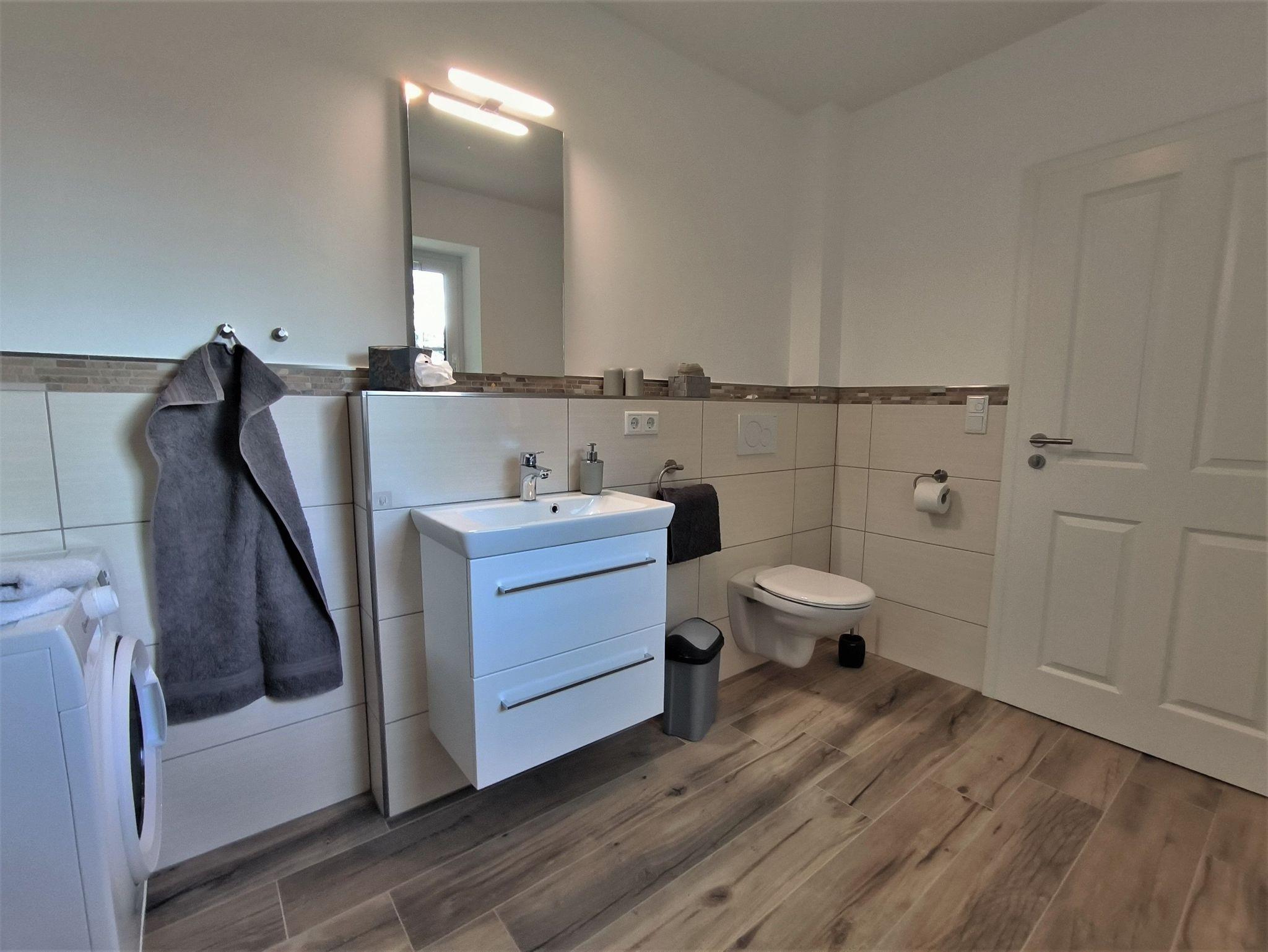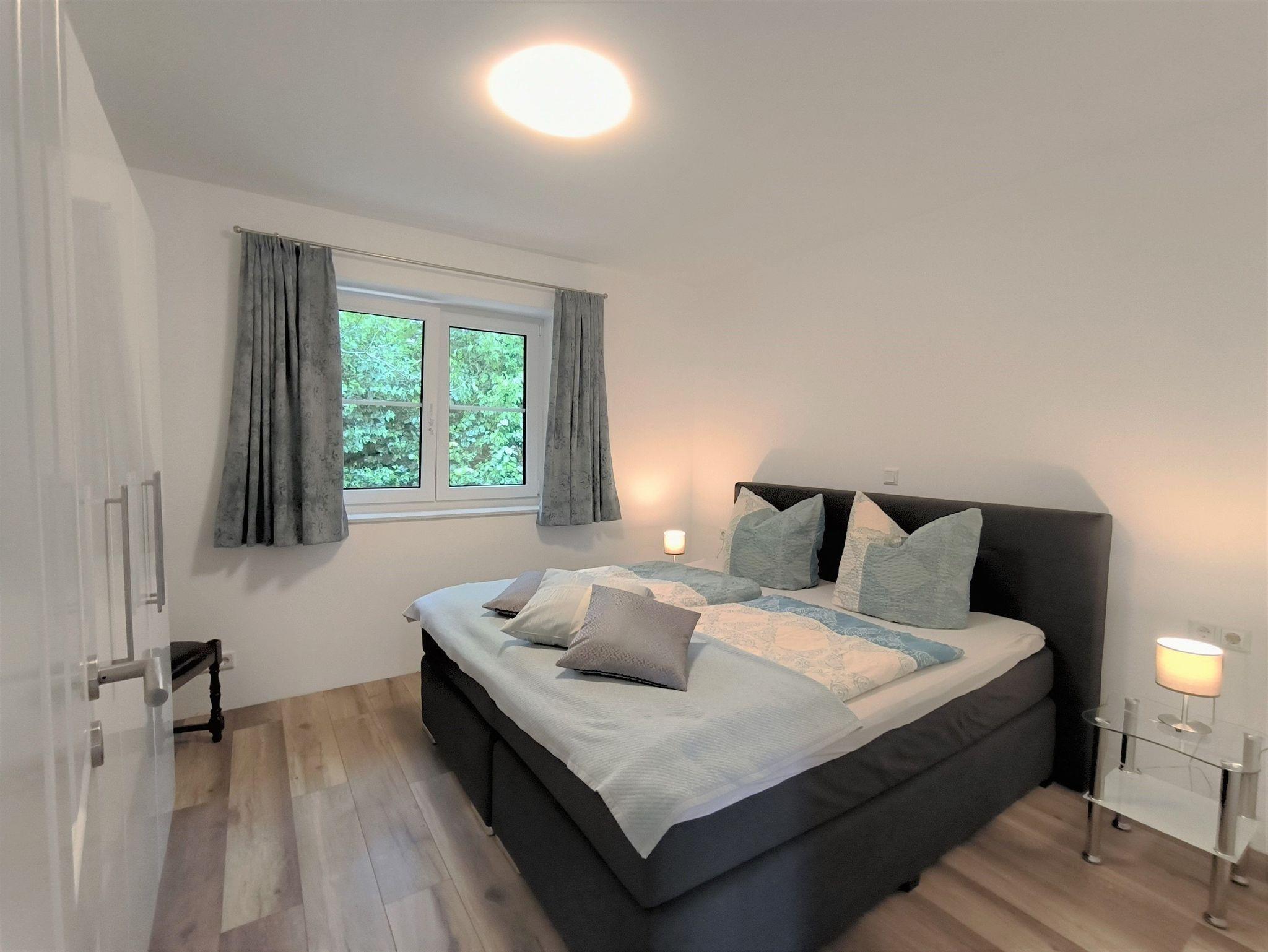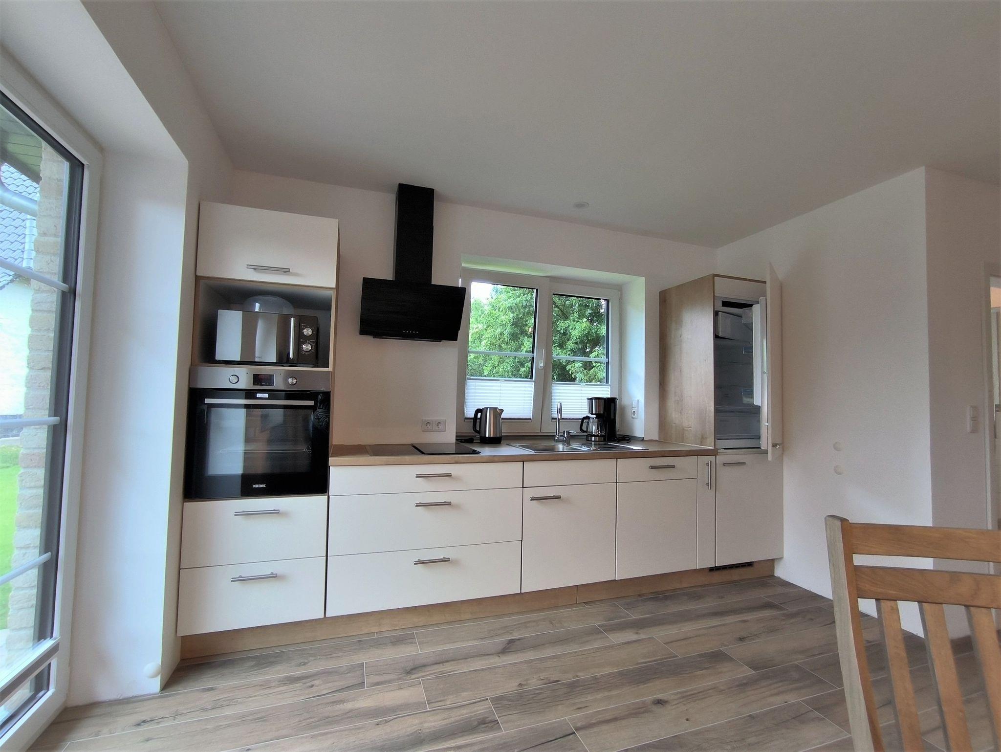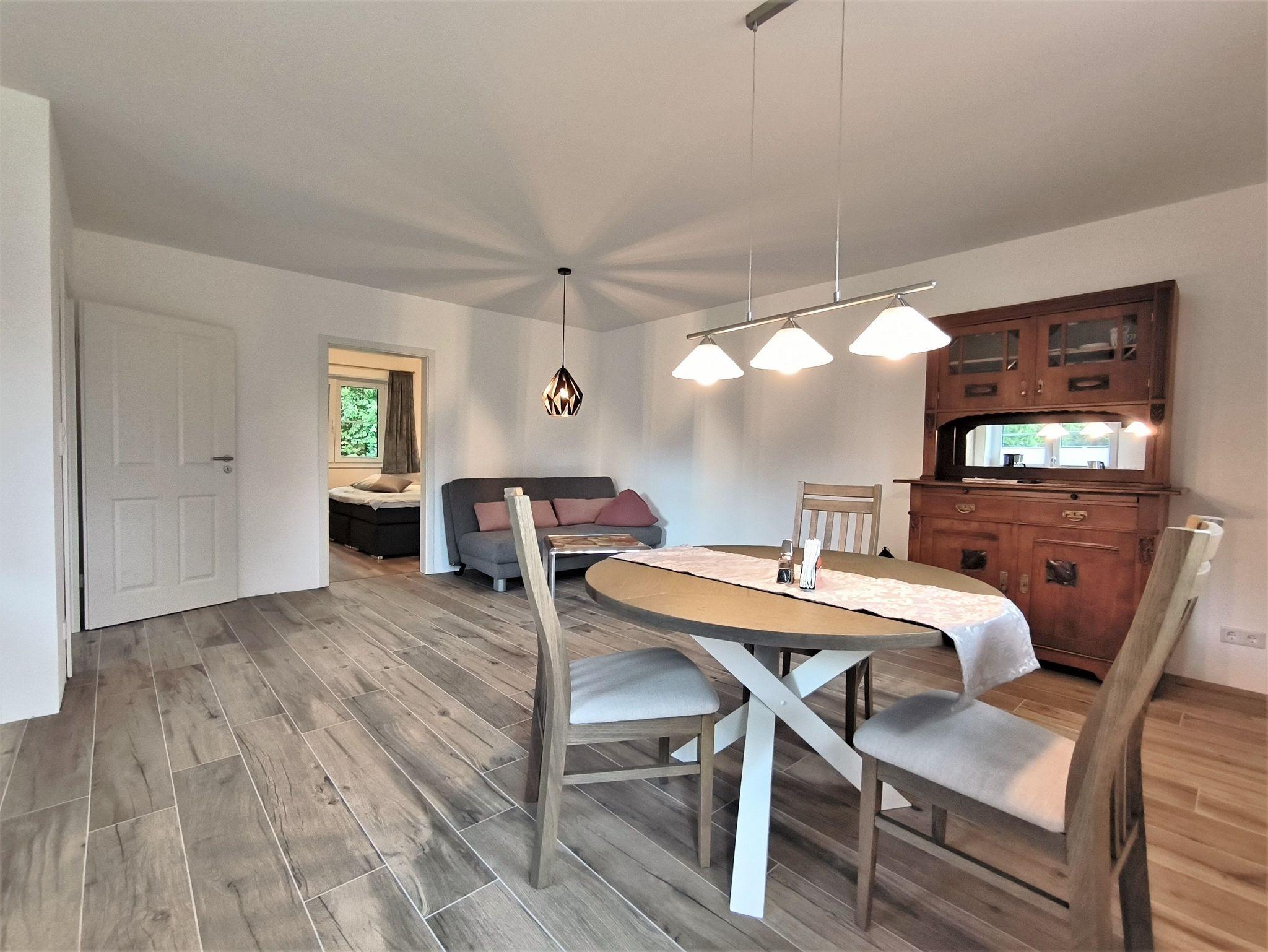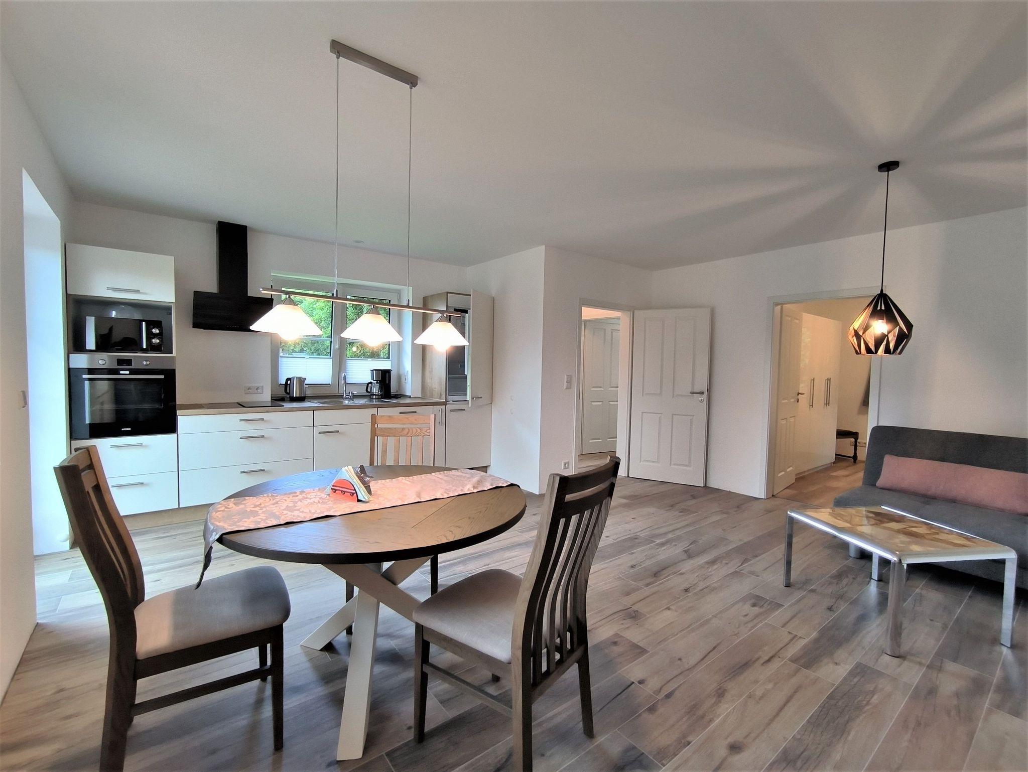 Der große Wohn- und Essbereich ist mit einem runden Esstisch, einem Sofa (Schlafsofa 1,80 x 2,00m), TV und einer bestesn ausgestatteten Küche eingerichtet. Von hier aus geht es auf die Terrasse: diese ist mit Gartentisch und -stühlen sowie einem Strandkorb ausgestattet. Im Schlafzimmer stehen ein Doppelbett (1,80m x 2,00m) und ein Kleiderschrank, das Zimmer ist mit Verdunklungsvorhängen und Fliegenfenstern versehen. Das moderne Badezimmer mit Tageslicht hat eine ebenerdige Dusche, Waschbecken und Toilette sowie eine Waschmaschine. Es stehen ein abschließbarer Raum für Fahrräder o.ä. und ein Carport direkt am Haus zur Verfügung. In demselben Gebäude findet sich noch eine zweite, größere Wohnung für bis zu sechs Personen (Buchenblick).