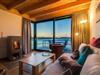 Im Obergeschoss befinden sich zwei Schlafräume mit einer kleinen Schreibecke und das elegante Badezimmer mit Dusche, WC und Sauna (Infrarotkabine oder Trockensauna). Der offen gestaltete Wohn-/Essbereich in Parterre ist mit bequemen Sitzmöbeln, Schlafcouch für die 5. Person im Wohnbereich, Kamin und einem stilvollen Interieur ausgestattet. Parkett und die Fußbodenheizung komplettieren das Raumangebot.