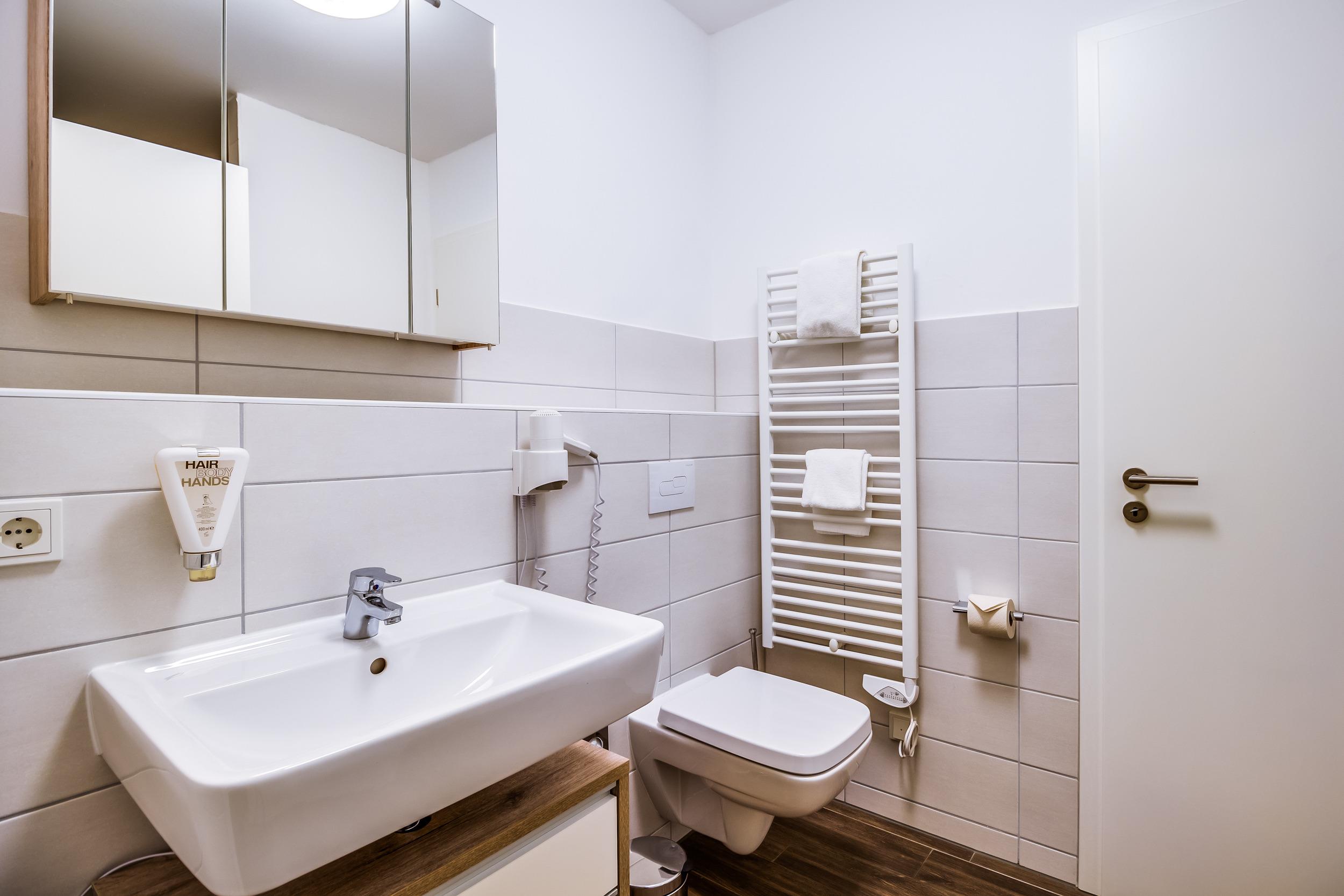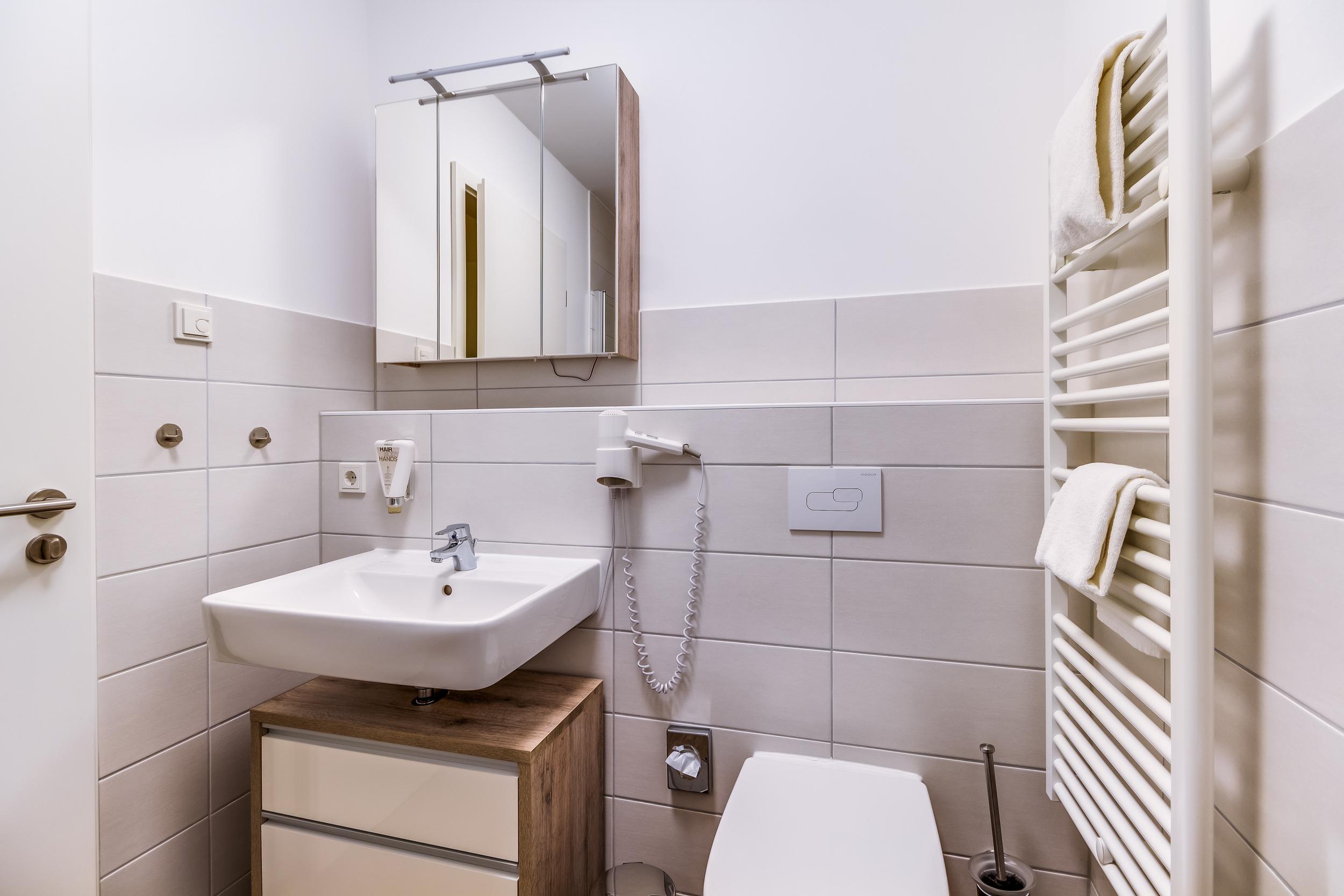 - Badezimmer mit WC und ebenerdiger Dusche sowie Fön