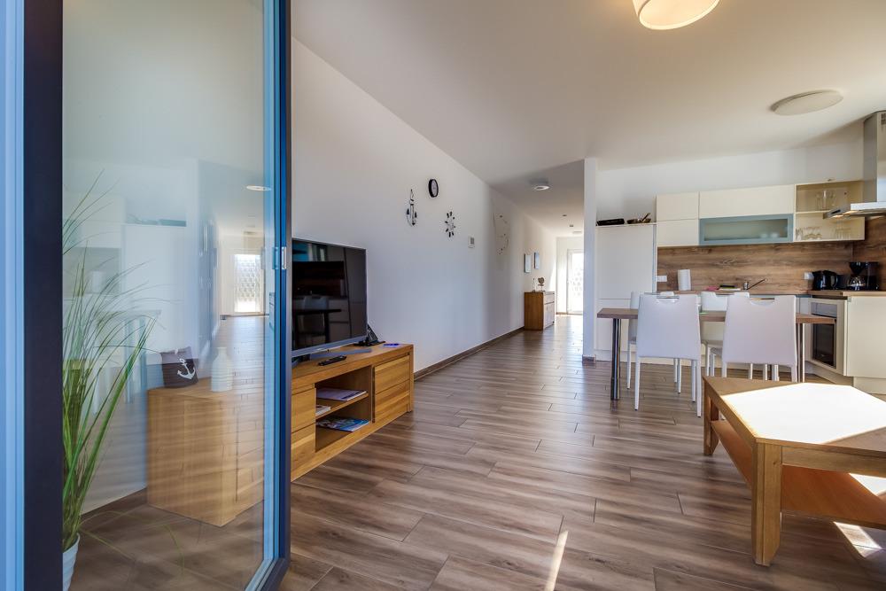 Die großzügigen Ferien-Appartements sind jeweils mit einem Schlafzimmer (mit einem Doppelbett 160 x 200 cm), einem Badezimmer mit Dusche/WC und einem offen großzügigen Wohn-/Essbereich ausgestattet. Die komplett eingerichtete Einbauküche sowie die bequeme Wohnlandschaft und der angrenzende Balkon mit Hafenblick runden das Wohlfühlangebot ab.