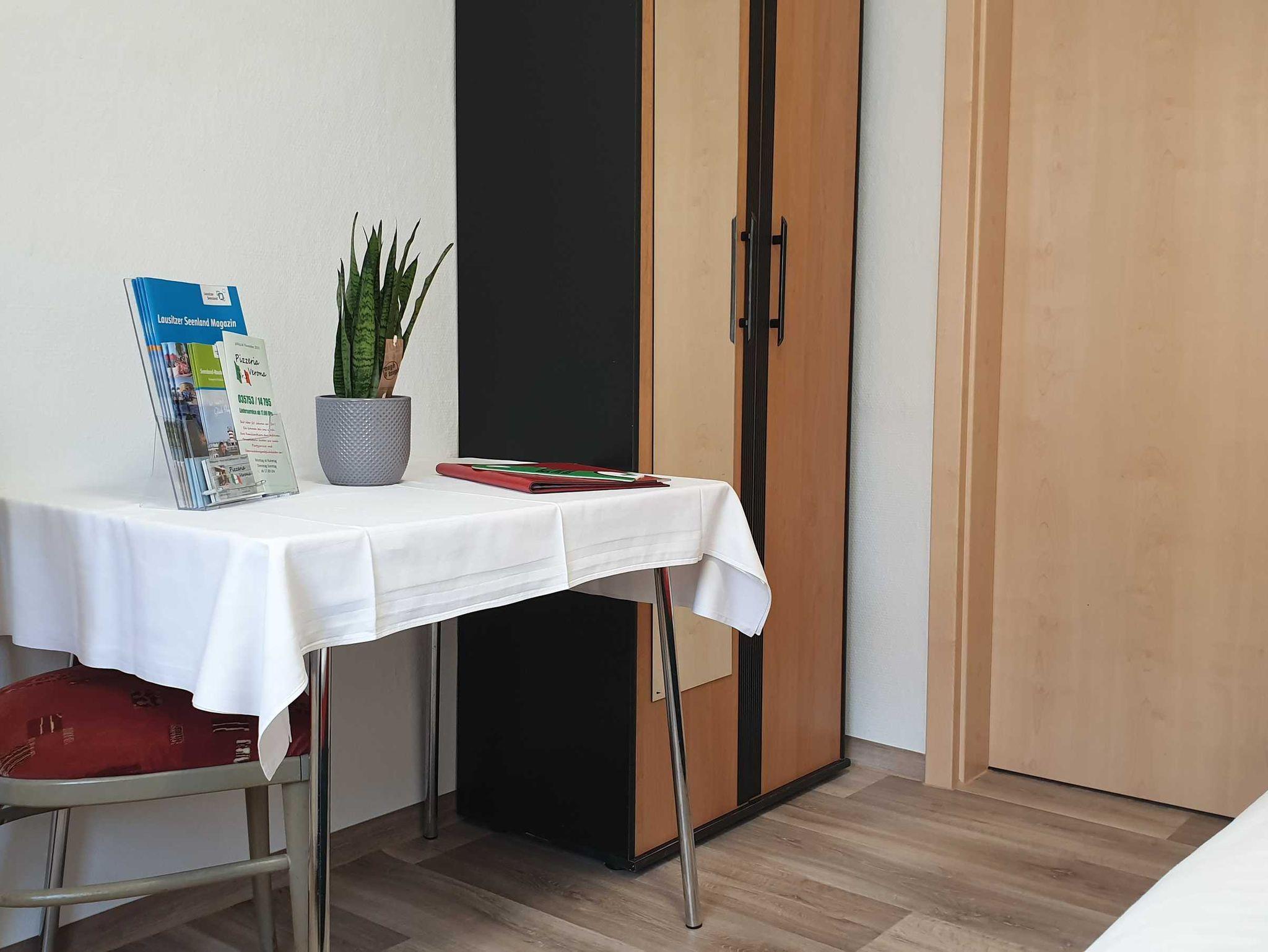 Weiterhin finden Sie im Zimmer eine Sitzgelegenheit, einen Kleiderschrank und einen kleinen Kühlschrank.