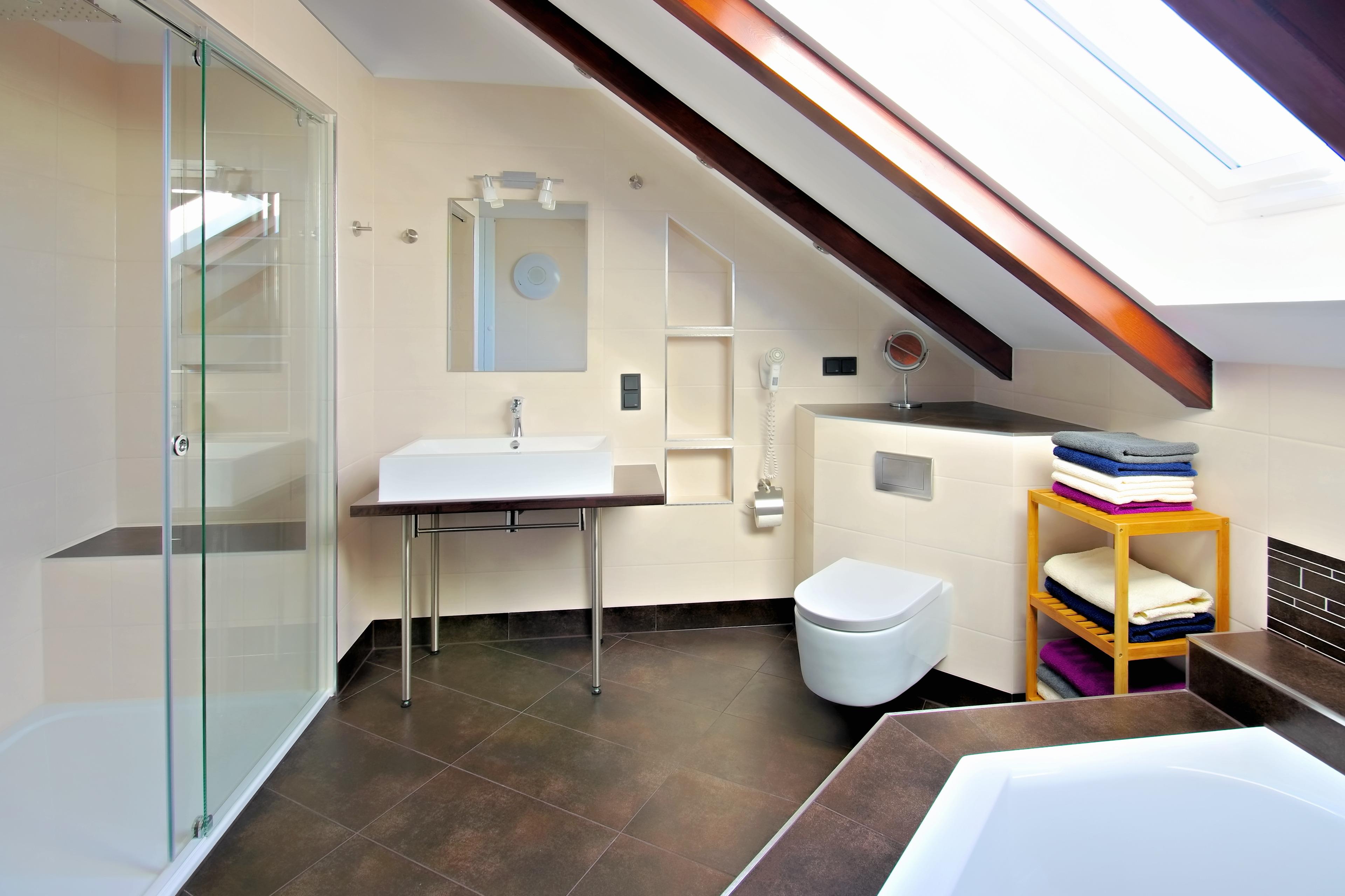 Bad: Dachfenster, Fußbodenheizung, Dusche 140 x 90 cm mit Regendusche, Badewanne für 2 Personen, Haartrockner, Kosmetikspiegel