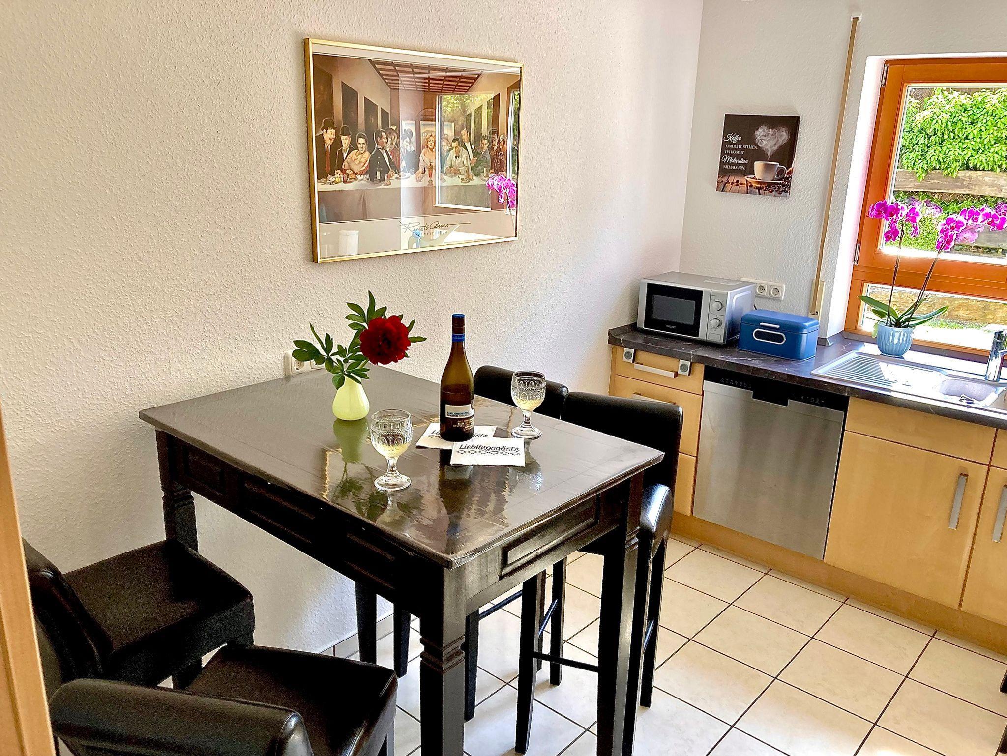- großzügig und detailreich ausgestattete Wohn-Küche mit Essmöglichkeit für 4 Personen (alle üblichen Einbaugeräte inkl. Gefrierschrank, Geschirrspüler sowie Mikrowelle, Kaffeemaschine, Wasserkocher, Toaster, Geschirr, Besteck, Kochutensilien etc.) - nach Absprache im Sommer Grillmöglichkeit (Holzkohle) im Garten