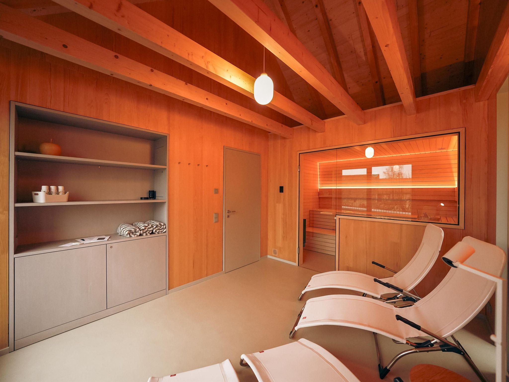 Die Sauna mit Ruheraum im ersten Obergeschoss und mit Zugang zur weiten, sich nach Süden öffnenden Dachterrasse spendet Ihnen den entspannten Ausklang nach einem aktiven Tag. Die Terrasse fängt selbst in den Wintermonaten die Sonne ein und bietet einen ansprechenden Raum, um den Blick auf die umliegenden Felder und Berge zu erleben.