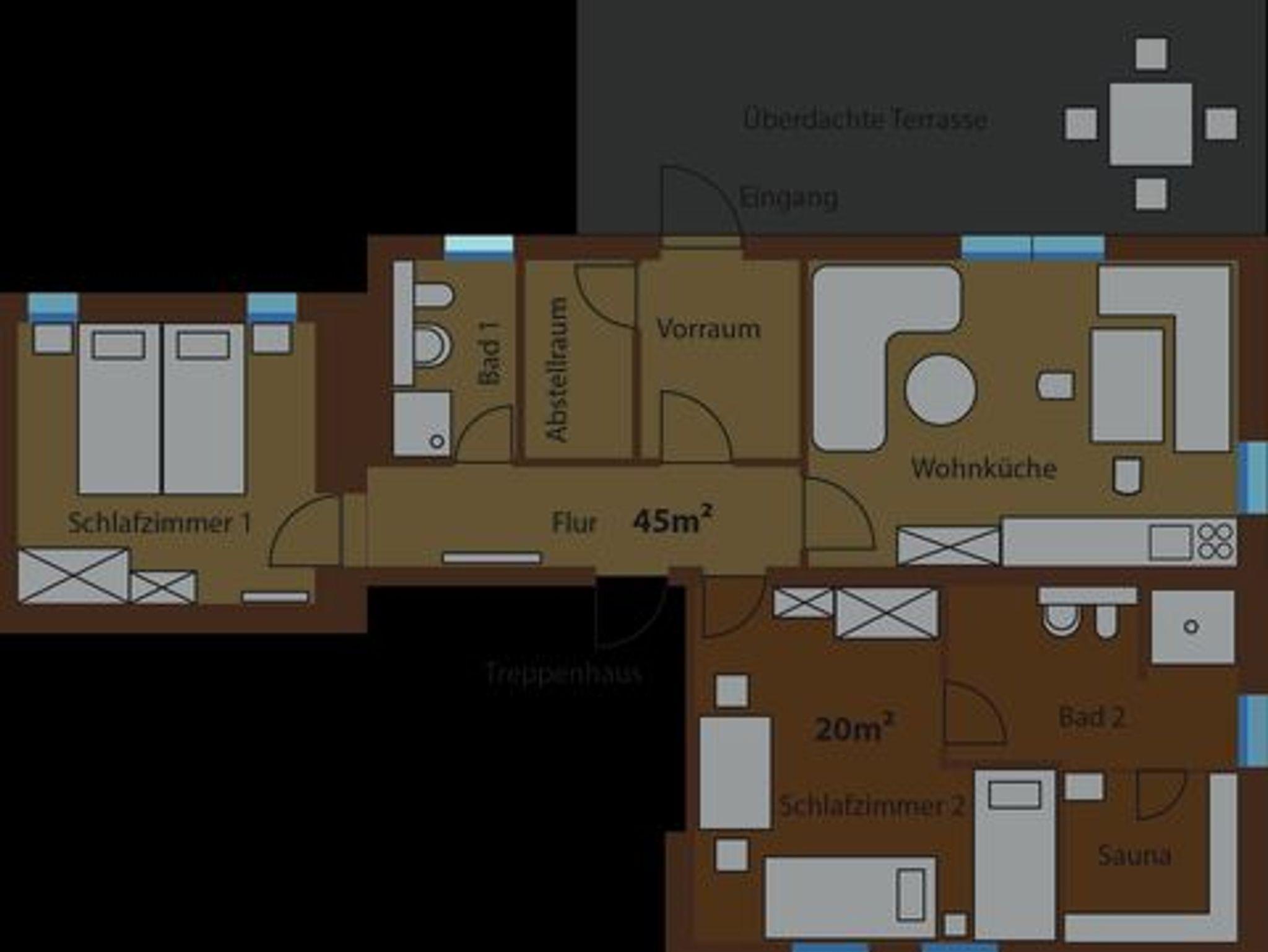 Die FeWo Gartenblick ist 45-73 m² groß und bietet Platz für 2-7 Personen. Sie verfügt über zwei Schlafzimmer und zwei Bäder mit DU/ WC/ Föhn und Sauna. Die komfortable Wohnküche ist ausgestattet mit Couch und Sitzecke, Flachbildschirm, Geschirrspüler, Cerankochfeld, Mikrowelle, Kühlschrank u.v.m. Behaglichkeit durch moderne Fußbodenheizung, Hand-, Dusch- und Saunatücher sind vorhanden, WLAN kostenfrei, große überdachte Terrasse und Freisitz, Parkplätze am Haus. Ebenerdig gelangen Sie in den Garten mit überdachter Terrasse und überdachtem Freisitz, wo Sie sich an frischer Bergluft erholen können.