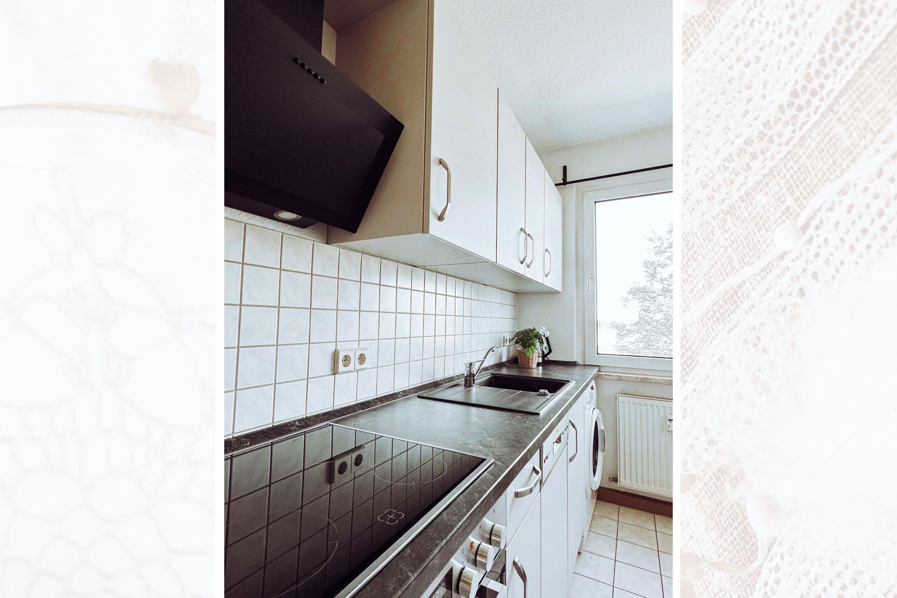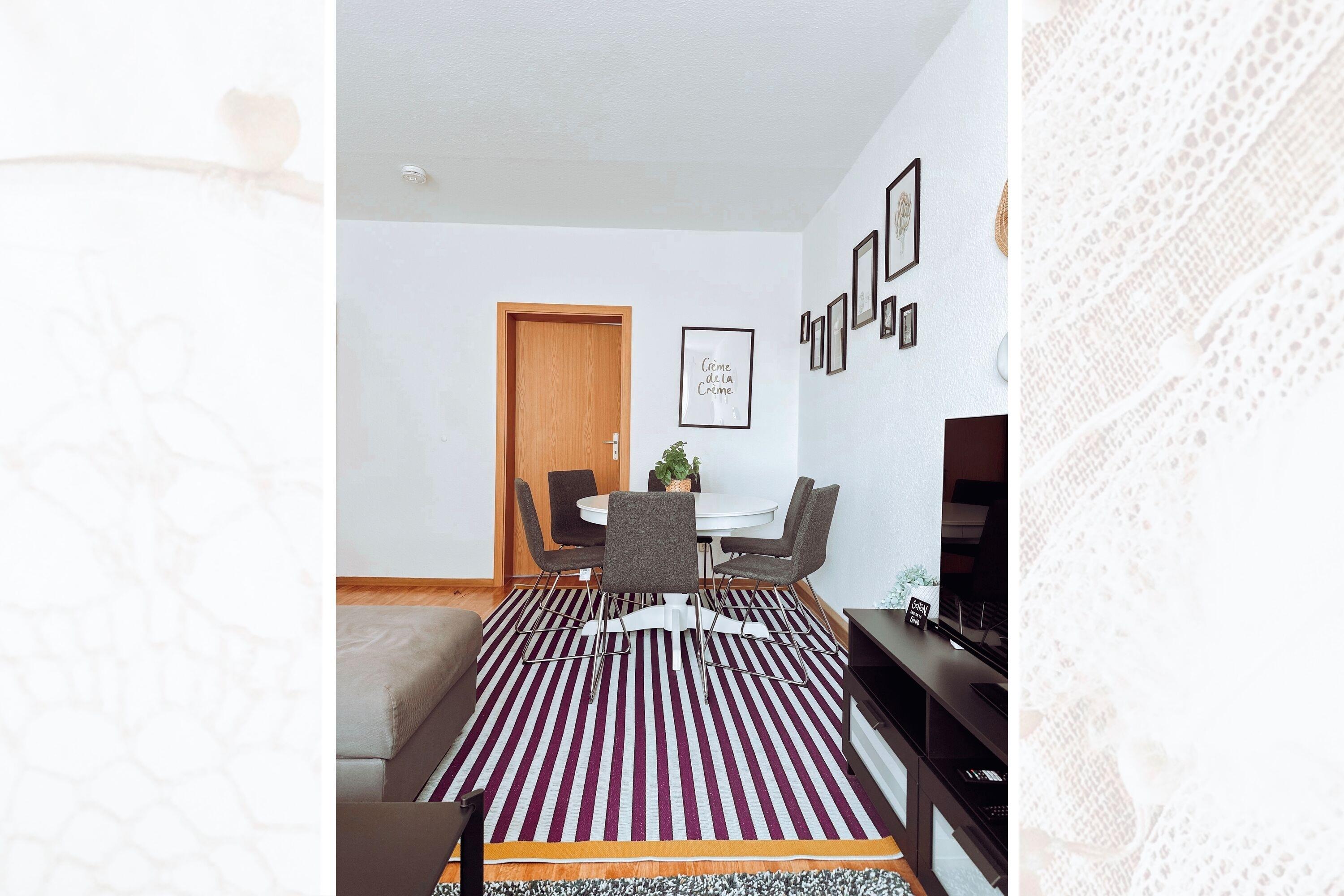 Die Ausstattung des Apartments umfasst ein gemütlichen Wohnzimmer mit einem großen Esstisch für gemütliche Abende, einen Flachbild-TV, sowie einen Internetzugang via WLAN. Die Küche ist mit einer Kaffeemaschine (Filter), einem Toaster, einem Wasserkocher und einer Spülmaschine ausgestattet. Für längere Aufenthalte befinden sich auch ein Trockner und eine Waschmaschine in der Ferienunterkunft.
