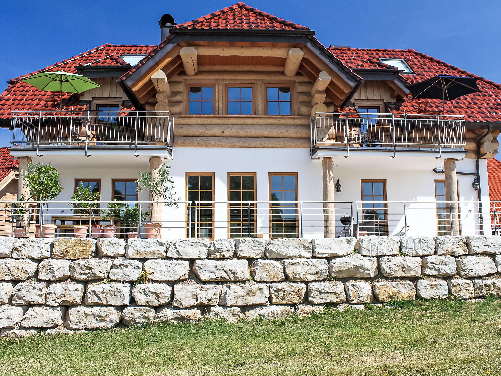 "Lärche", 5-room maisonette 150 m2 on 2 levels on 2nd floor. Stylish and wooden furniture furnishings: living/dining room with Scandinavian wood stove and satellite TV (flat screen). Exit to the balcony. 1 double bedroom. 1 room with 1 bed. Kitchen (oven, dishwasher, 4 ceramic glass hob hotplates, electric coffee machine). Sep. WC, bath/shower/WC. Top floor: 2 double bedrooms with sloping ceilings. Shower/WC. Heating. Balcony furniture. Very beautiful view of the countryside. Facilities: logs (free). Internet (WiFi, free). Please note: non-smokers only. Smoke alarm.