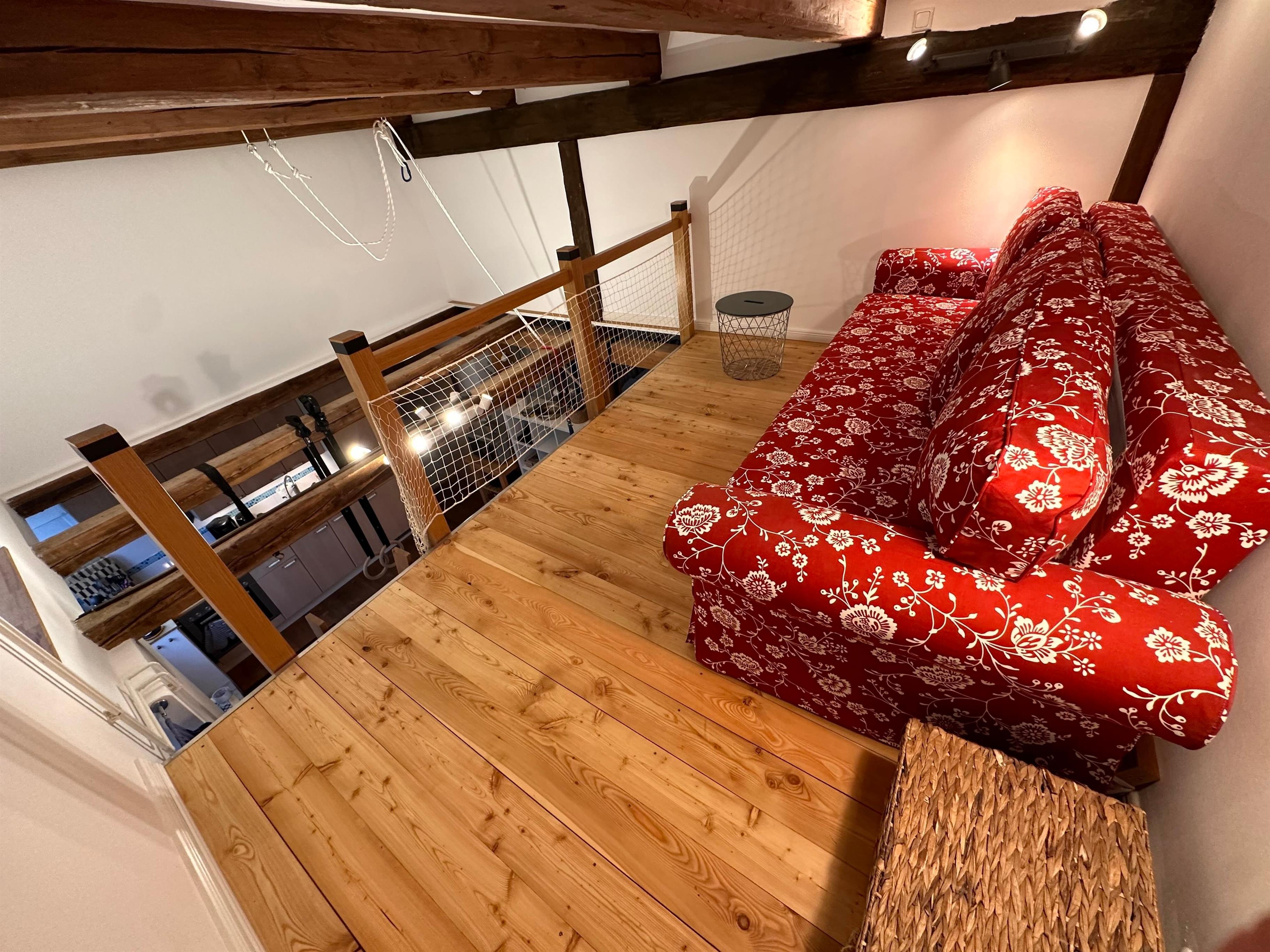 Neu: Wir haben über dem Esstisch eine Galerie eingebaut, die mit einem Schlafsofa und Schaukelstuhl zum Verweilen und Chillen einlädt.