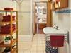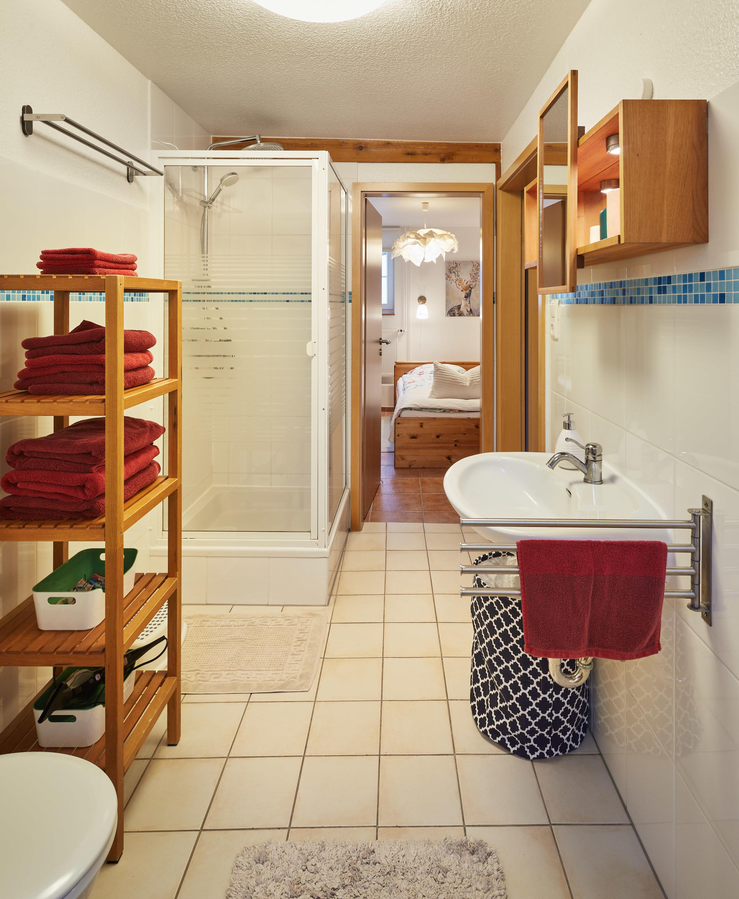 Das großzügige Duschbad ist mit Dusche, Klo, Waschbecken, Wäschekorb, Wäscheständer, Regal, Fön, Bügeleisen, Bügelbrett und Fußbodenheizung komfortabel gestaltet.