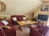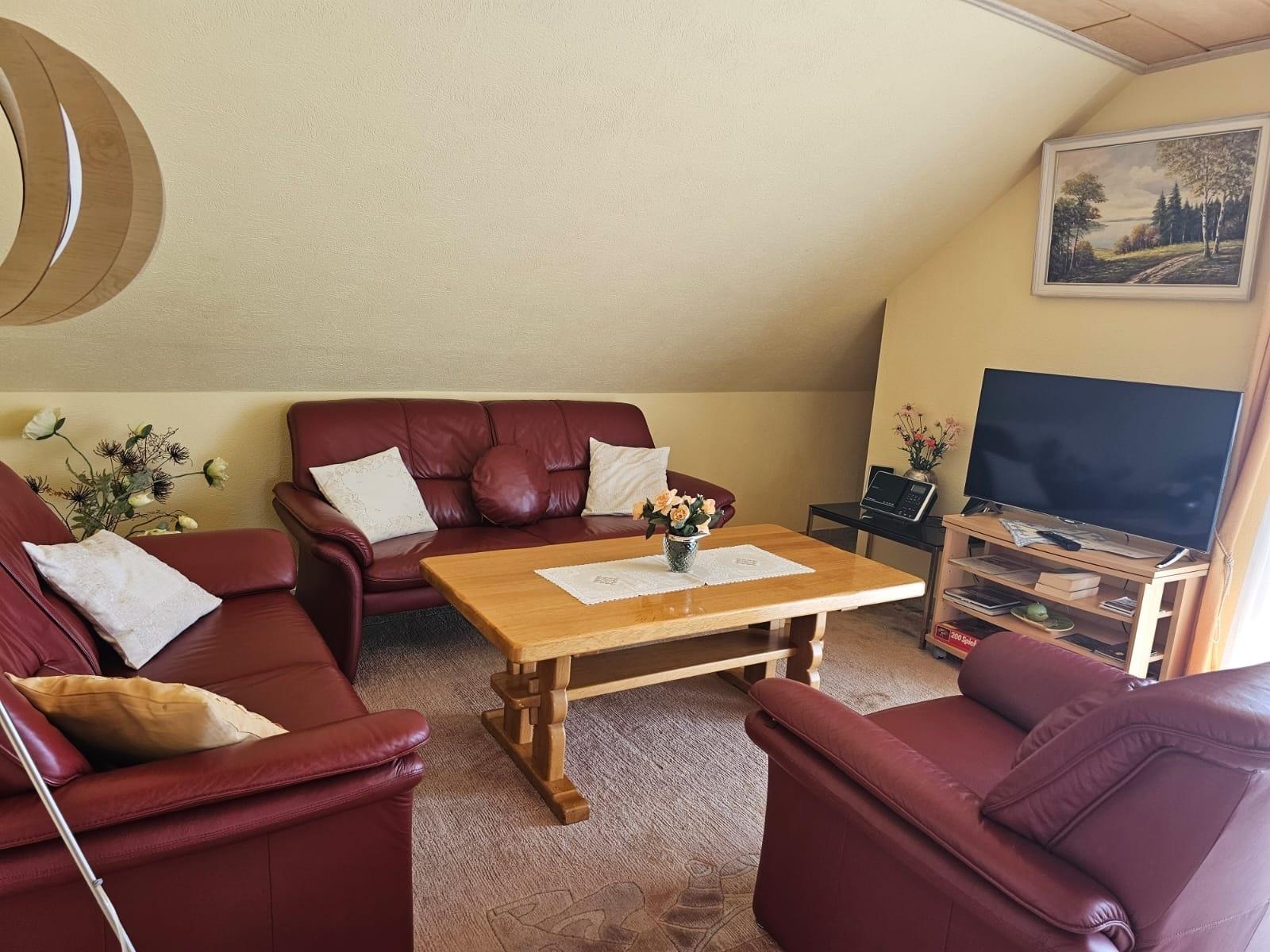 Der gemütliche Wohnraum mit seinen warmen Holztönen, der Dachschräge und den bequemen Ledersofas lädt zum Entspannen ein. Ein Flachbild-TV sorgt für Unterhaltung, während der benachbarte Essbereich mit massivem Holztisch Platz für gesellige Mahlzeiten bietet.