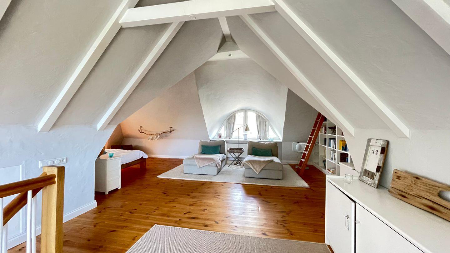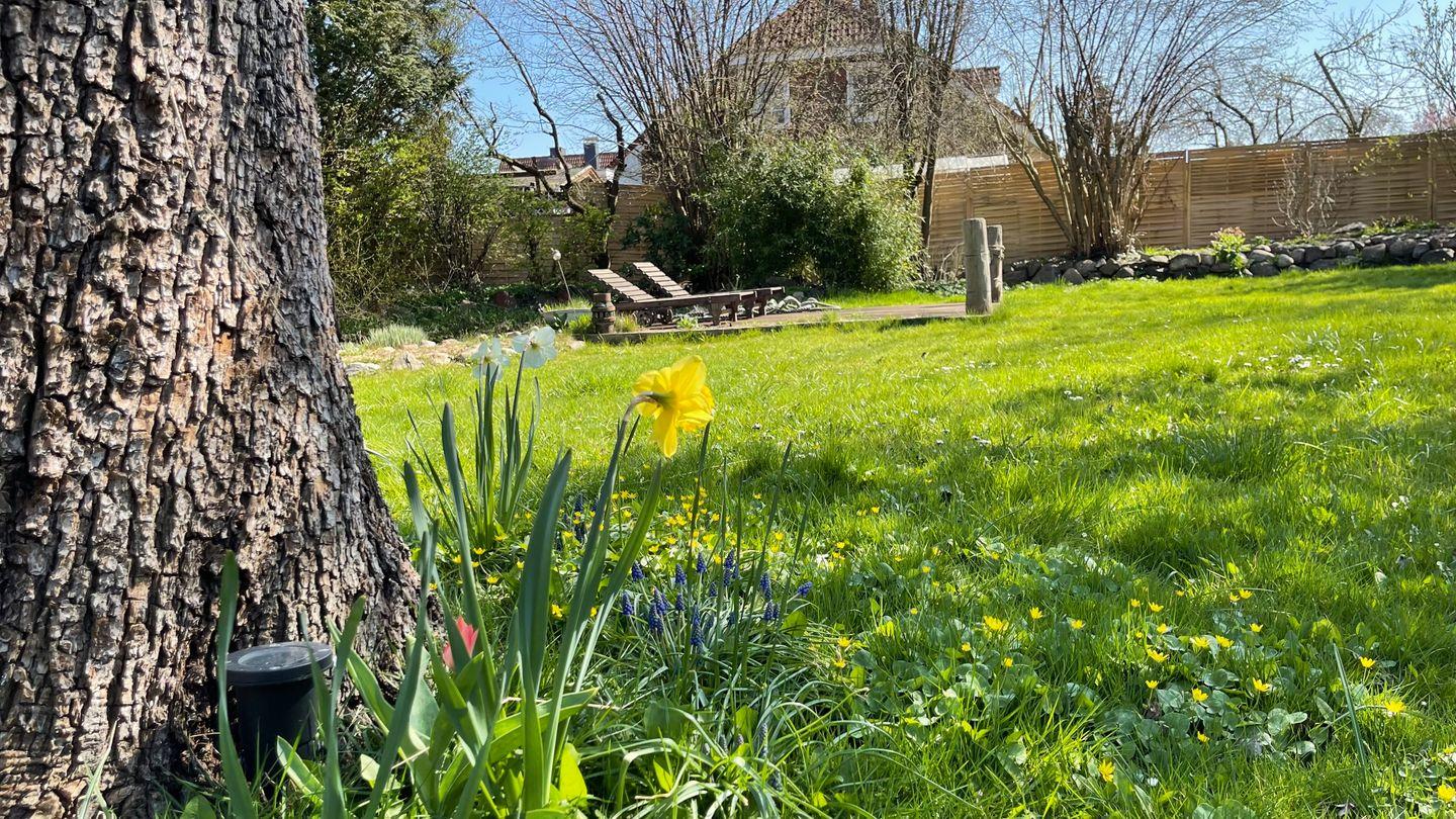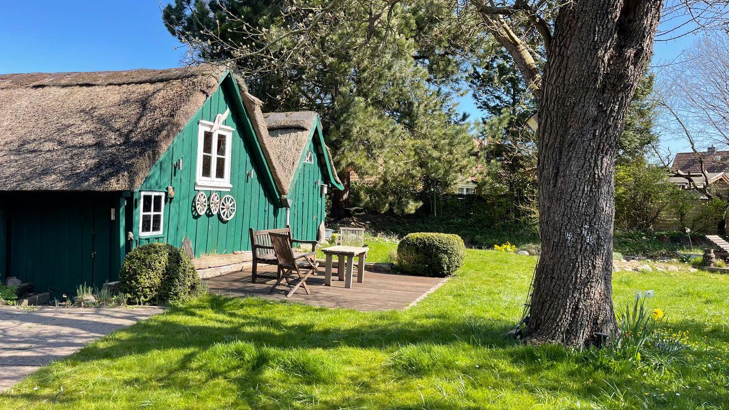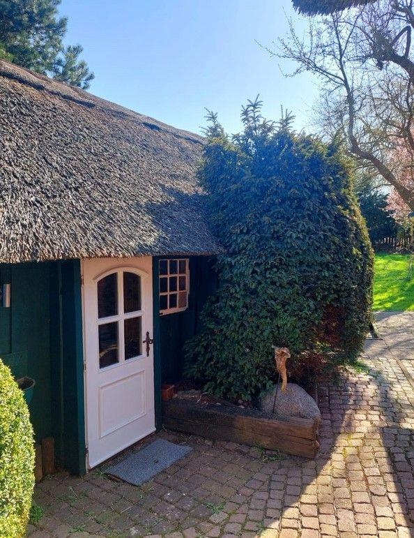 Der großzügige Gartenbereich bietet zu jeder Tageszeit Sitzgelegenheiten auf den 4 Terrassen, um die Sonne zu genießen. Der kleine, idyllische Gartenteich mit einer Wassertiefe von bis zu 50 cm ( nicht eingezäunt) fügt sich harmonisch in das Rasengrundstück ein. Gartenliegen laden zum Verweilen ein. Im reetgedeckten Außengebäude stehen Ihnen zusätzliche, abschließbare Abstellmöglichkeiten für Fahrräder usw. zur Verfügung. Ihre Autos dürfen Sie im Carport sicher unterstellen.