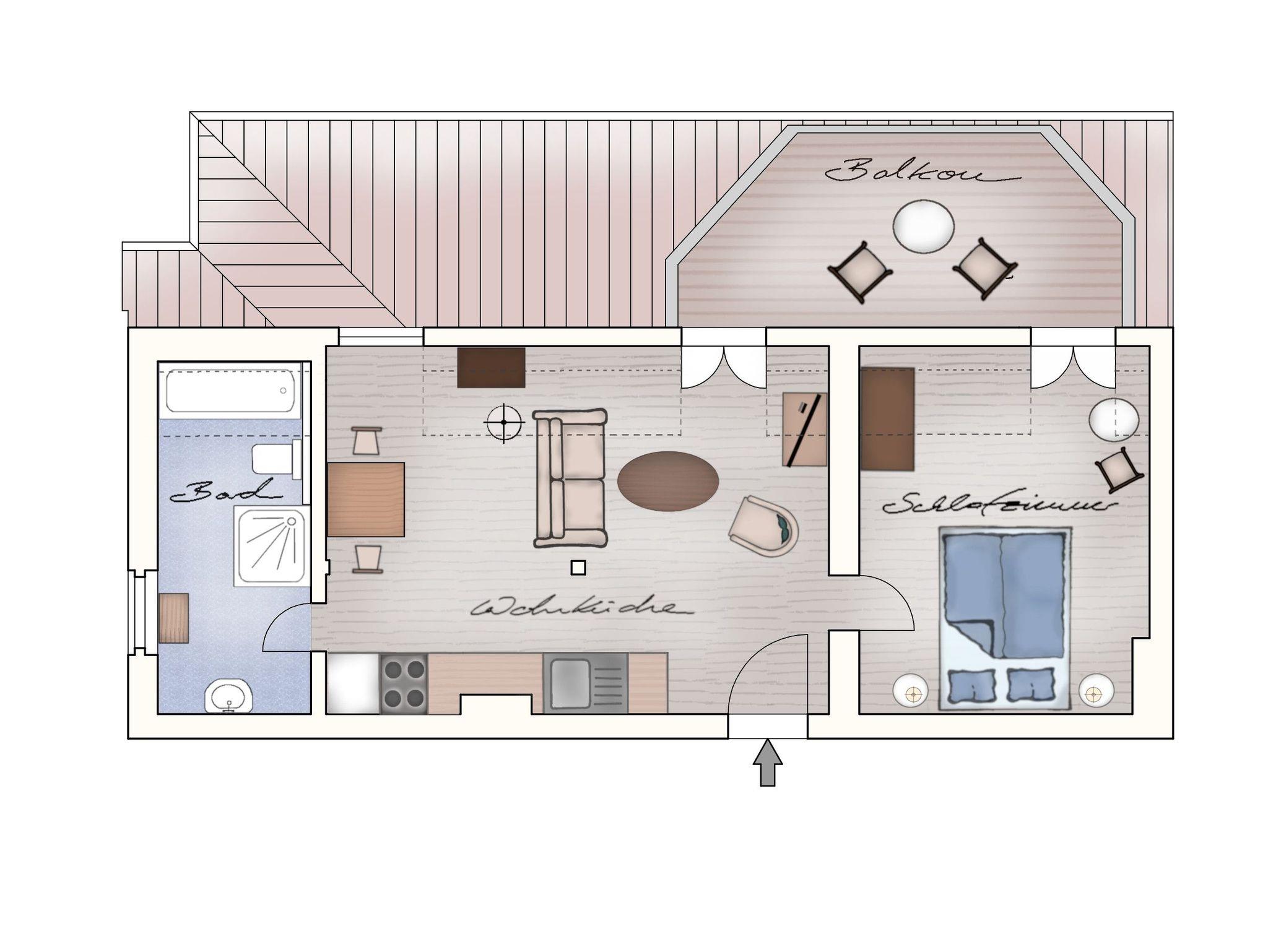 Die Ferienwohnung Nr. 6 befindet sich im zweiten Obergeschoss des Gutshauses. Die Wohnung für bis zu zwei Personen und in einer Größe von 54 m² ist hochwertig eingerichtet und besteht aus zwei Zimmern: Ein großes Wohnzimmer mit offener Küche (hochwertige Siemens-Geräte), ein großzügiges Schlafzimmer mit einem Doppelbett, einem großen Badezimmer mit Badewanne und Dusche. Die Böden der Ferienwohnung bestehen aus Eichen-Parkett. Vom Wohnzimmer und dem Balkon hat man einen sehr schönen Blick auf das Wasser und den Badesteg.